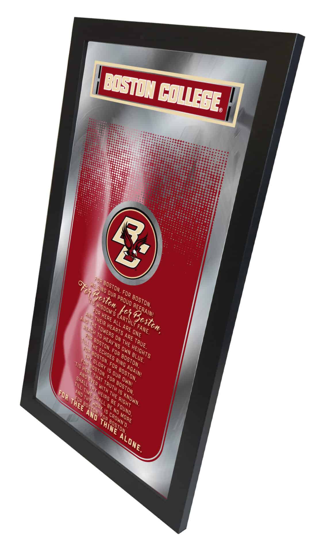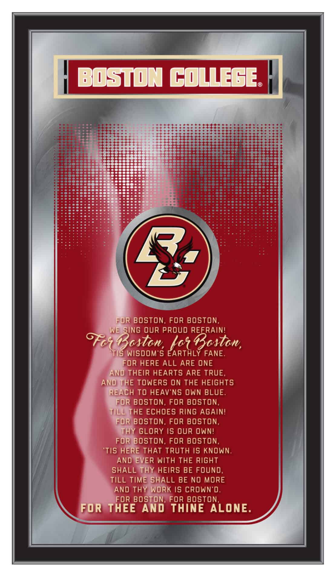 The Boston College 26×15 Fight Song Wall Mirror is the perfect way to showcase your school spirit. Featuring vibrant artwork that highlights your school’s logo and spirited verses, this mirror adds a touch of elegance to any space. The 1/8″ thick glass is complemented by mirrored accents, ensuring that colors pop beautifully. With a sleek black, wrapped wood frame and convenient saw-tooth hangers, this mirror is easy to display in your office, garage, or any room in your home. Whether you’re treating yourself or looking for a gift for a recent graduate or sports enthusiast, this mirror is a stylish and meaningful choice.