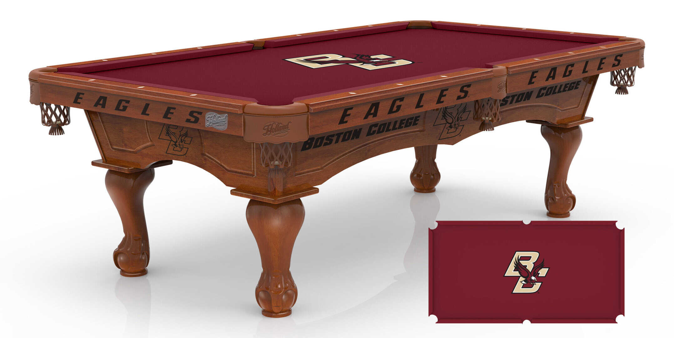 The Boston College Pool Table with Chardonnay Finish and Claw Leg is a professional-quality pool table that combines elegance, durability, and precision. Designed for serious players and enthusiasts, this table features a stunning Chardonnay finish that complements any room setting. The double-arch cabinet is beautifully CNC routed to highlight laser-engraved logo art elements, while the classic hand-carved ball and claw legs provide timeless sophistication. Its superior construction and premium materials ensure an exceptional playing experience.