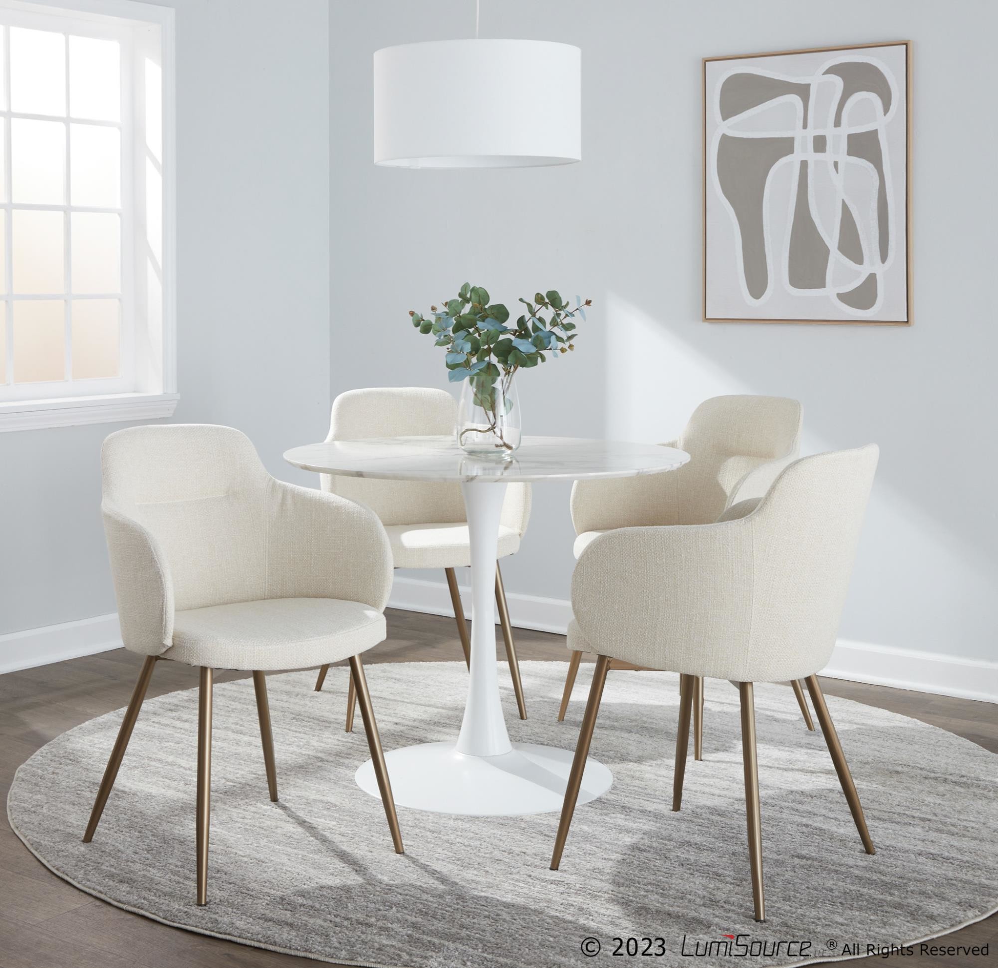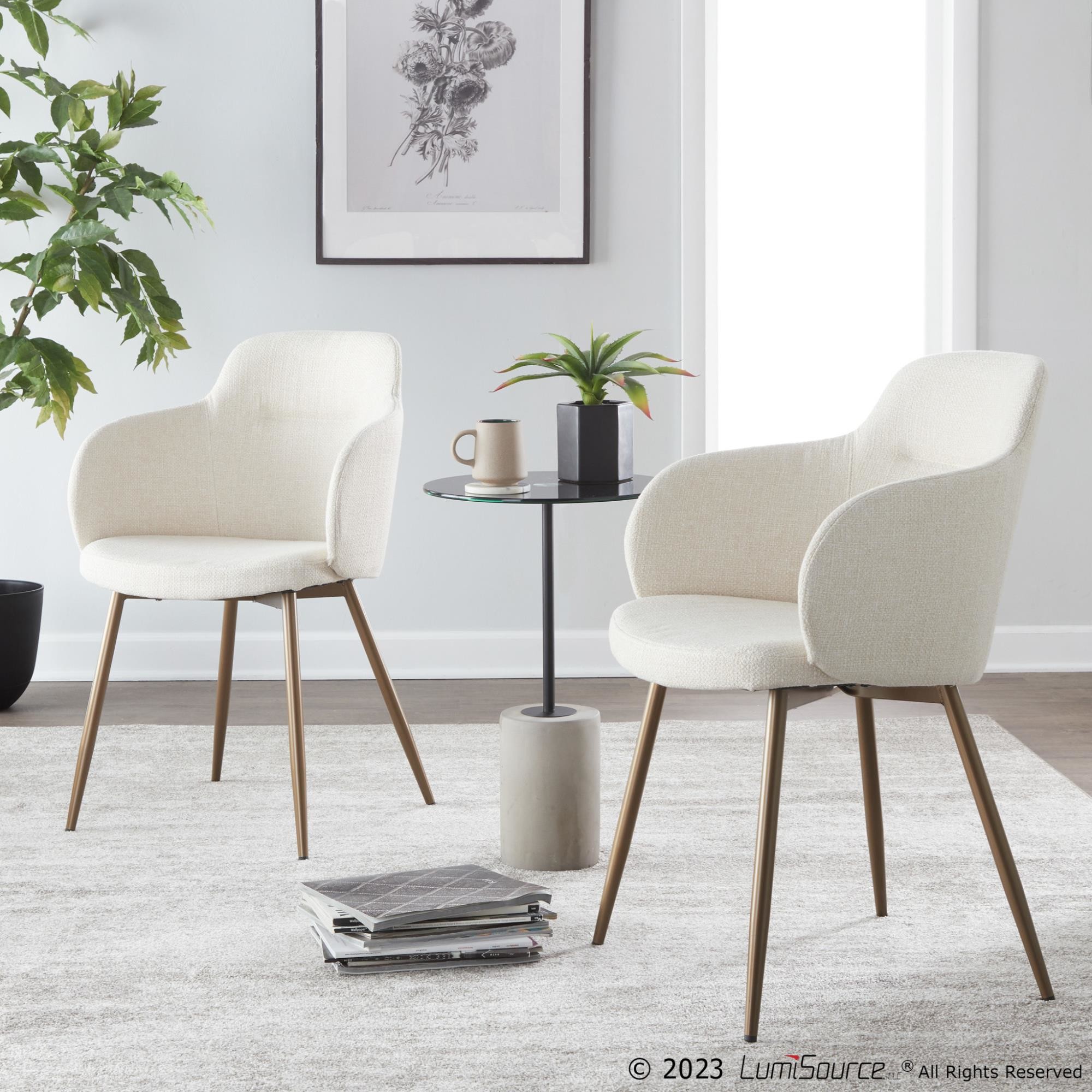 These chairs are upholstered in stylish fabric and offer a padded seat for added comfort. The sturdy metal legs feature an antique copper finish, adding to their contemporary charm. This set includes two chairs, making it easy to create a cohesive look in your space.