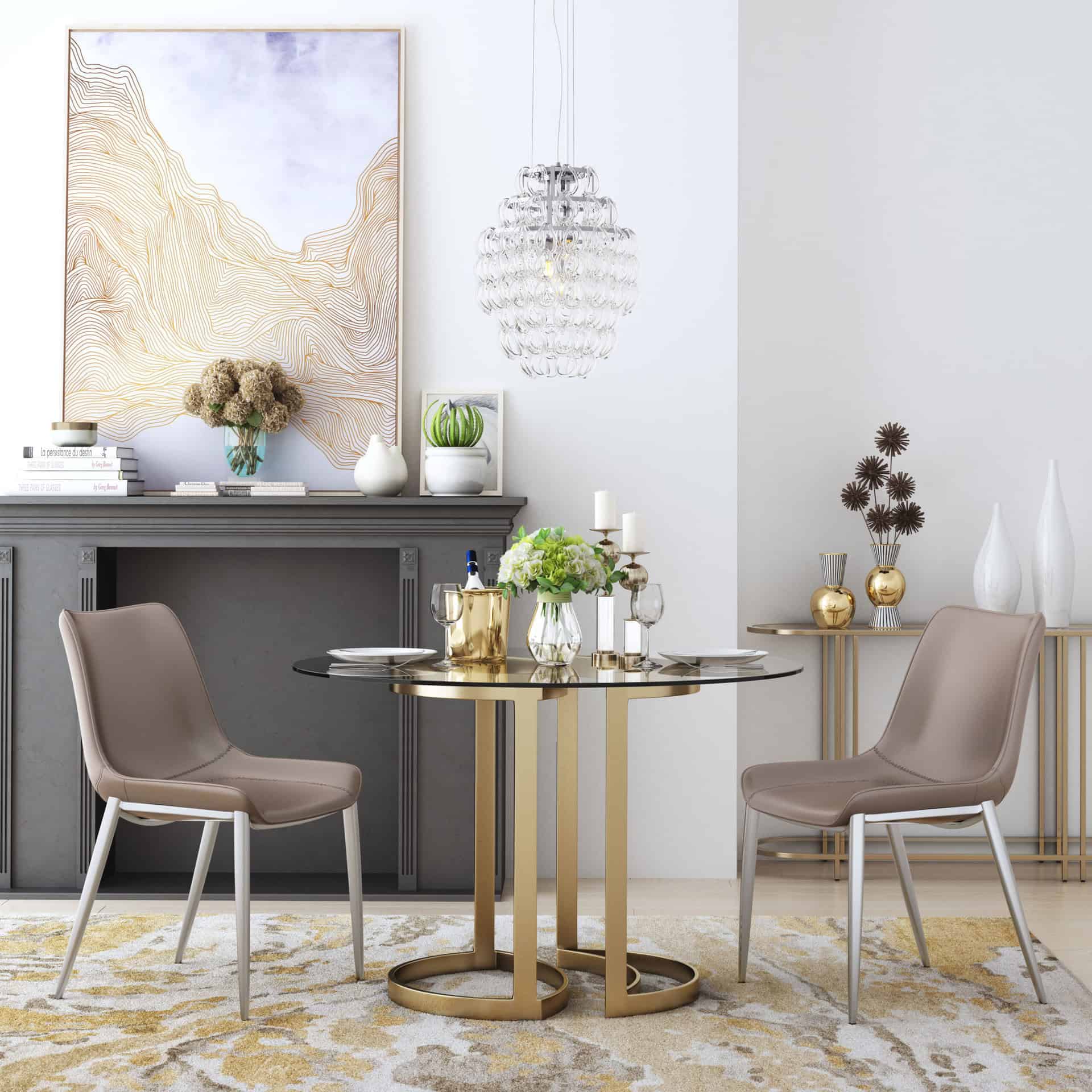 This armless contoured chair with its simple silhouette can elevate your dining room or keep it casual. Featuring a beautifully stitched design in brown faux leather, this chair pays attention to detail while offering comfort that extends to use as a desk chair. The brushed stainless steel legs add a sleek modern touch, and protective rubber feet ensure your floors remain scratch-free.
