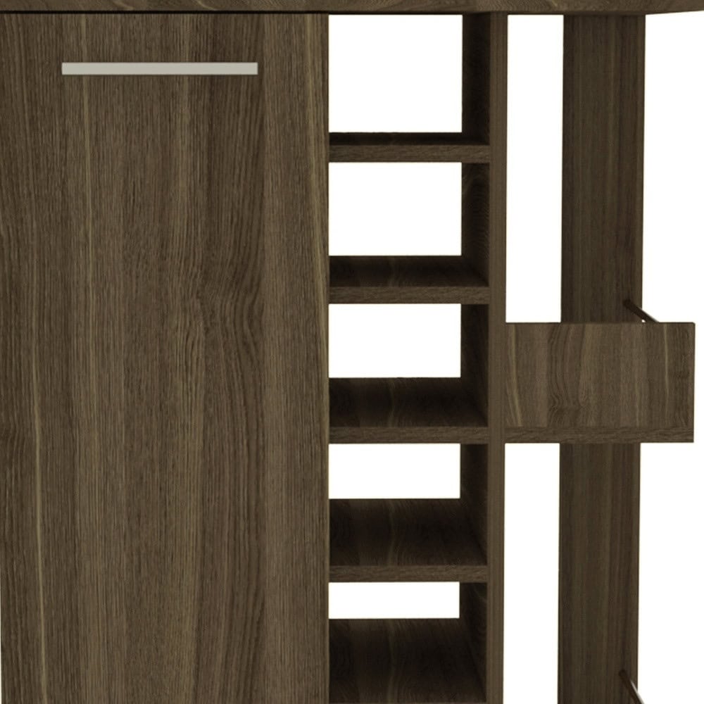 This brown rolling bar cart with wine storage is the perfect addition to your contemporary home decor. With its stylish design and functional features, it will elevate your entertaining experience. The freestanding cart includes a display stand, cabinets, and shelves for organized storage. Crafted from durable particle board, it boasts a sturdy frame and top made of manufactured wood with a laminate finish in a beautiful brown color. The cart is equipped with wheels for easy mobility, allowing you to effortlessly move it around your space. It also features built-in cabinets, providing ample space to store your favorite wines, with a capacity to hold up to 6 bottles. Embrace convenience and sophistication with this elegant bar cart.