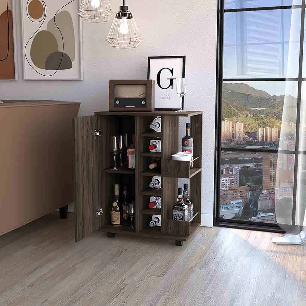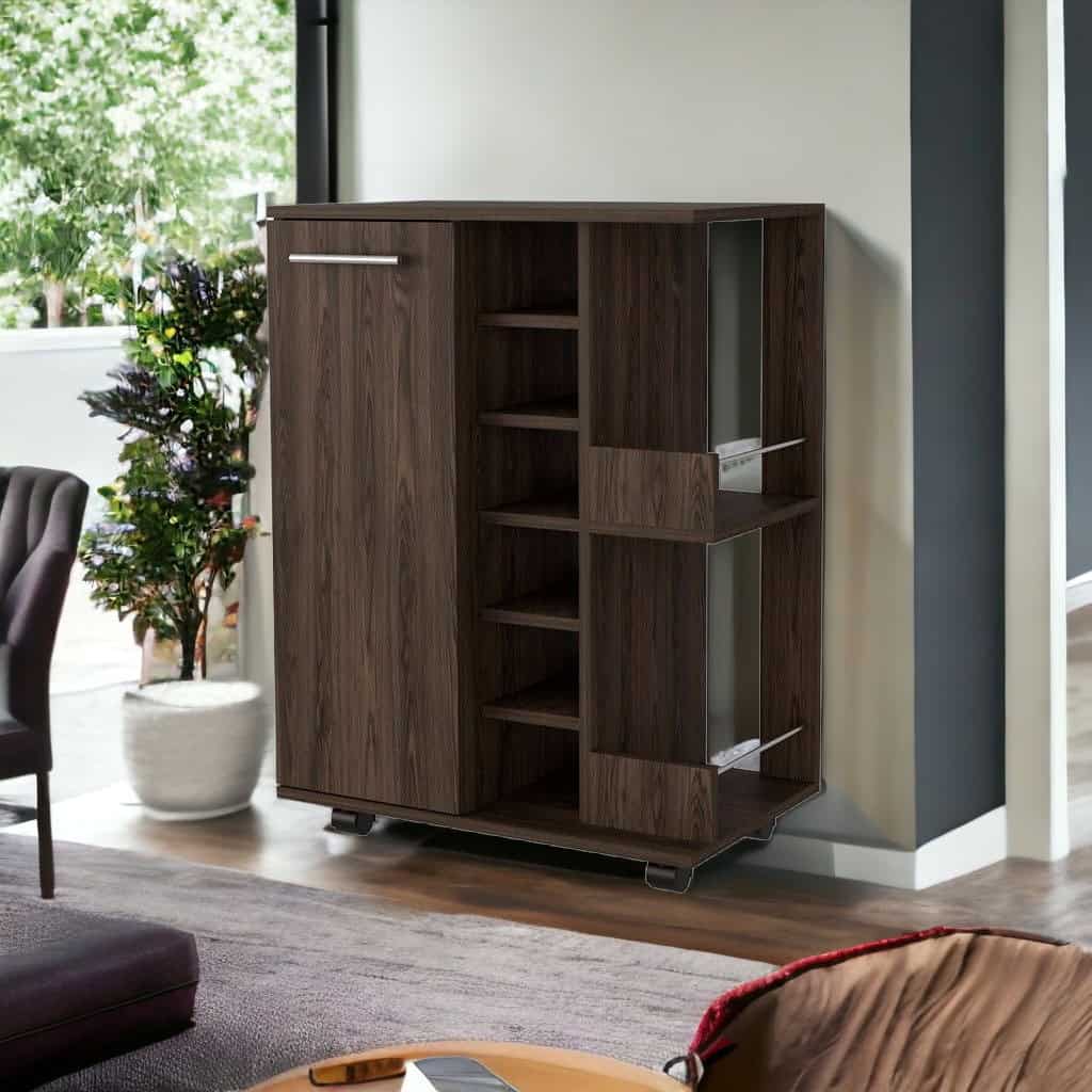 A stylish and functional addition to any home, the Brown Rolling Bar Cart With Wine Storage and Cabinets combines modern design with practicality. Constructed from durable manufactured wood, this bar cart is built to last while adding a touch of warmth and sophistication to your space with its rich brown finish. The cart features a rectangular design that provides ample space for showcasing your favorite liquor bottles, glassware, and other bar essentials. It includes cabinets for concealed storage and is equipped with smooth-rolling wheels for easy mobility, making it perfect for entertaining in any room. The built-in wine rack holds up to 6 bottles, ensuring your collection is both stylishly displayed and easily accessible. Whether you’re a wine enthusiast or a cocktail lover, this versatile bar cart is a must-have for your home.