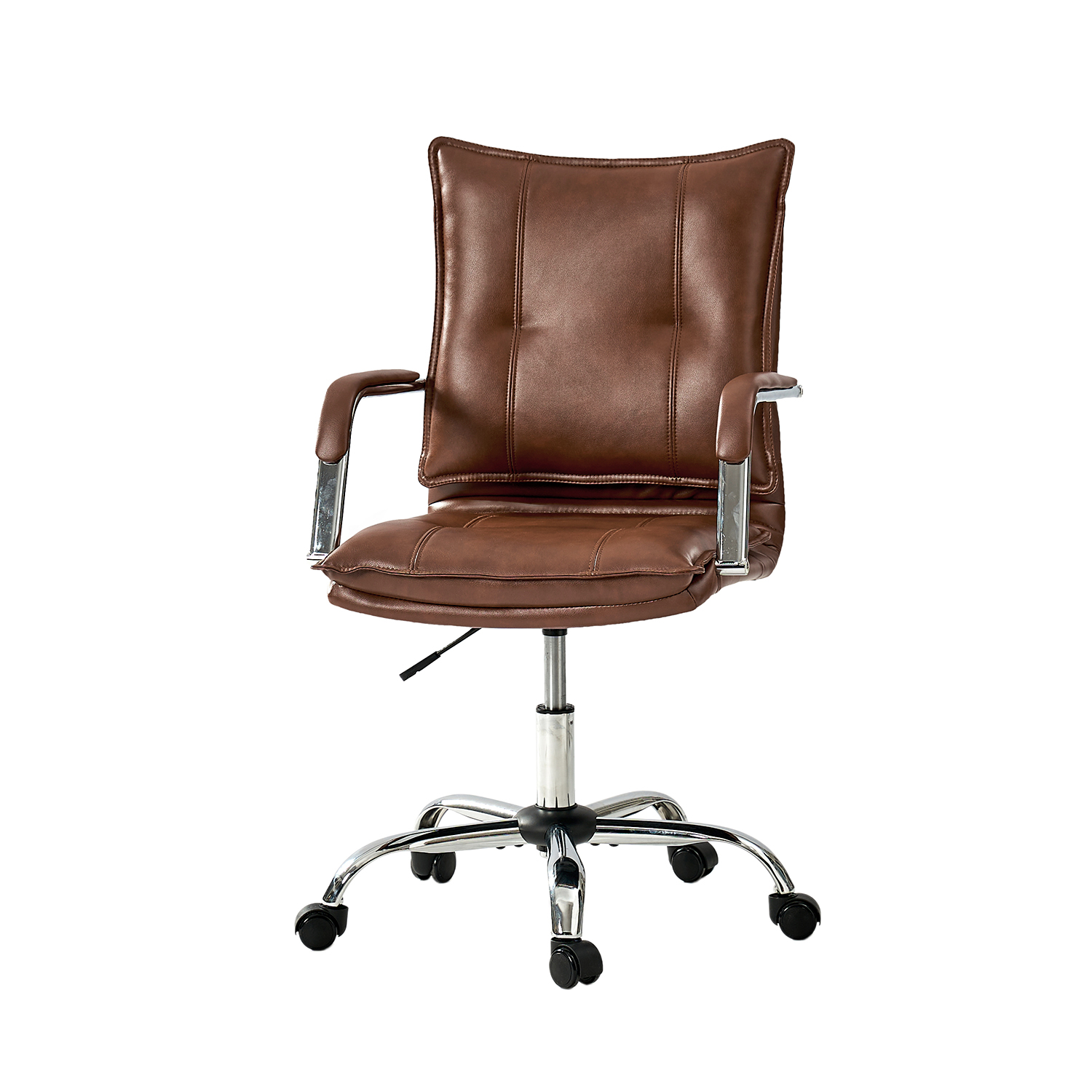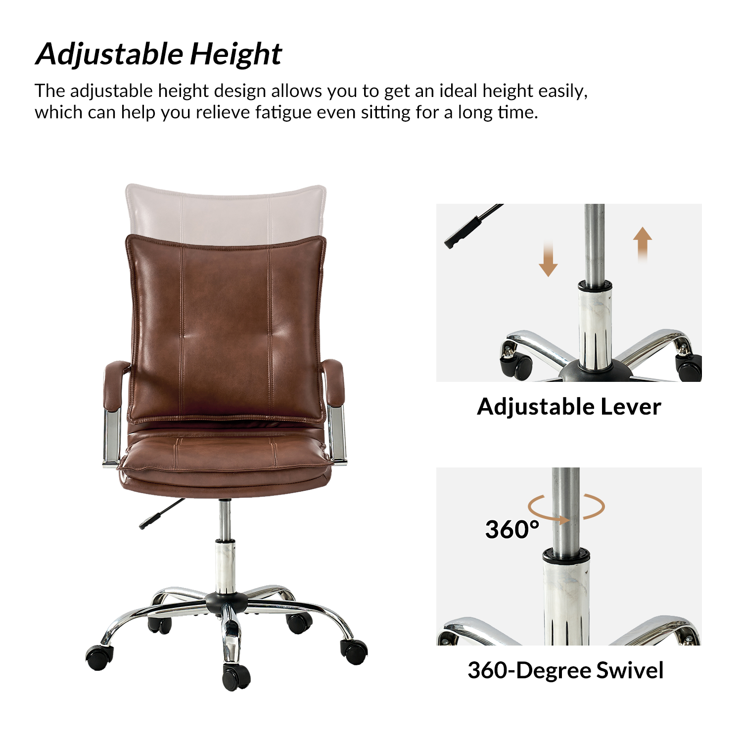 This task chair brings modern comfort to your workspace. Featuring a sleek vegan leather exterior, it offers a contemporary look and feel. Enjoy enhanced comfort with padded arms and ergonomic support from the tufted backrest. The sturdy metal base, complete with five casters, ensures stability and smooth mobility, while the 360-degree swivel seat allows you to move freely. Customize your seating experience with the adjustable height feature.