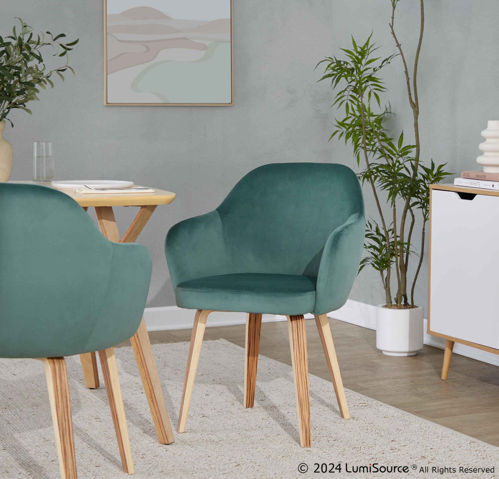 The Buena Zebra Wood Green Velvet Contemporary Dining Chairs are a versatile seating solution that will elevate any room! These chairs seamlessly blend comfort and style with plush velvet upholstery and sturdy bent wood legs. Use them in your dining room, as accent pieces in your living room, or as statement chairs in your home office.