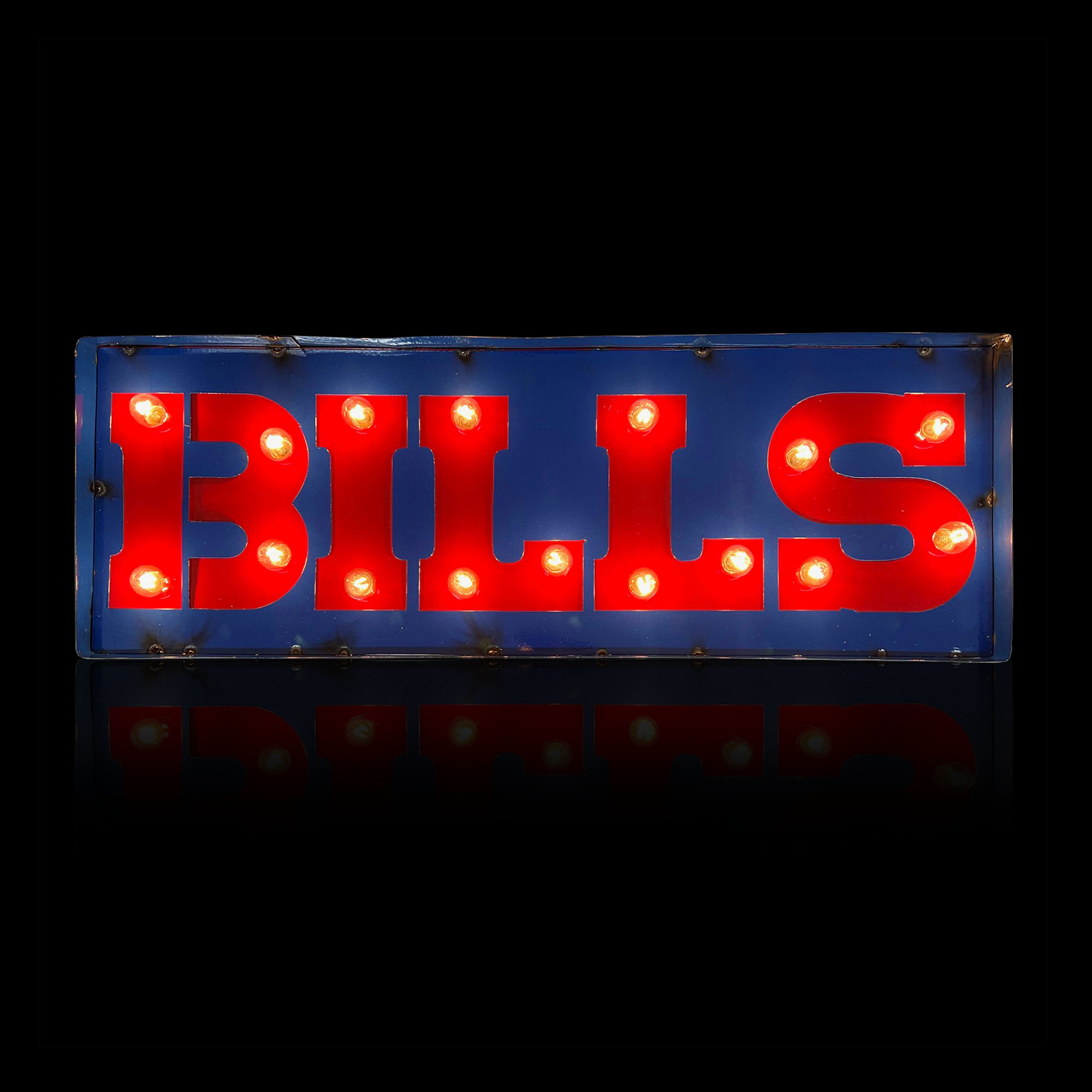 Elevate your fan cave, office, or home with this Buffalo Bills Lighted Recycled Metal Street Sign. Perfect for both indoor and outdoor display, this handcrafted sign is constructed from recycled metals, featuring laser-cut lettering with layered steel and exposed weld spots for a unique, retro aesthetic. The included light strands, adorned with clear, incandescent C7 glass bulbs, add a warm and inviting glow to any space. Officially licensed by the NFL, this authentic piece of décor showcases your team pride in style.