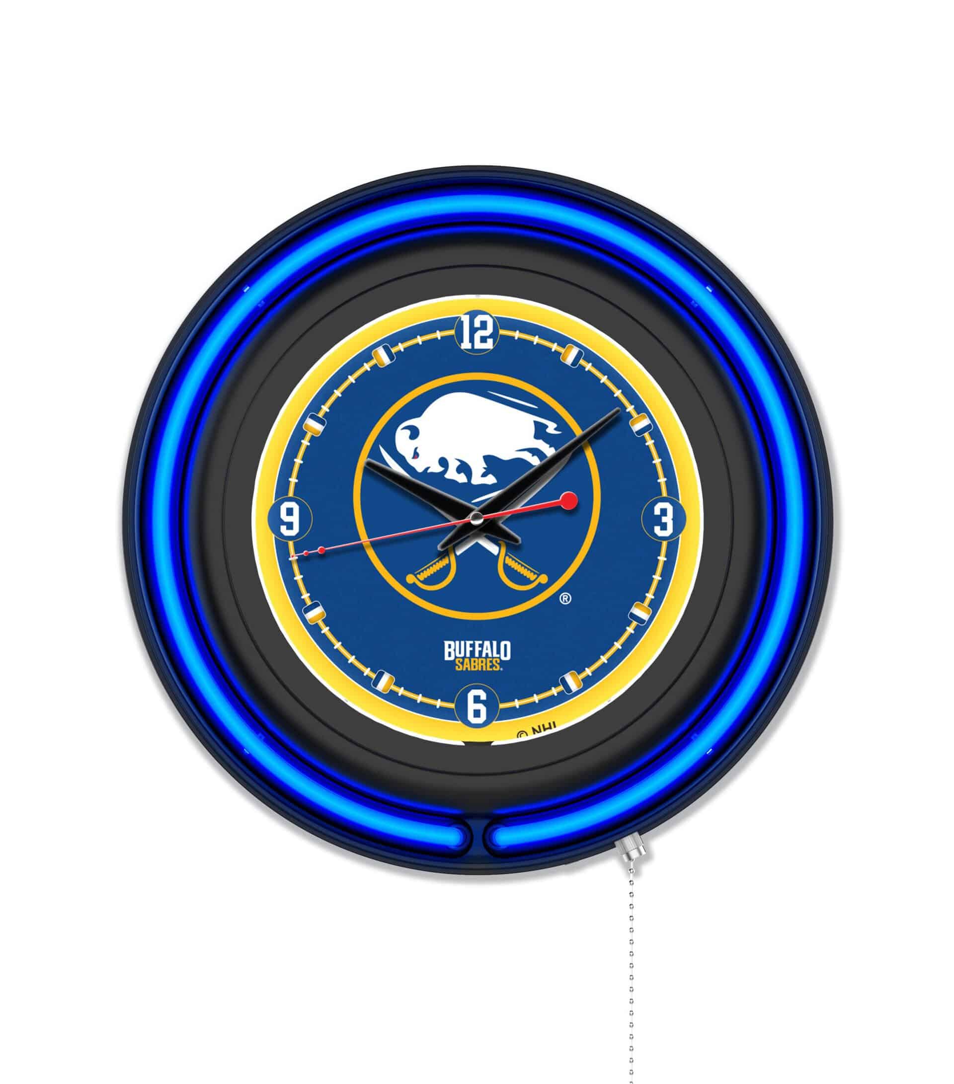 The Buffalo Sabres 15-Inch Neon Logo Clock in Black is the ideal addition to any sports fan’s man cave. This stylish clock features a sleek black casing with vibrant, full-color artwork that showcases your team pride. The double neon tubes, one in a team-specific accent color and a brilliant white for illumination, light up the custom printed clock face, making it a striking focal point. A convenient pull chain at the bottom allows for easy on/off operation of the neon lights, while the accurate quartz movement ensures you always keep perfect time, powered by a single AA battery (not included).