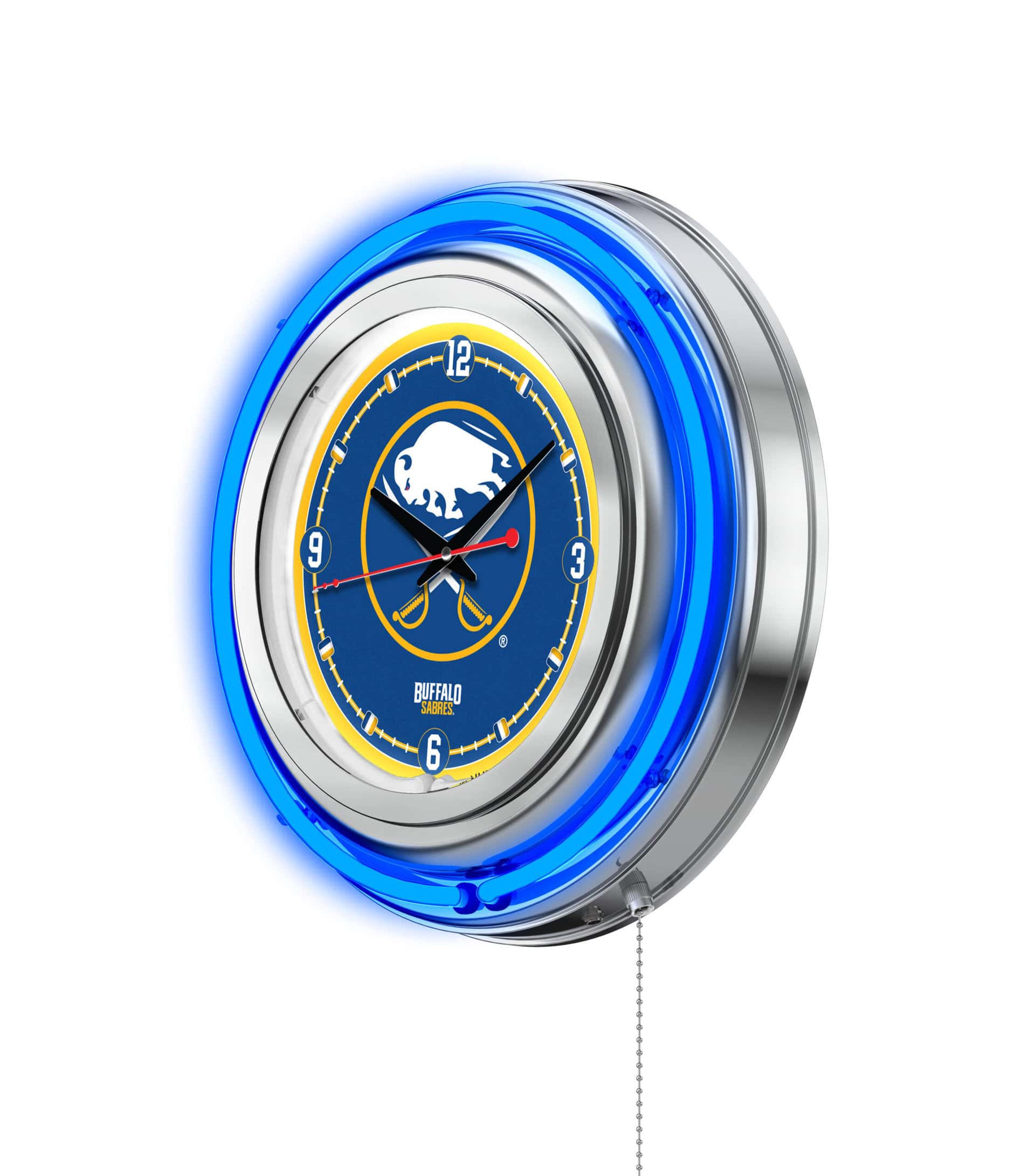 The Buffalo Sabres 15-Inch Neon Logo Clock in Chrome is the ultimate statement piece for any sports enthusiast’s space. With its striking chrome casing and vibrant neon accents, this clock not only keeps time but also showcases your team pride. The clock features a custom printed face illuminated by a brilliant white inner neon ring, ensuring visibility and style. Its unique pull chain allows for easy operation, turning the neon lights on and off effortlessly. Powered by a standard 120V outlet, this clock combines functionality with a sporty flair, making it a perfect gift for fans or a fantastic addition to your own collection.