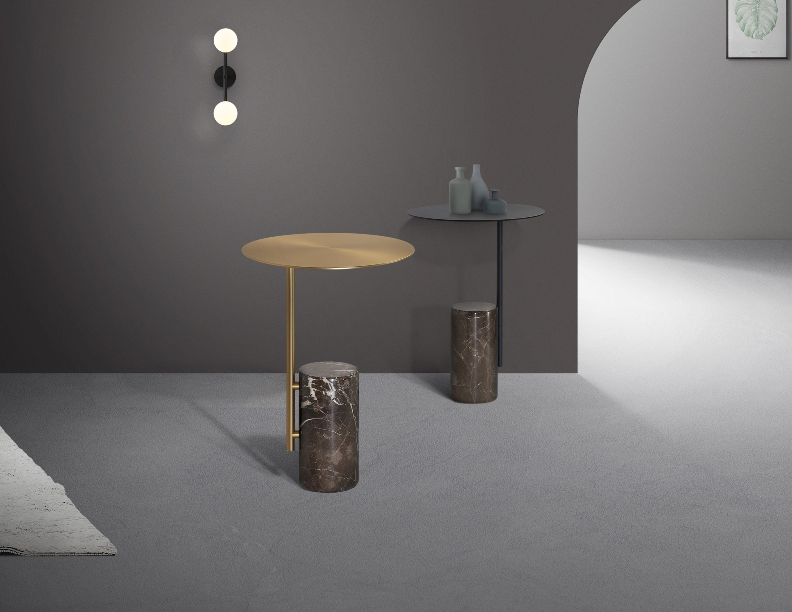 This end table boasts a unique offset post detail and a sleek steel top, adding a touch of modern elegance to any living space. The solid marble cylinder base provides stability and a luxurious feel. Perfect for completing your man cave decor, this table combines style and functionality.