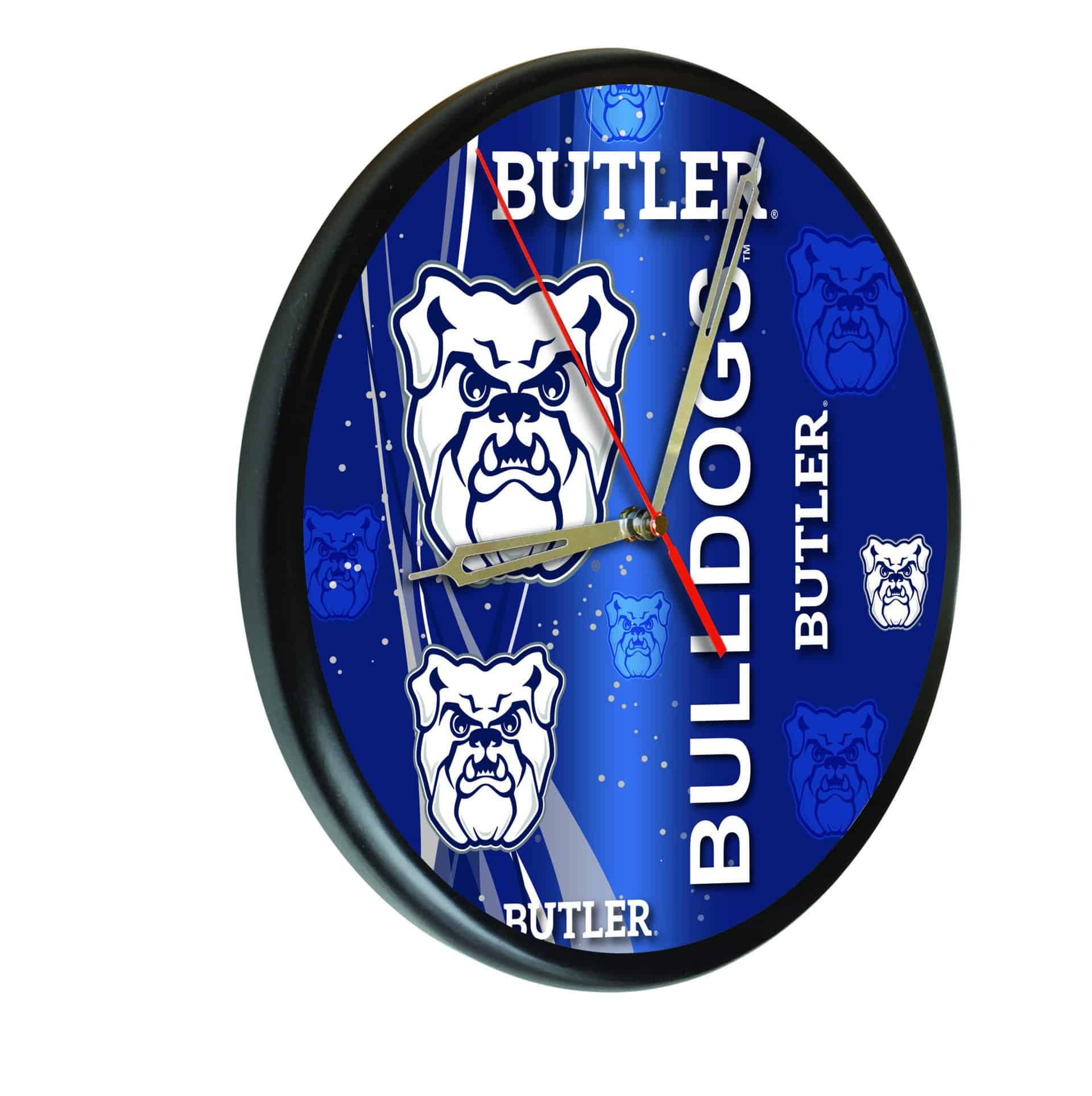 The Butler University 13-Inch Solid Wood Clock in Black is a stylish and functional addition to any man cave. Showcasing your school pride, this officially licensed clock features vibrant, first surface, digitally printed graphics that are designed to last, thanks to UV inks that resist fading. The accurate quartz movement ensures precise timekeeping and is powered by a single AA battery (not included). With a recessed keyhole hanger, the clock hangs flat against the wall, providing a sleek and polished appearance. Perfect as a gift for graduates, sports enthusiasts, or for personal use, this clock combines quality craftsmanship with a modern design.