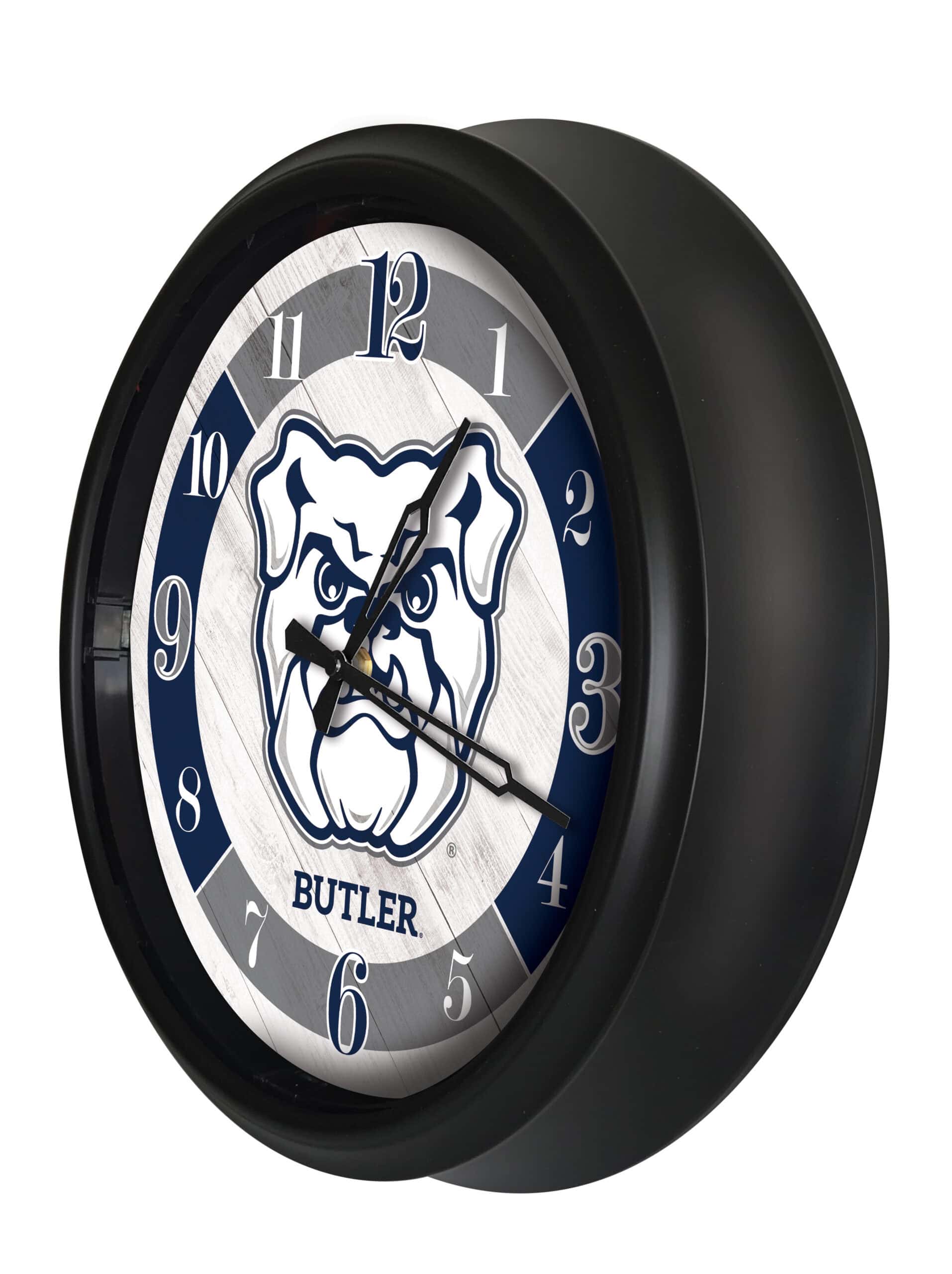 The Butler University 14-Inch Indoor/Outdoor LED Wall Clock in Black is the perfect addition for any fan looking to showcase their school pride. With its durable construction and vibrant artwork, this clock is designed to withstand the elements while providing reliable timekeeping. The clock features a weather-resistant casing made of UV resistant black ABS plastic and a sealed glass face lens, ensuring that it remains functional and attractive in both indoor and outdoor settings. Equipped with photo eye-controlled LED lights, the clock automatically illuminates in low-light conditions, making it easy to read at any time of day. Enjoy the vivid colors and sharp details thanks to the UV printed artwork, ensuring years of fade-free display.
