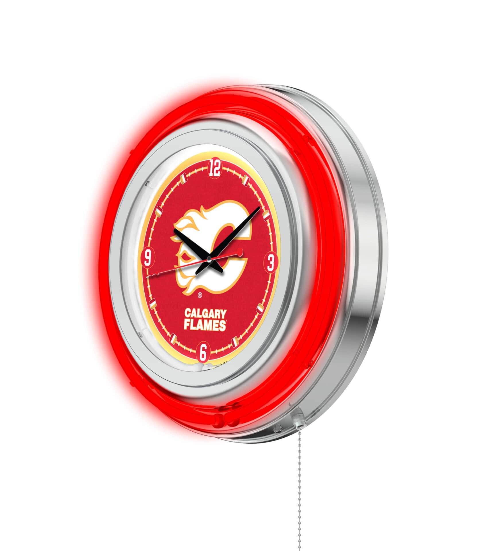 The Calgary Flames 15-Inch Neon Logo Clock in Chrome is the ultimate addition to any fan’s man cave. With its striking chrome casing and vibrant neon rings, this clock not only keeps you on time but also showcases your team pride in style. The custom printed clock face is illuminated by a brilliant white inner neon ring, making it a standout piece in any room. Featuring easy ON/OFF functionality with a pull chain and powered by a UL Listed transformer, this clock blends practicality with bold team spirit.