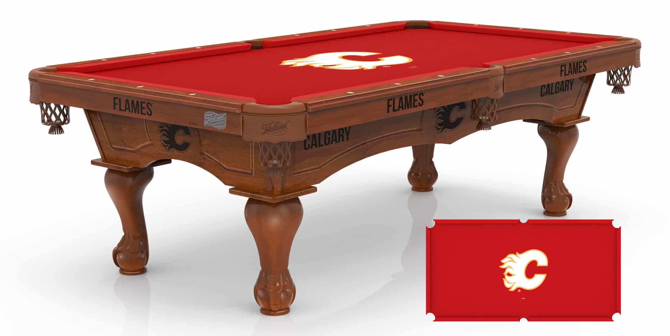 The Calgary Flames Pool Table with Chardonnay Finish and Claw Leg is a premium-quality pool table designed to elevate any game room or man cave. Featuring a solid double-arched cabinet with intricate CNC routing, this table showcases laser-engraved logo art for a striking aesthetic. The meticulously crafted Chardonnay finish complements most room settings, while hand-carved Ball & Claw legs provide timeless elegance.