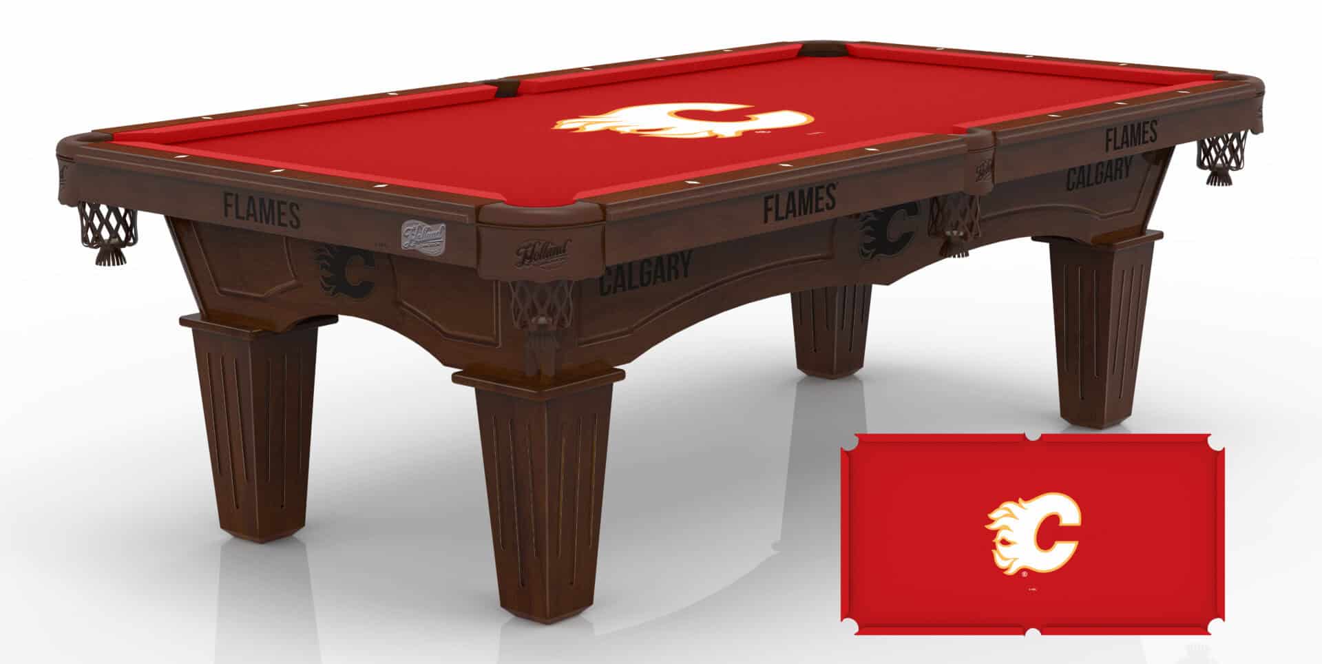 The Calgary Flames Pool Table with Navajo Finish and Tapered Leg is a premium-quality pool table designed to elevate your game room or man cave. This table combines superior craftsmanship with elegant design, featuring a double-arch cabinet with CNC routing that highlights laser-engraved logo art elements. The beautiful Navajo finish complements various room settings, while the tapered, hand-carved legs add a timeless appeal. The play surface is covered with Hainsworth worsted cloth, renowned for its smooth, consistent ball play and durability. The embossed leather pockets and diamond pearl sites deliver both style and precision for a professional playing experience.