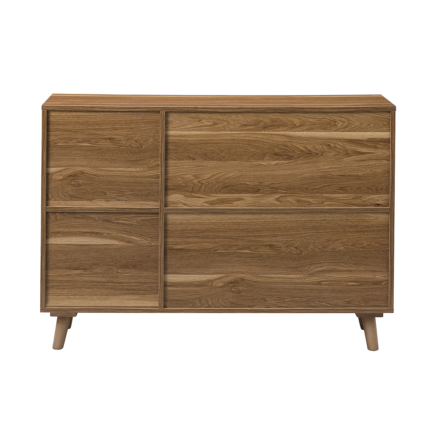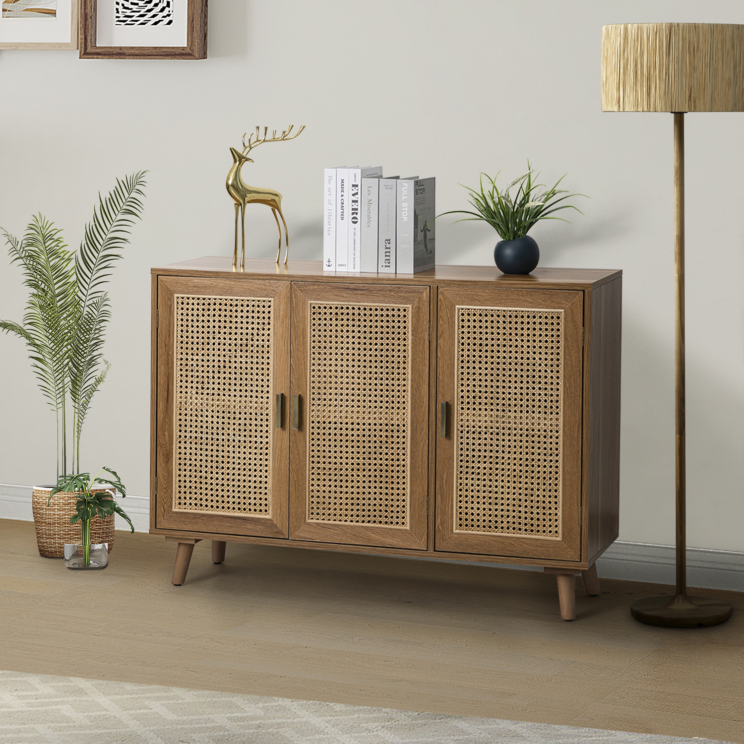Behind the three rattan doors, you’ll find a hidden storage area with two spacious shelves, ideal for sorting and organizing your belongings. The retro metal bar pulls add a touch of elegance, while the solid and manufactured wood frame ensures long-lasting stability and durability. Its simple design and charming style effortlessly complement any decor.