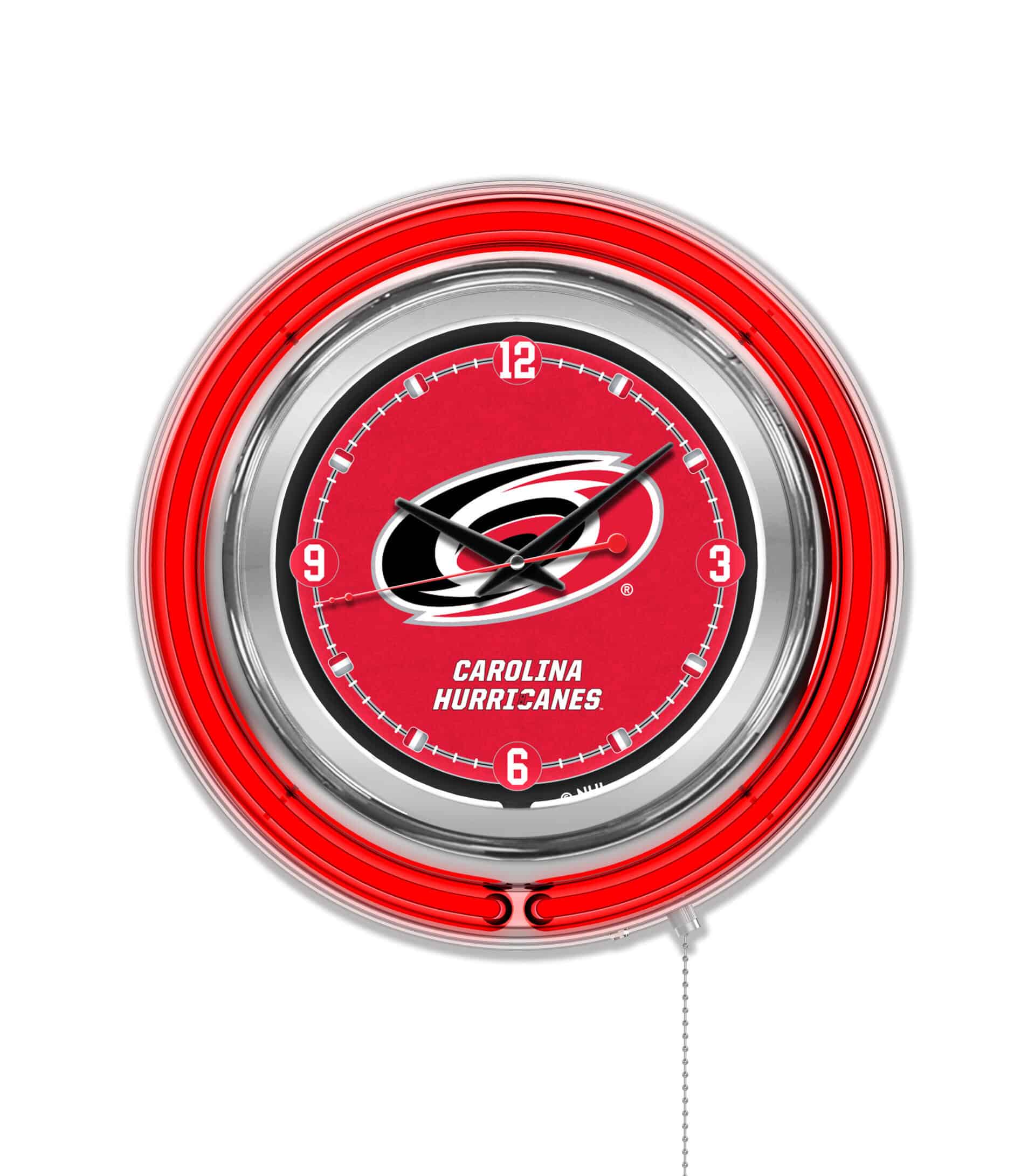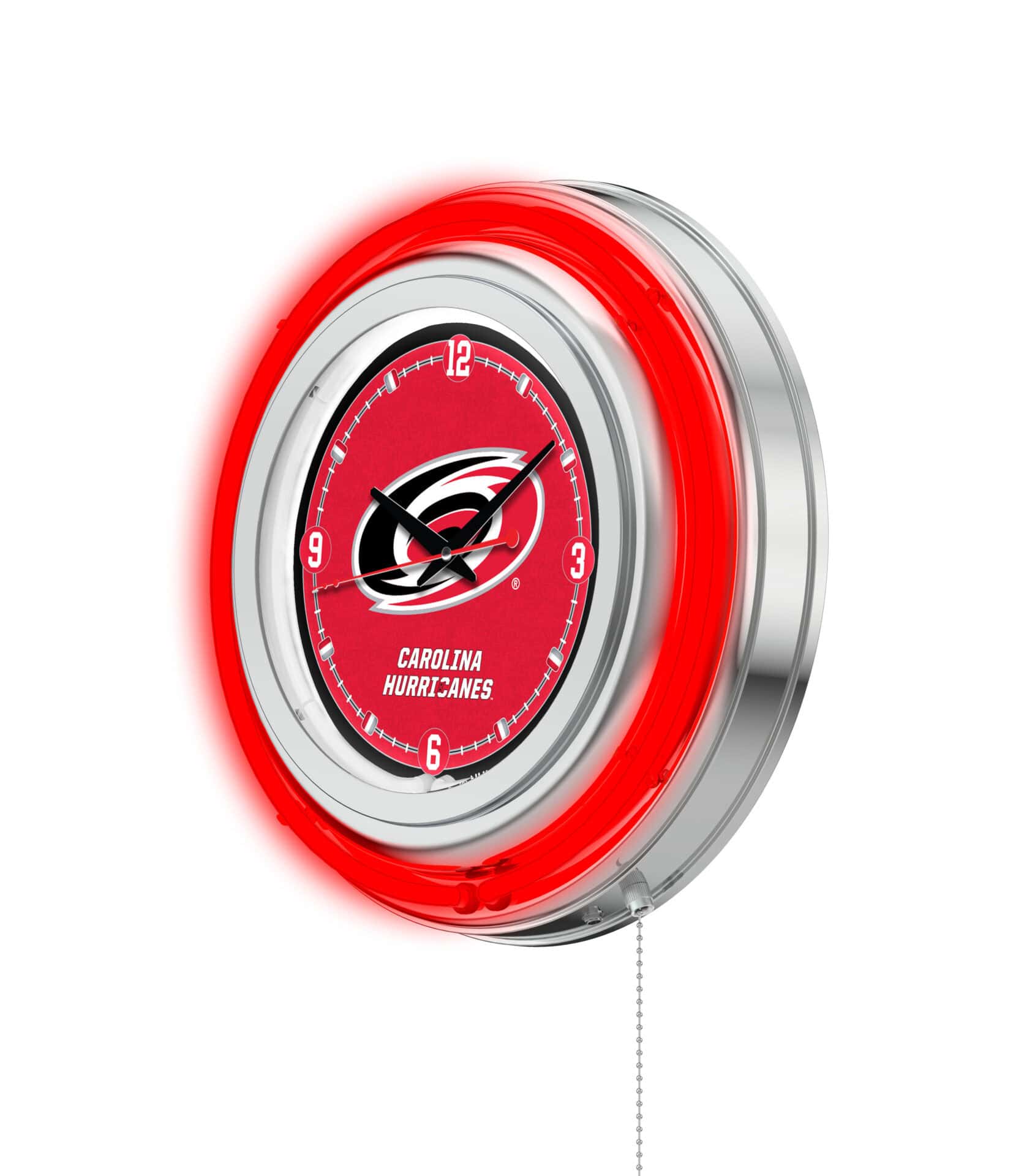 Enhance your man cave with the Carolina Hurricanes 15-Inch Neon Logo Clock in Chrome. This eye-catching clock features a sleek chrome casing and vibrant neon rings that showcase your team pride. The custom printed clock face is illuminated by a brilliant white inner neon ring, providing a striking display. Easily turn the neon lights on and off with a convenient pull chain. Powered by a UL Listed power transformer for standard 120V outlets and accurate quartz movement, this clock ensures you’ll always be on time. Ideal as a gift for sports fans or a personal addition to your decor, this clock combines functionality with a bold statement.