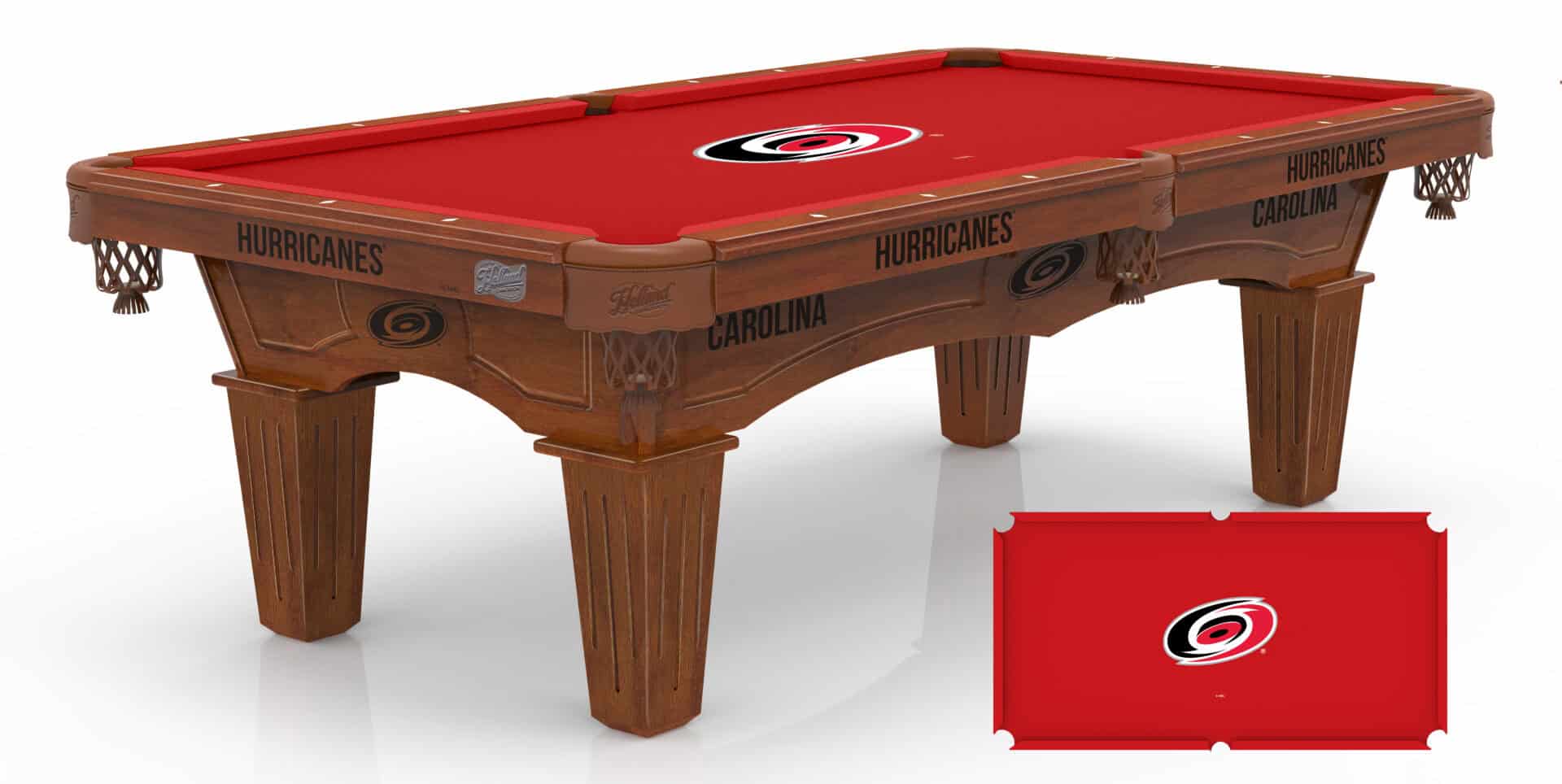 The Carolina Hurricanes Pool Table with Chardonnay Finish and Tapered Leg is a premium addition to any game room or man cave. Designed for both aesthetics and performance, this pool table features a solid double-arched cabinet with intricate CNC routing, showcasing laser-engraved logo art elements. Its elegant Chardonnay finish complements most room settings, while the hand-carved tapered legs provide a timeless and sturdy base. The playing surface is crafted for professional-quality performance, utilizing 1-inch thick diamond-honed slate and topped with Hainsworth worsted cloth, renowned as one of the best in the world. This table ensures exceptional playability and makes a bold statement in any space.