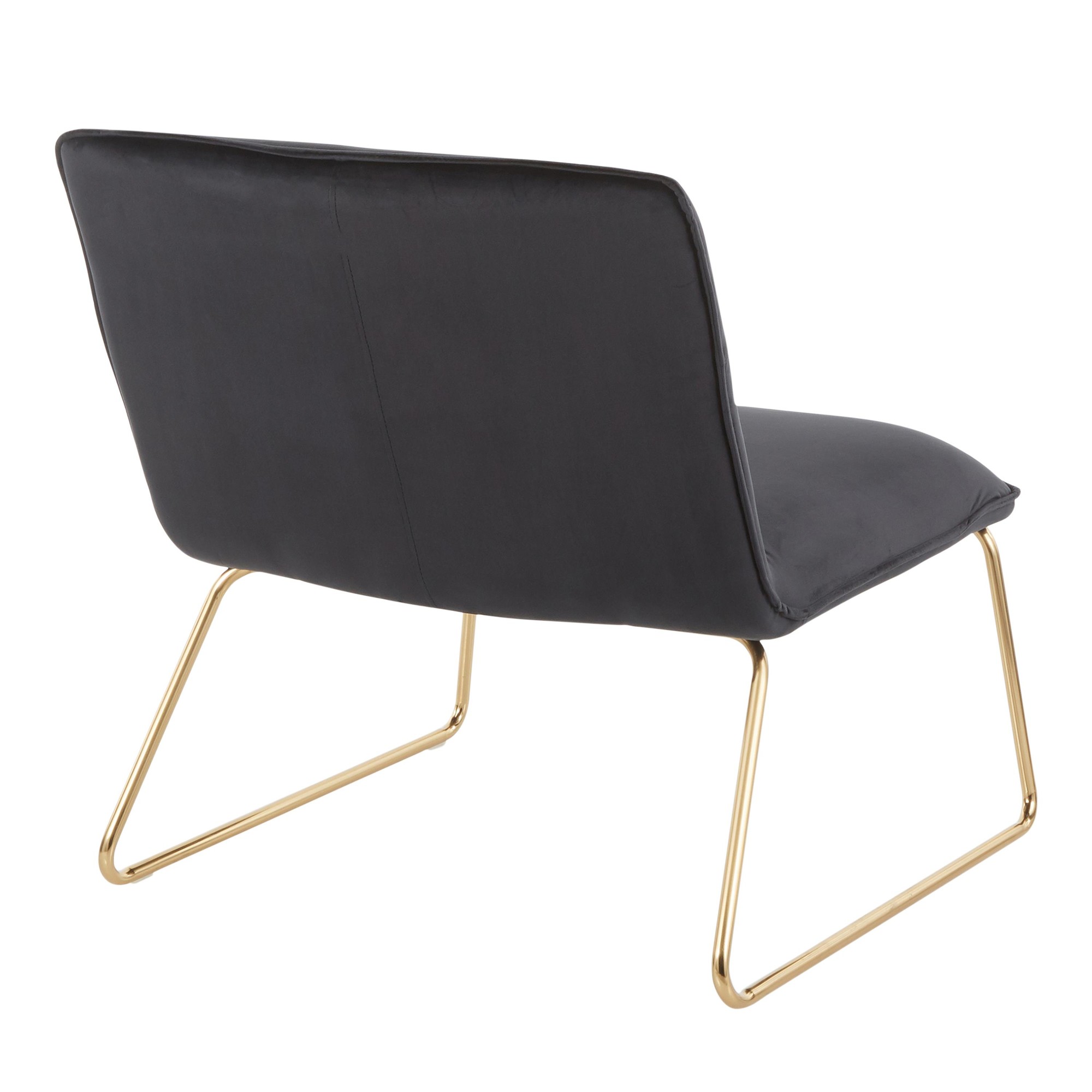 The Casper Accent Chair brings comfortable seating in a stylish and slim design to your home. This chair features a padded seat and back upholstered in sleek velvet fabric. Gold metal sleigh legs provide durable support and contribute to the glam style of the chair. Add it as seating to your living room, bedroom, or office with this simple yet stylish chair. Available in a variety of upholstery colors, choose the one that fits your space the best.