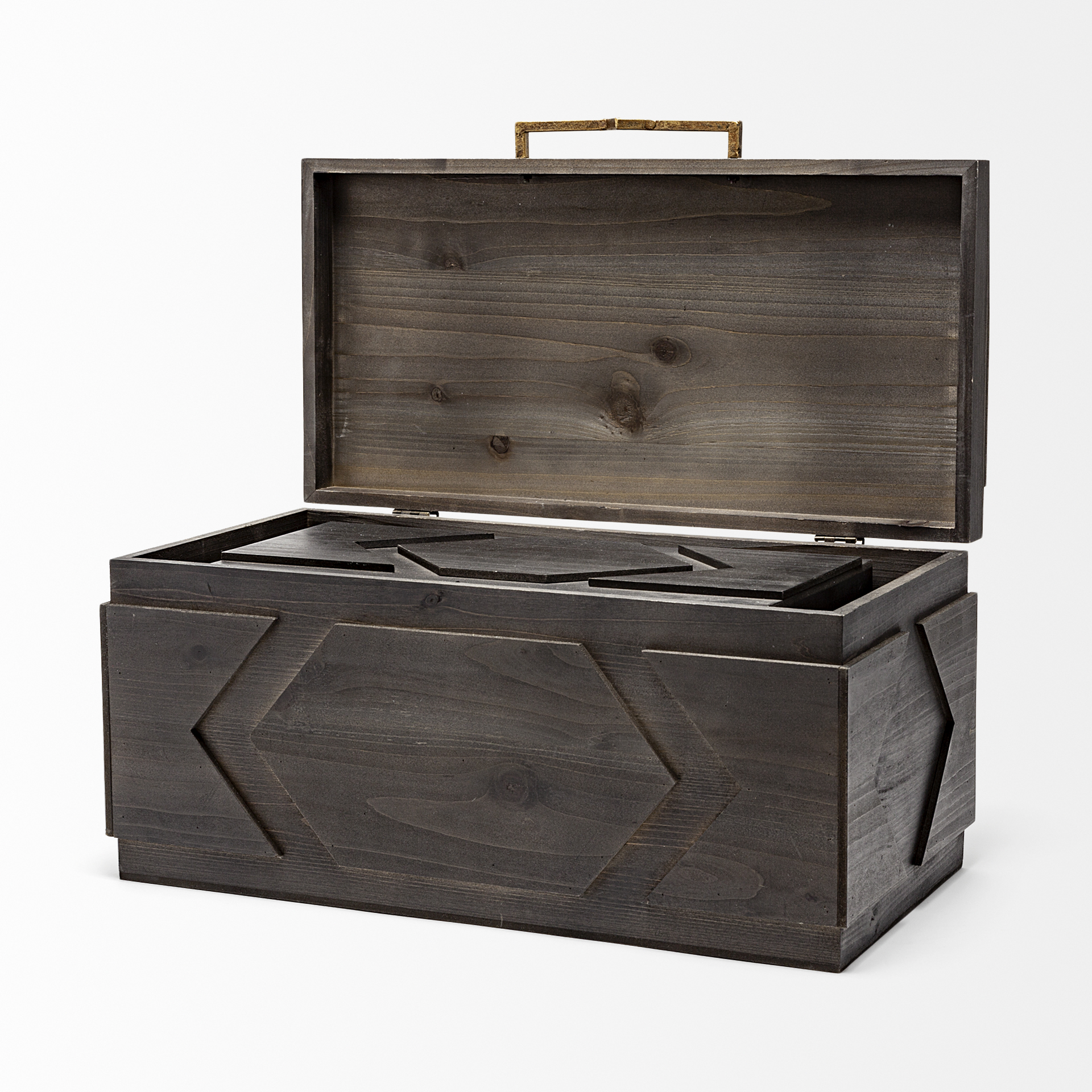 The Cassia set of decorative wooden boxes is a stunning and functional addition to any space! Crafted from dark-stained wood with angular geometric accents and iron handles, these boxes are perfect for storing your treasures while adding a touch of style to your favorite accent table.
