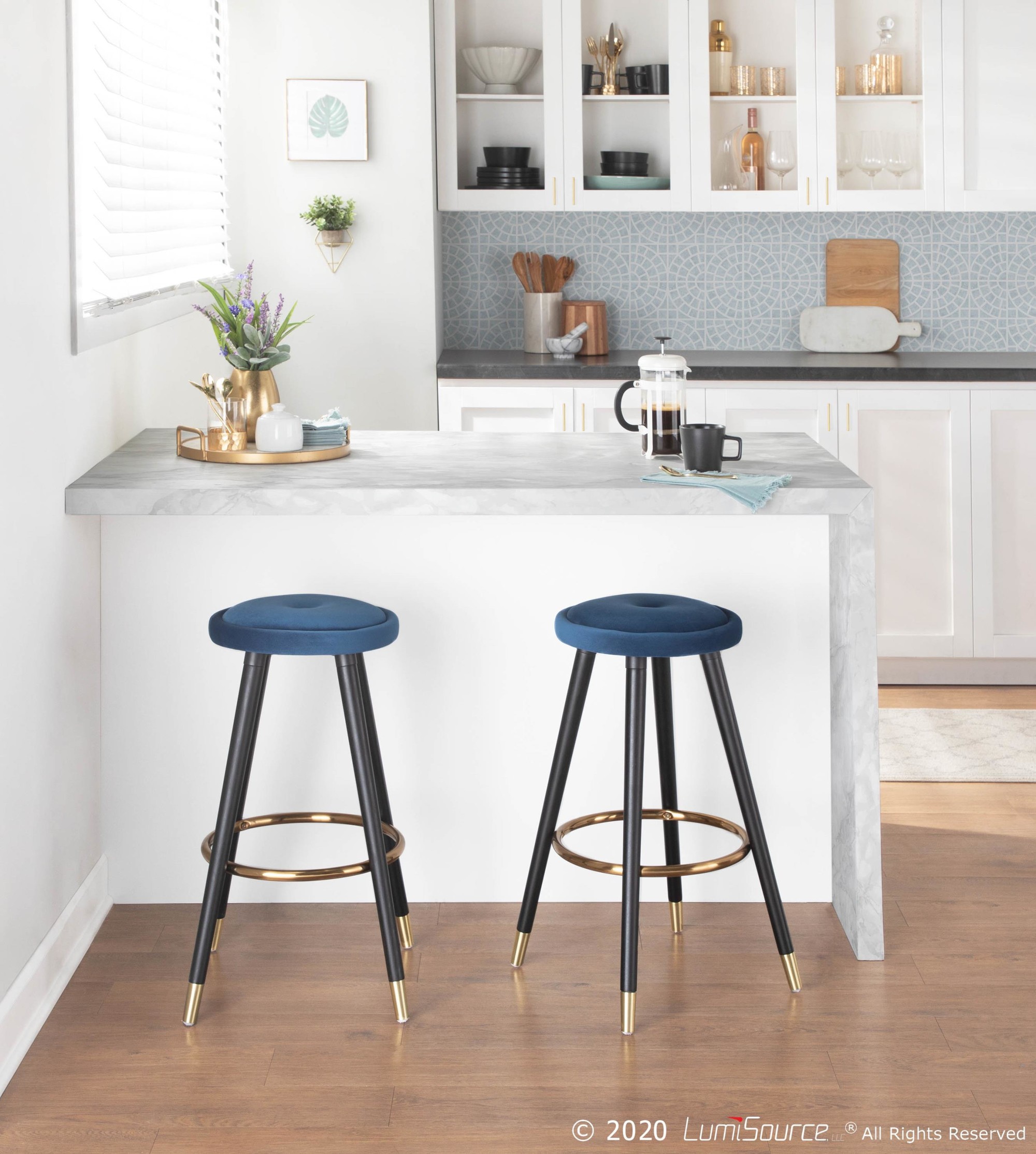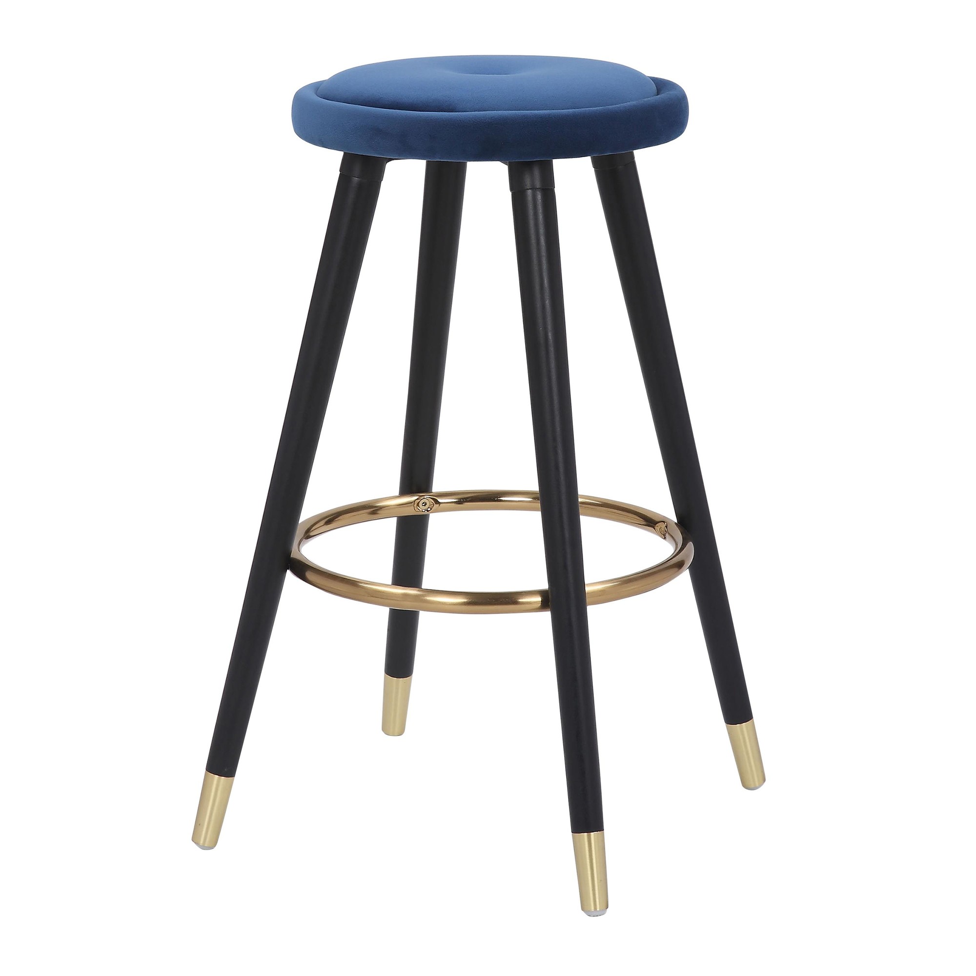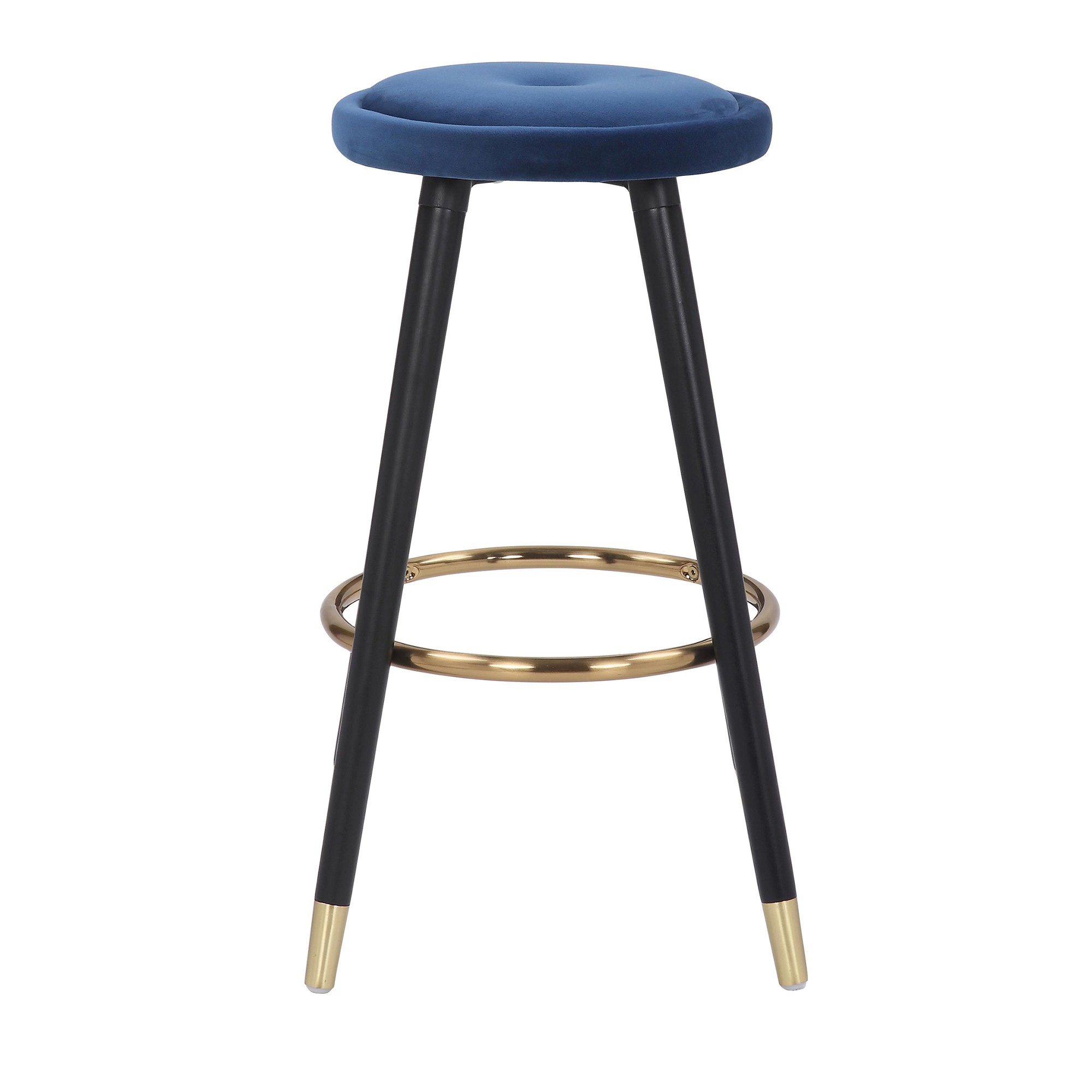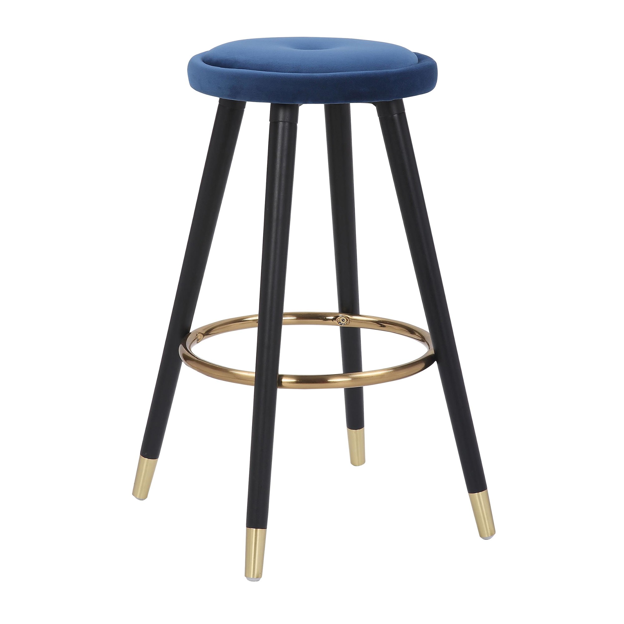 This chic counter stool, influenced by Art Deco design, adds a touch of glam to any space. The Cavalier Counter Stool is a stunning combination of black wood, blue velvet, and gold accents, making it a must-have for your home. Its backless design allows it to tuck neatly under counters or tables, optimizing space and style. Available in a variety of velvet upholstery options, you can select the perfect match for your decor. Enjoy the sleek velvet upholstery and gold metal accents that elevate its overall aesthetic.