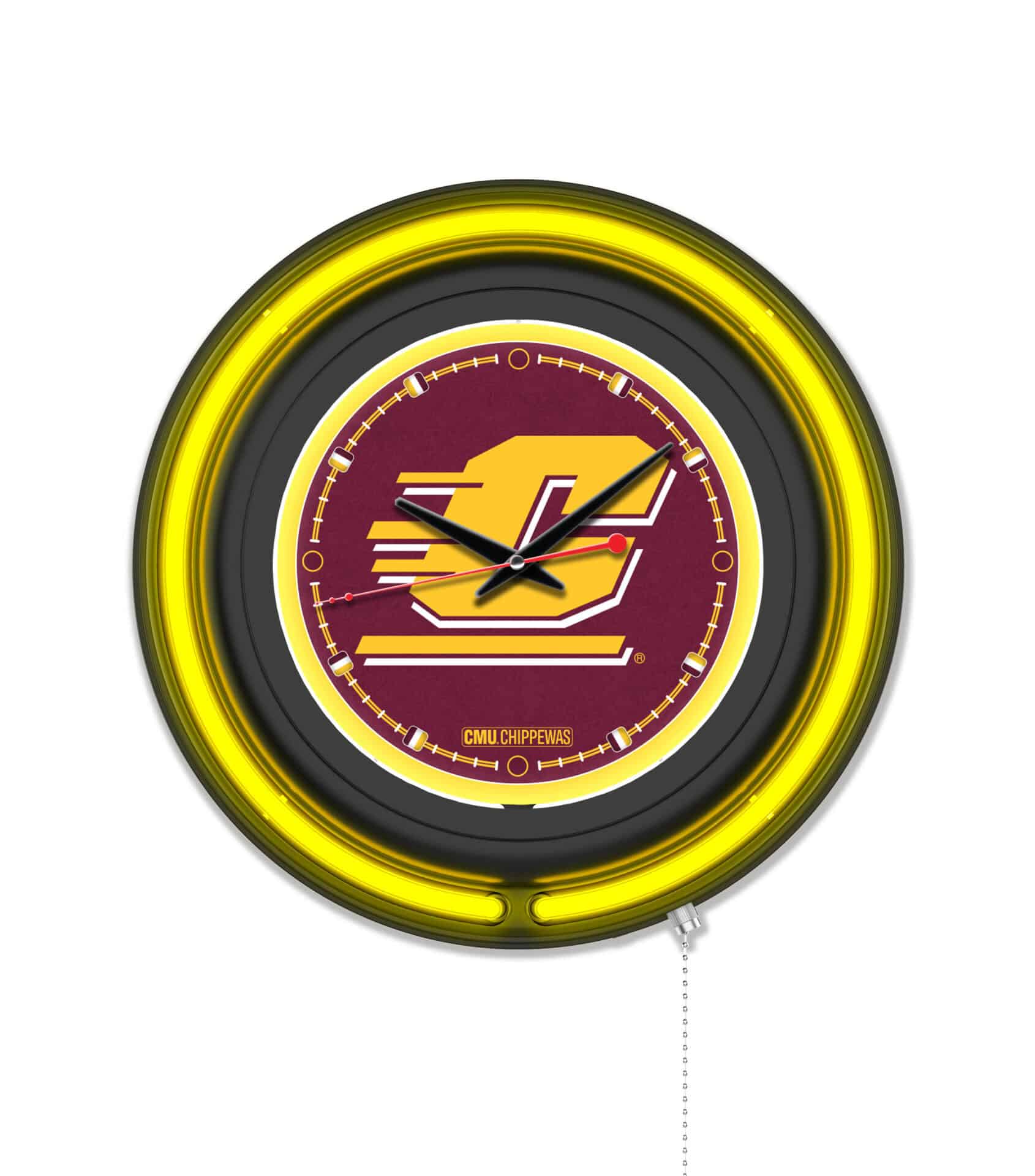 The Central Michigan University 15-Inch Neon Logo Clock in Black is the ultimate addition to any fan’s man cave. This stylish clock features a sleek black casing and vibrant team colors, creating a stunning visual display. The dual neon rings—one in your team color and a white inner ring—illuminate the custom printed clock face, ensuring it stands out. With its easy pull chain for on/off operation and accurate quartz movement powered by a single AA battery, this clock is both functional and eye-catching. Perfect as a gift for graduates, sports enthusiasts, or even for your own space, this clock showcases your school pride effortlessly.