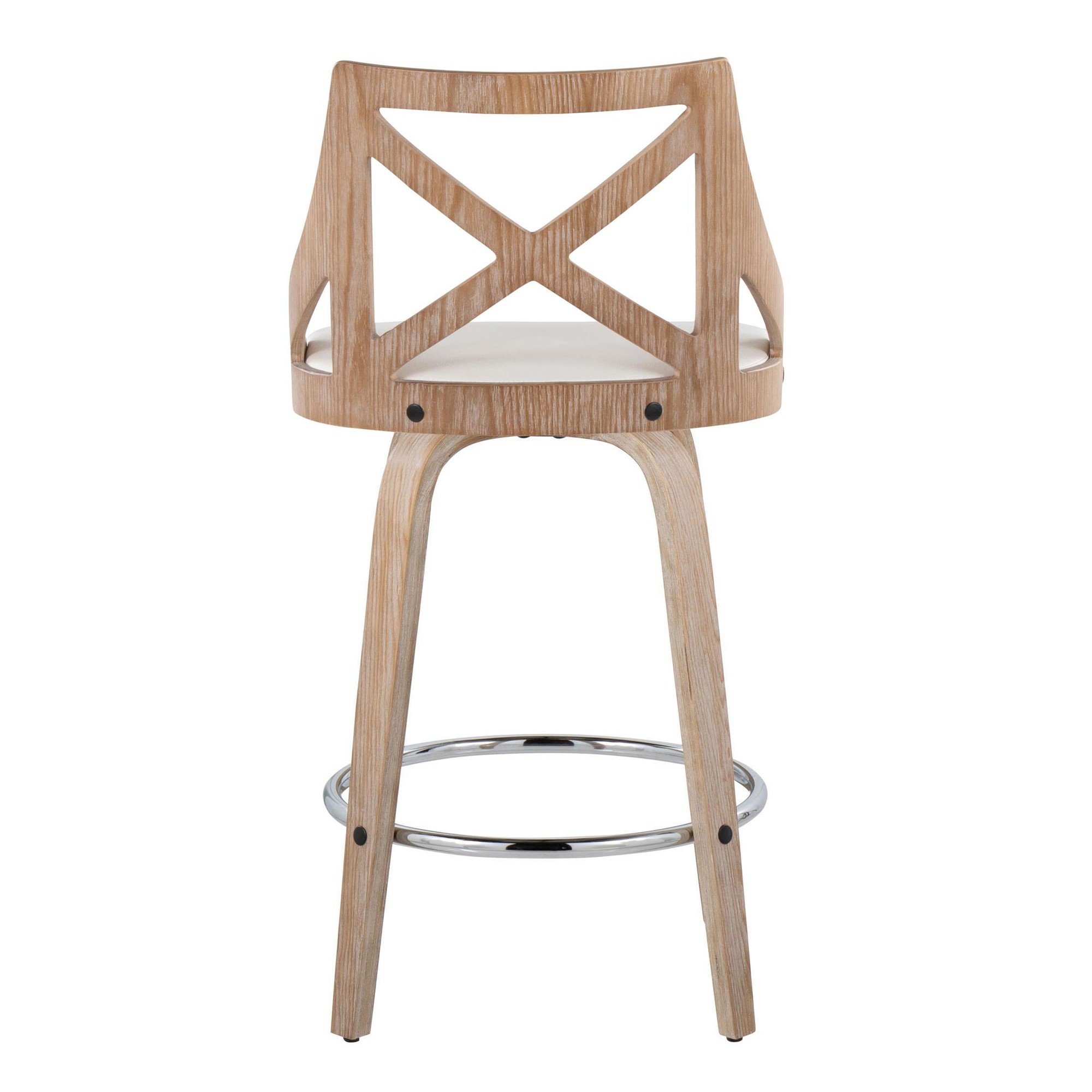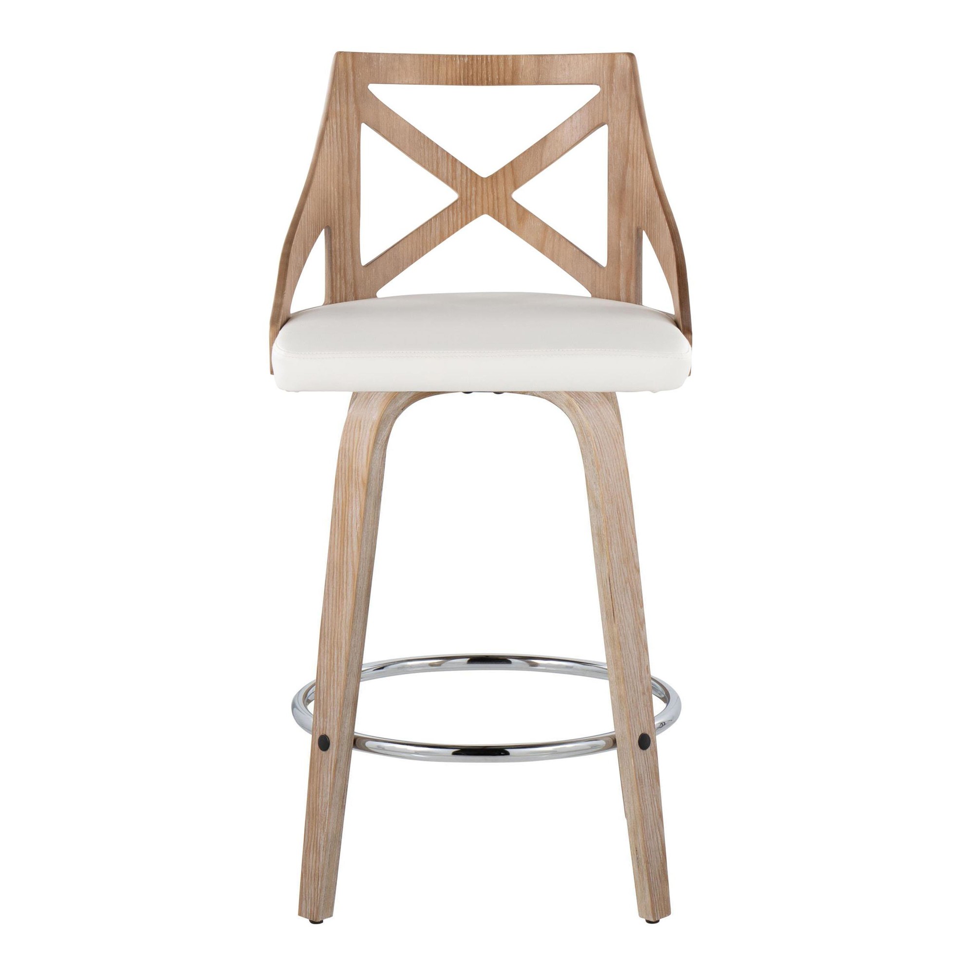 The elegant styling and X-shaped backrest provide visual appeal, while the 360-degree swivel seat offers functionality. The cushioned seat, upholstered in faux leather, ensures comfort, and the bent wood legs with a round chrome metal footrest add durability and style. These counter stools are sold in pairs.
