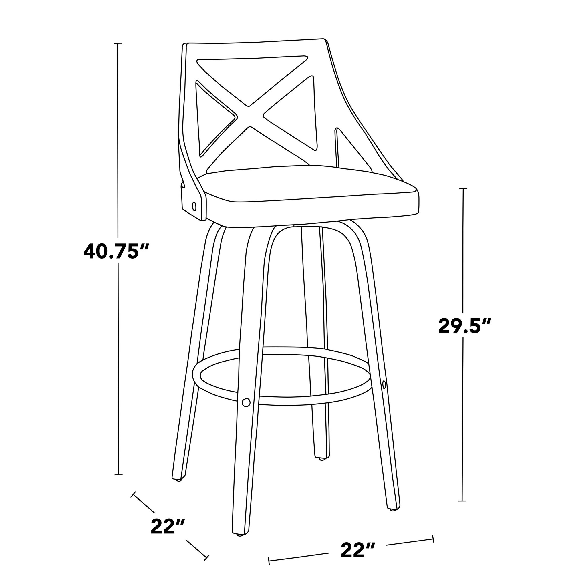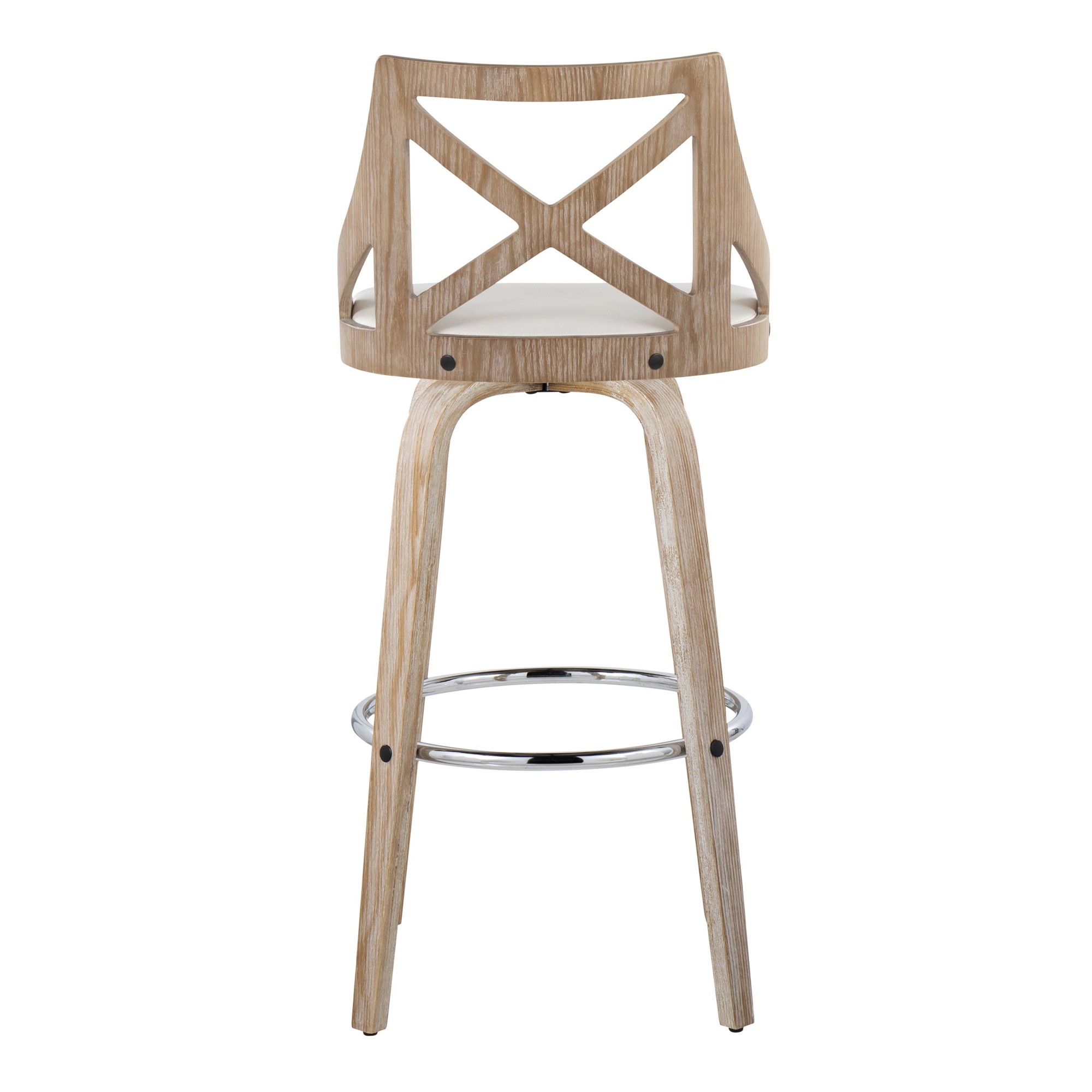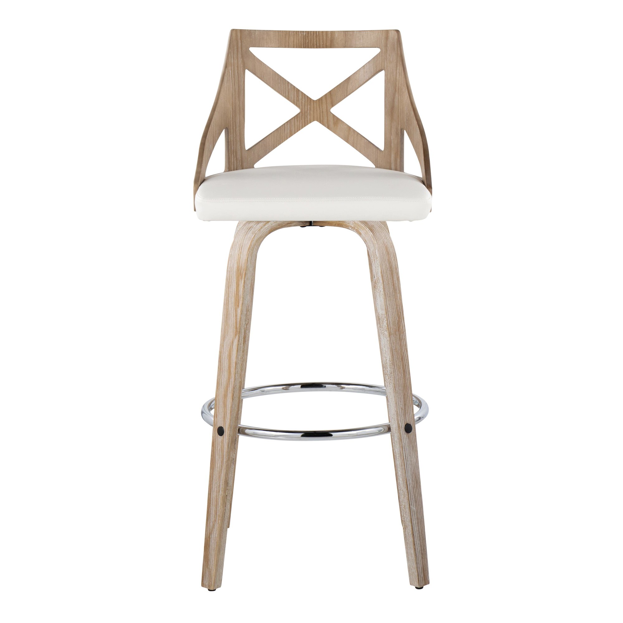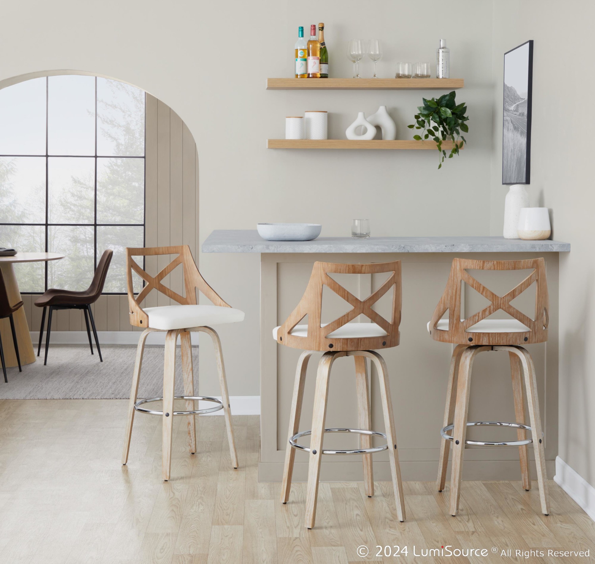 The Charlotte 30 Whitewashed Farmhouse Swivel Barstool adds a touch of farmhouse elegance to your dining area. This barstool beautifully blends traditional and farmhouse styles, featuring an X-shaped accent on the backrest, bent wood legs, stylish upholstery, and a convenient swivel seat. Enjoy comfortable seating and elevate your home décor with this charming piece.