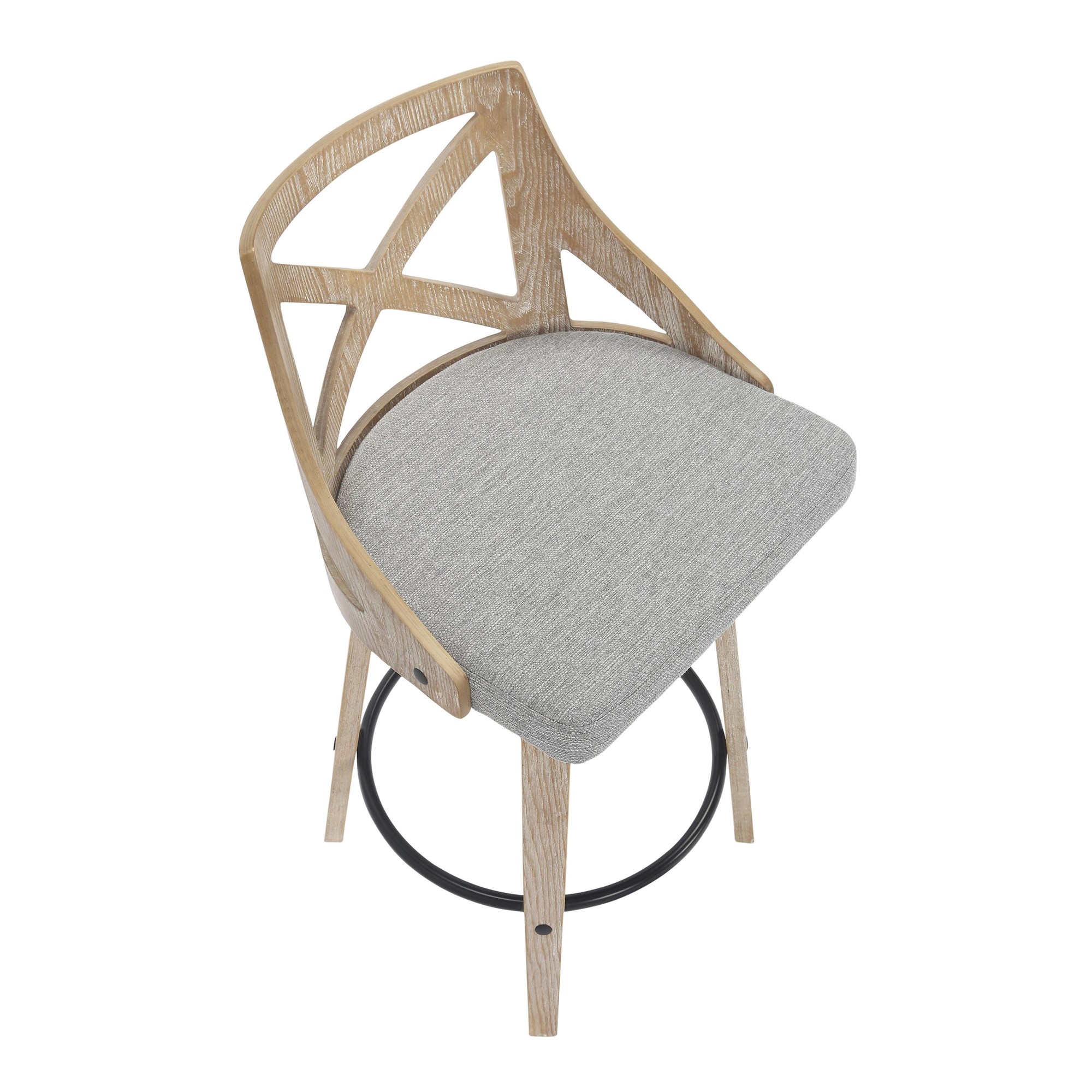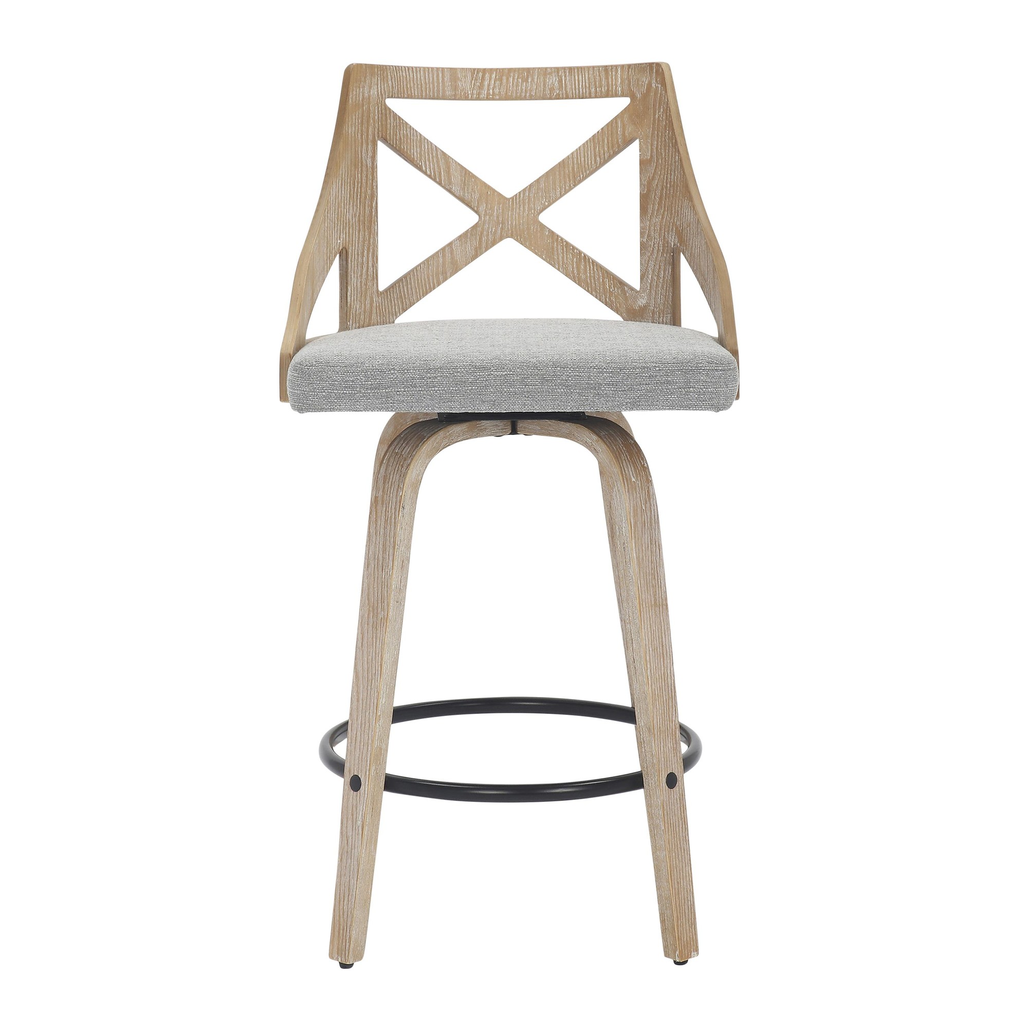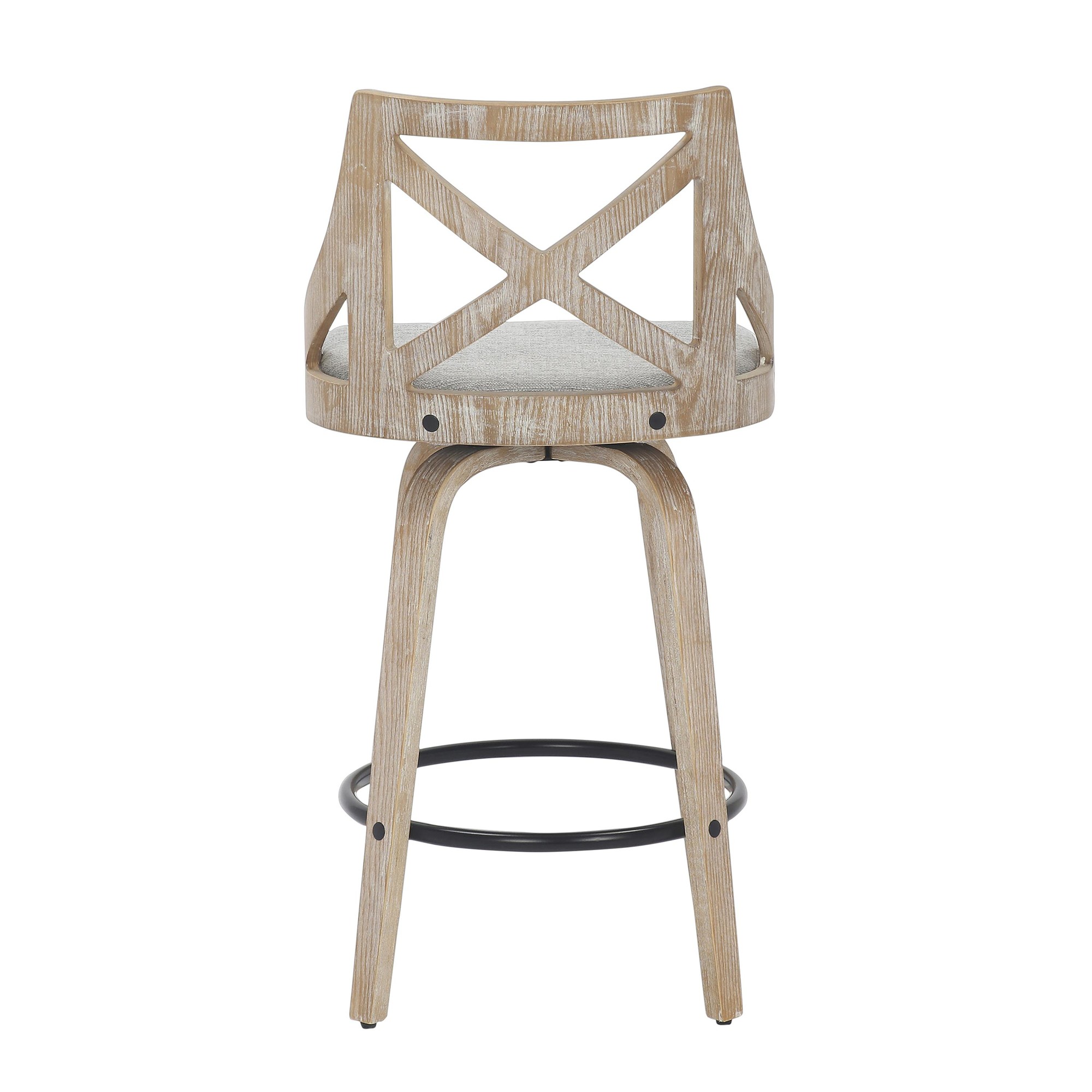 The Charlotte Counter Stool adds farmhouse elegance to your dining or bar area. Its elegant styling features an X-shaped accent on the backrest. The white-washed wood finish and light grey fabric upholstery blend traditional and farmhouse styles. Enjoy the convenience of a 360-degree swivel seat.