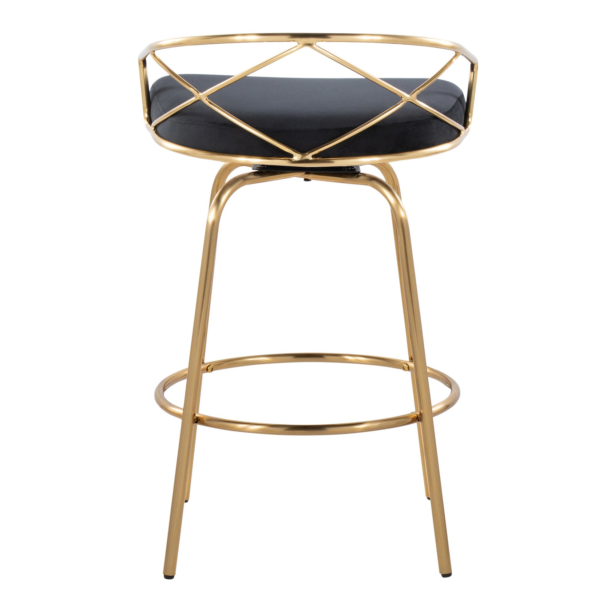 Elevate your space with the Charlotte Glam Gold and Black Velvet Counter Stools. This set of two stools brings a touch of luxe style to your man cave. Each stool features a rounded backrest and a padded velvet seat for ultimate comfort. The 360-degree swivel lets you easily join the conversation. Strong metal legs in a gold finish feature a convenient built-in footrest. Perfect for your bar or counter, these fixed counter height stools are as practical as they are stylish. Assembly Required. Product Specs: 23″L × 23″W × 31.5″H. Color: Gold Metal, Black Velvet. Material: Velvet Fabric, Foam, Metal.