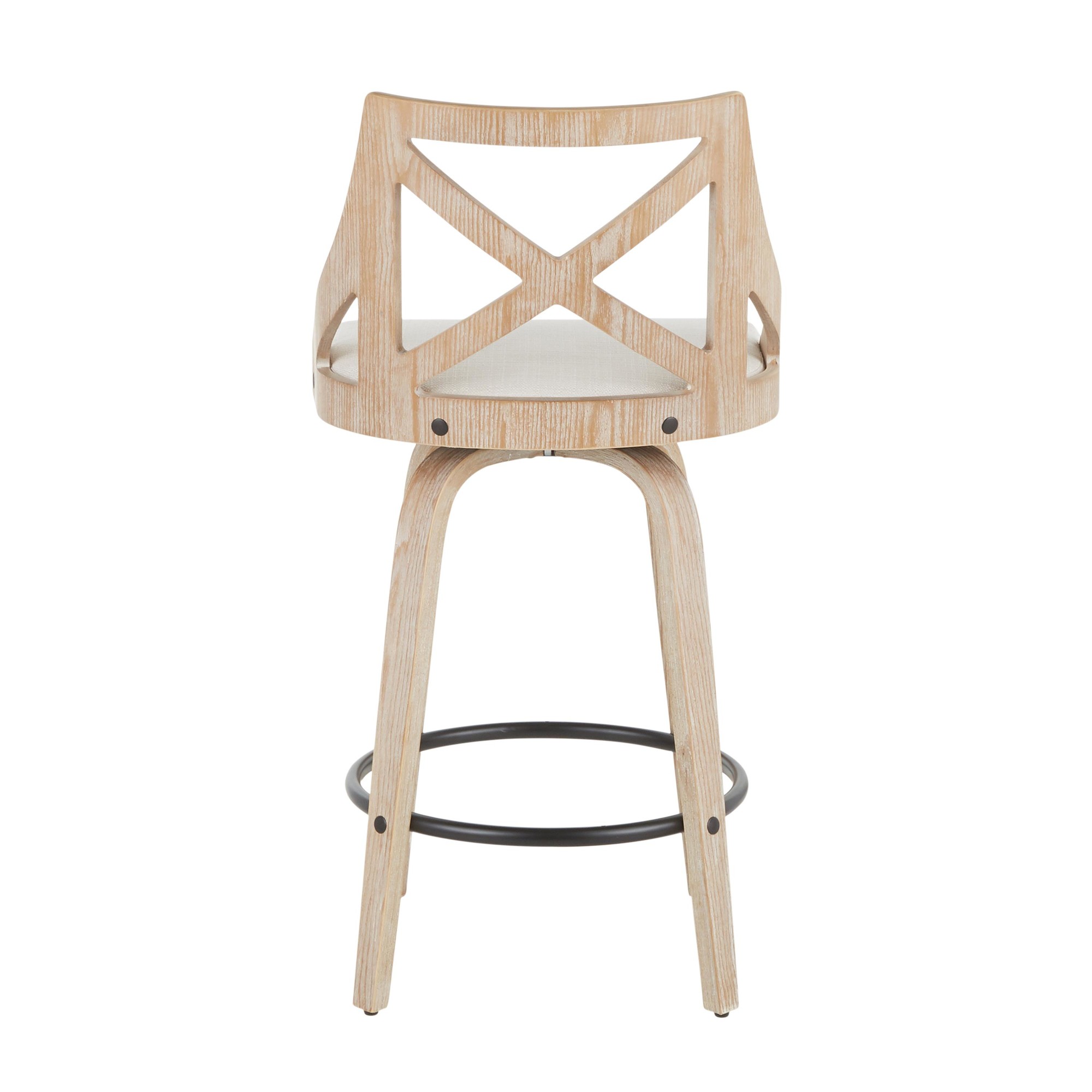 Spruce up your dining area with the Charlotte Counter Stool! This stool boasts elegant styling, with an eye-catching X-shaped accent on the backrest. The white washed wood finish, comfortable fabric upholstery, and convenient swivel seat create a stunning blend of traditional charm and farmhouse flair.