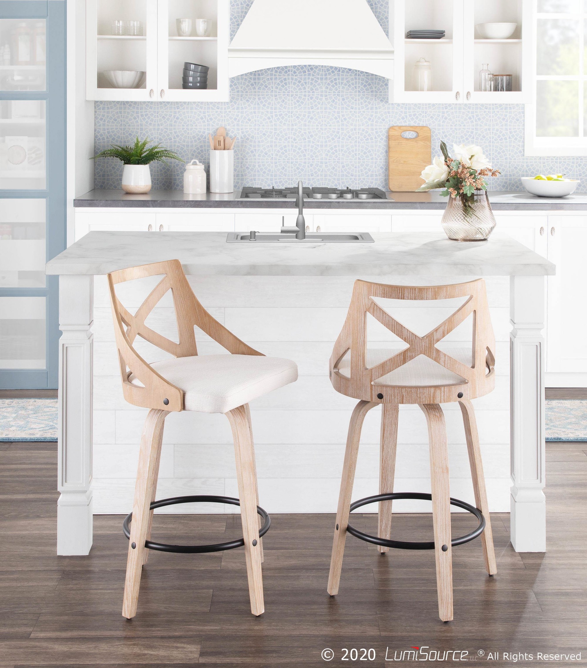 Bring a touch of the country to your space with the Charlotte White Washed Wood Farmhouse Counter Stools. These stools feature a stylish X-shaped back and a comfy cream fabric upholstered seat. Enjoy the freedom of a 360-degree swivel. The white washed wood finish and black metal frame add a rustic feel to any room. These stools have a fixed counter height of 25.75″. Each stool can hold up to 250 lbs. This set includes two counter stools to complete your setup. Some assembly is required.