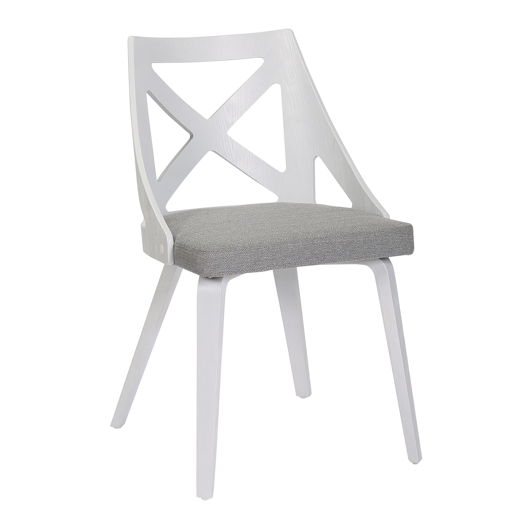 Spruce up your dining area with these elegant chairs! These chairs feature a stylish farmhouse design with an X-shaped accent on the backrest. The white textured wood and light grey fabric upholstery blend traditional and farmhouse styles beautifully. Each chair has a comfortable cushioned seat and a fixed dining height. This set includes two chairs. Assembly is required. Product Specs: 21.75″L × 19.75″W × 32″H. Perfect for adding a personal touch to your dining space!