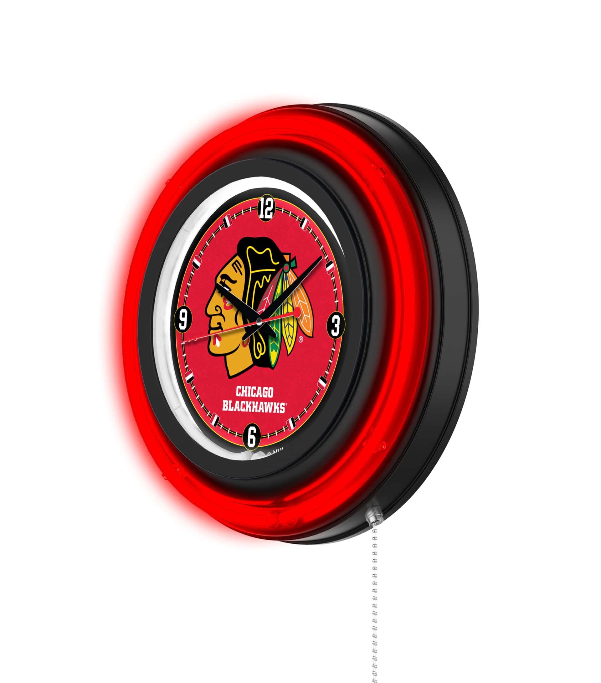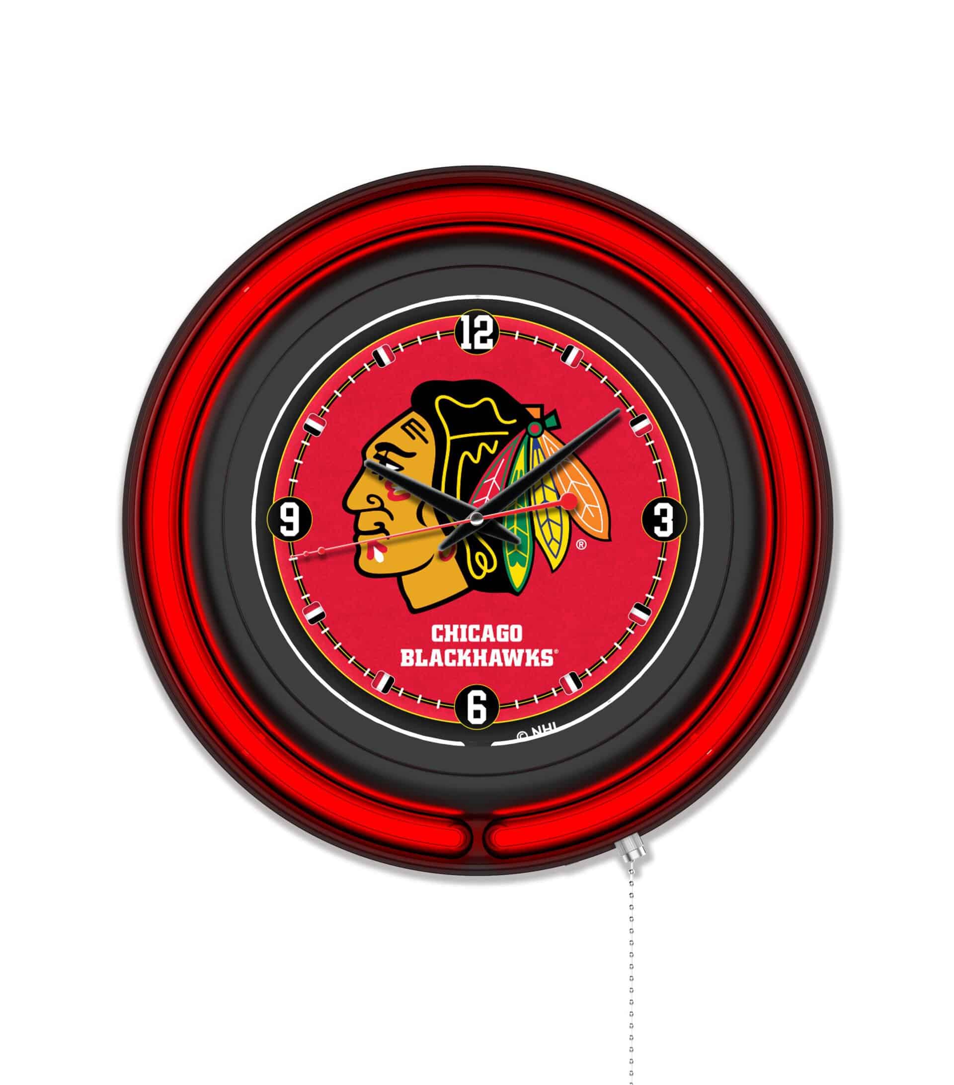 Our double neon Logo Clocks are the perfect way to show your team pride. Featuring a black casing and a team color specific neon outer ring, this clock accentuates the custom printed clock face which is illuminated by a brilliant white inner neon ring. The neon rings can be easily turned on and off with a pull chain located at the bottom of the clock. Powered by a UL Listed power transformer that connects to a standard 120V outlet, this clock also boasts accurate quartz movement and is powered by a single AA battery (not included). Perfect as a gift for a sports super fan or for your own man cave, this clock combines style and functionality.