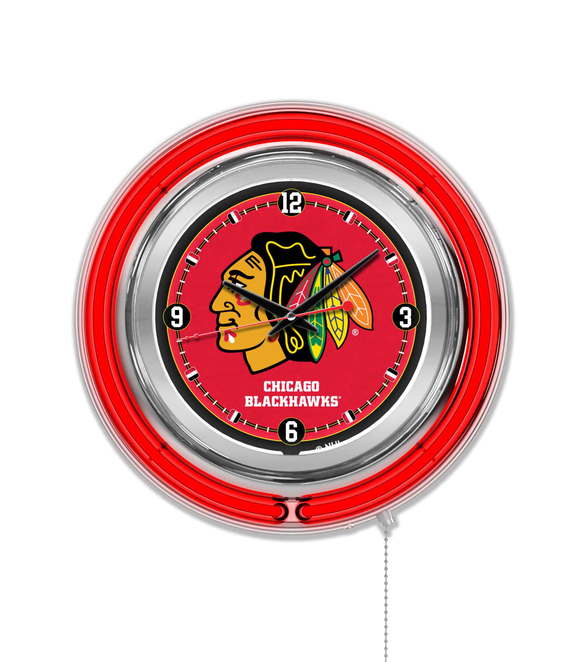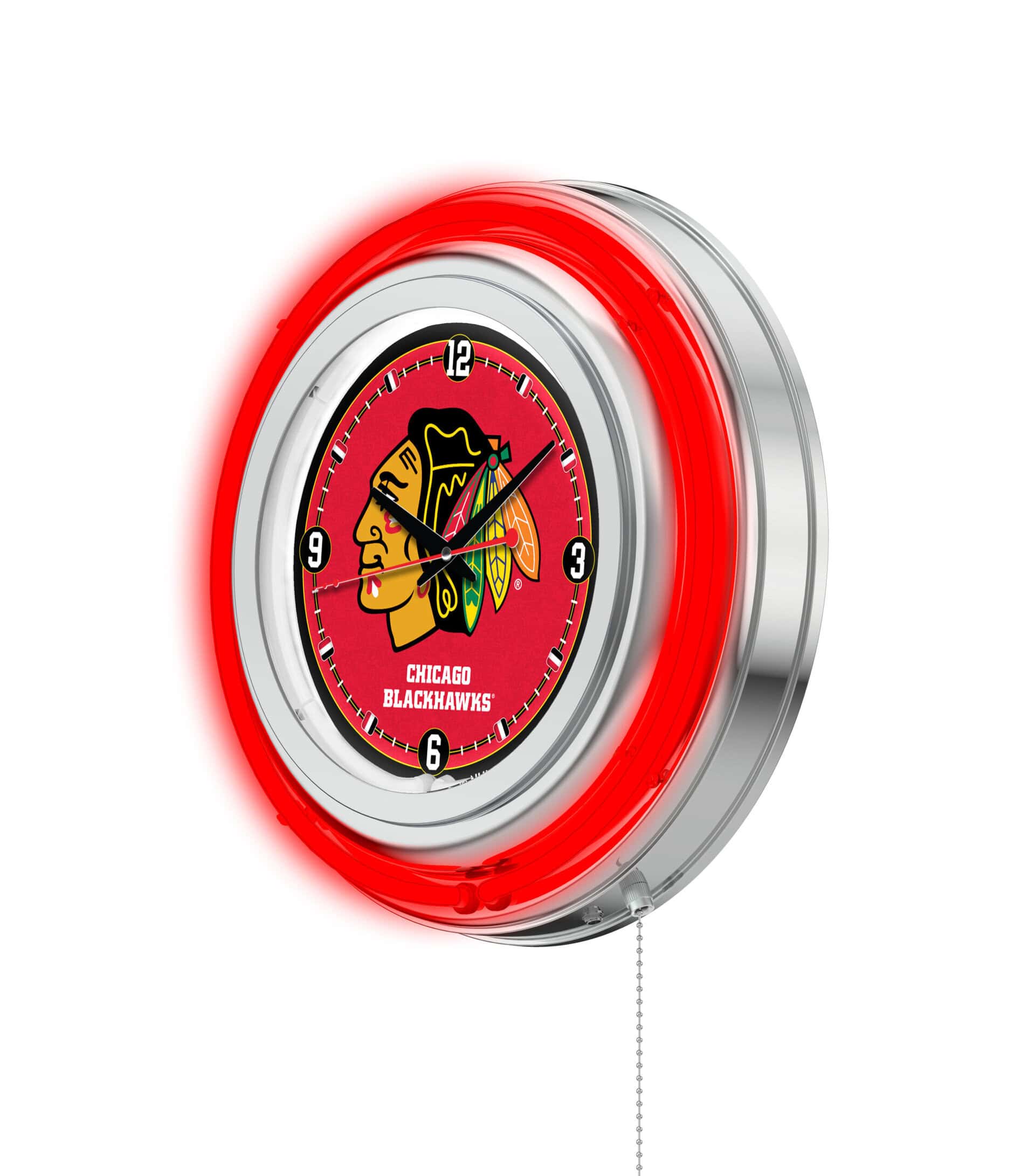 The Chicago Blackhawks 15-Inch Neon Logo Clock in Chrome is the ultimate decor piece for any sports enthusiast’s space. With its eye-catching neon rings and sleek chrome casing, this clock not only keeps accurate time but also showcases your team pride. The vibrant, full-color artwork is officially licensed and features a custom printed clock face illuminated by a brilliant white inner neon ring. Easily control the neon lights with a convenient pull chain, making it simple to turn on and off as desired. This clock is powered by a UL Listed transformer that plugs into a standard 120V outlet and requires a single AA battery for the clock mechanism (battery not included).