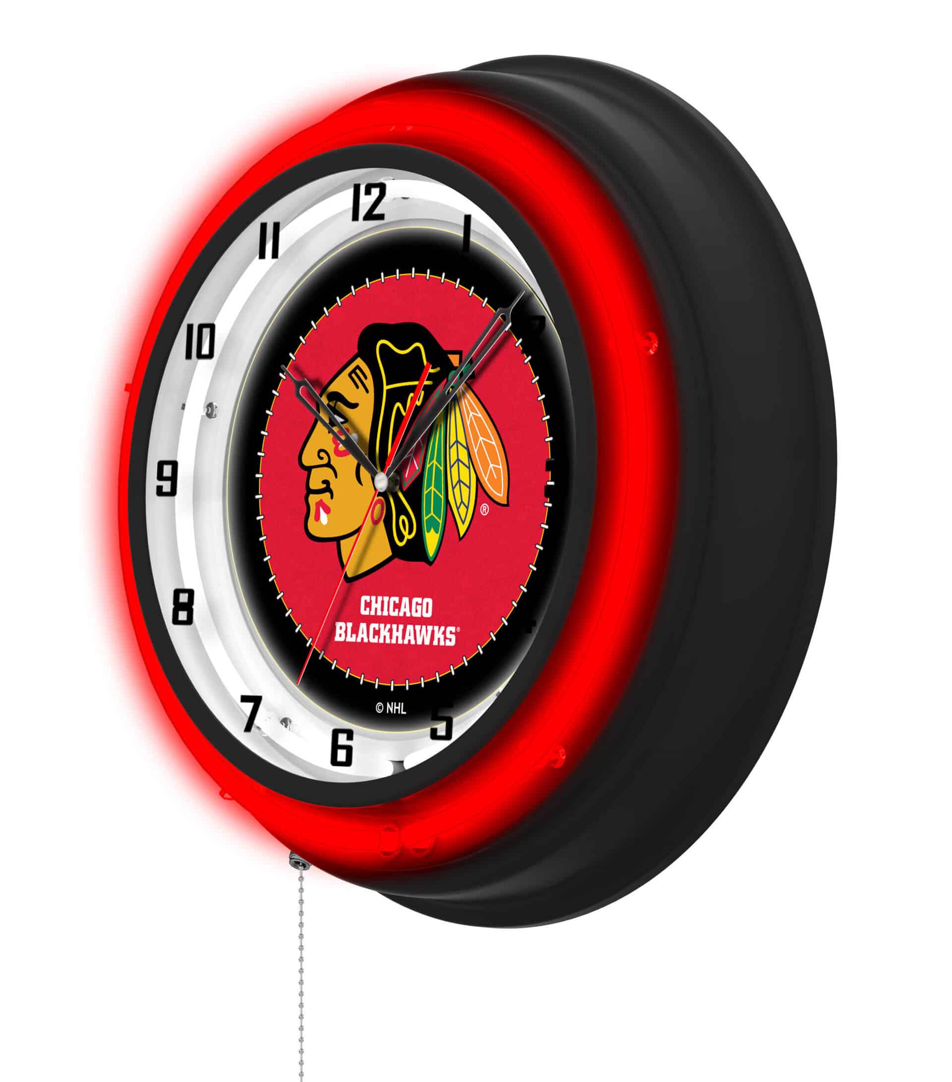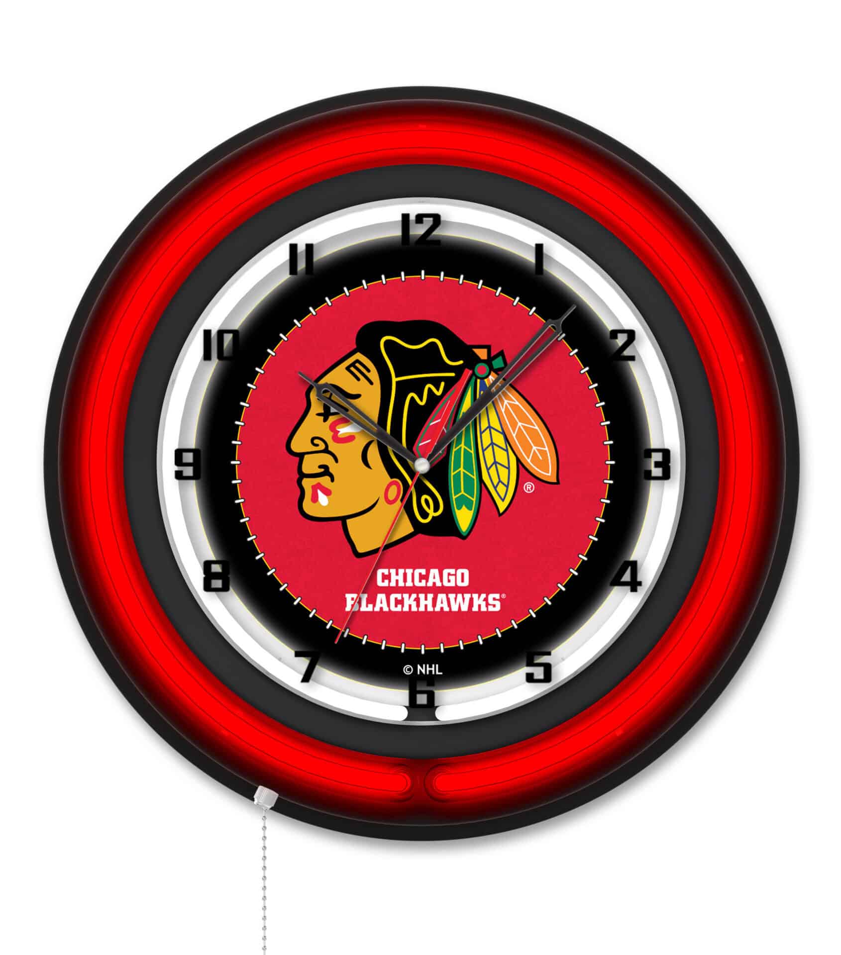 The 19-Inch Double Neon Wall Clock in Black is the ultimate addition to any man cave, showcasing your team pride with vibrant artwork and functional design. Featuring a sleek black casing and a striking neon outer ring, this clock lights up your space while providing accurate timekeeping. The illuminated clock face, powered by a standard 120V outlet, is easily operated with a convenient pull chain. Designed for sports enthusiasts and collectors alike, it makes for an excellent gift or personal decor piece.