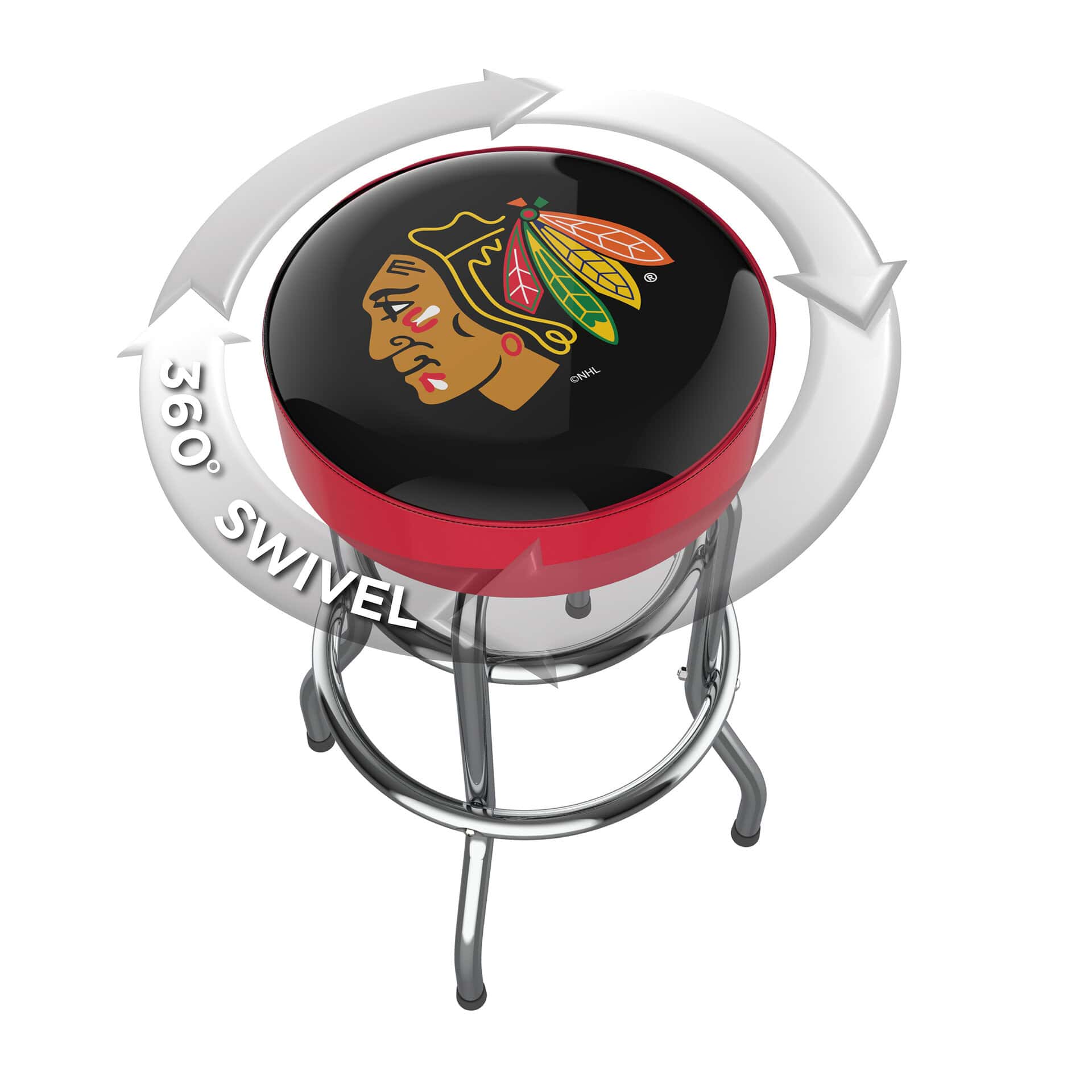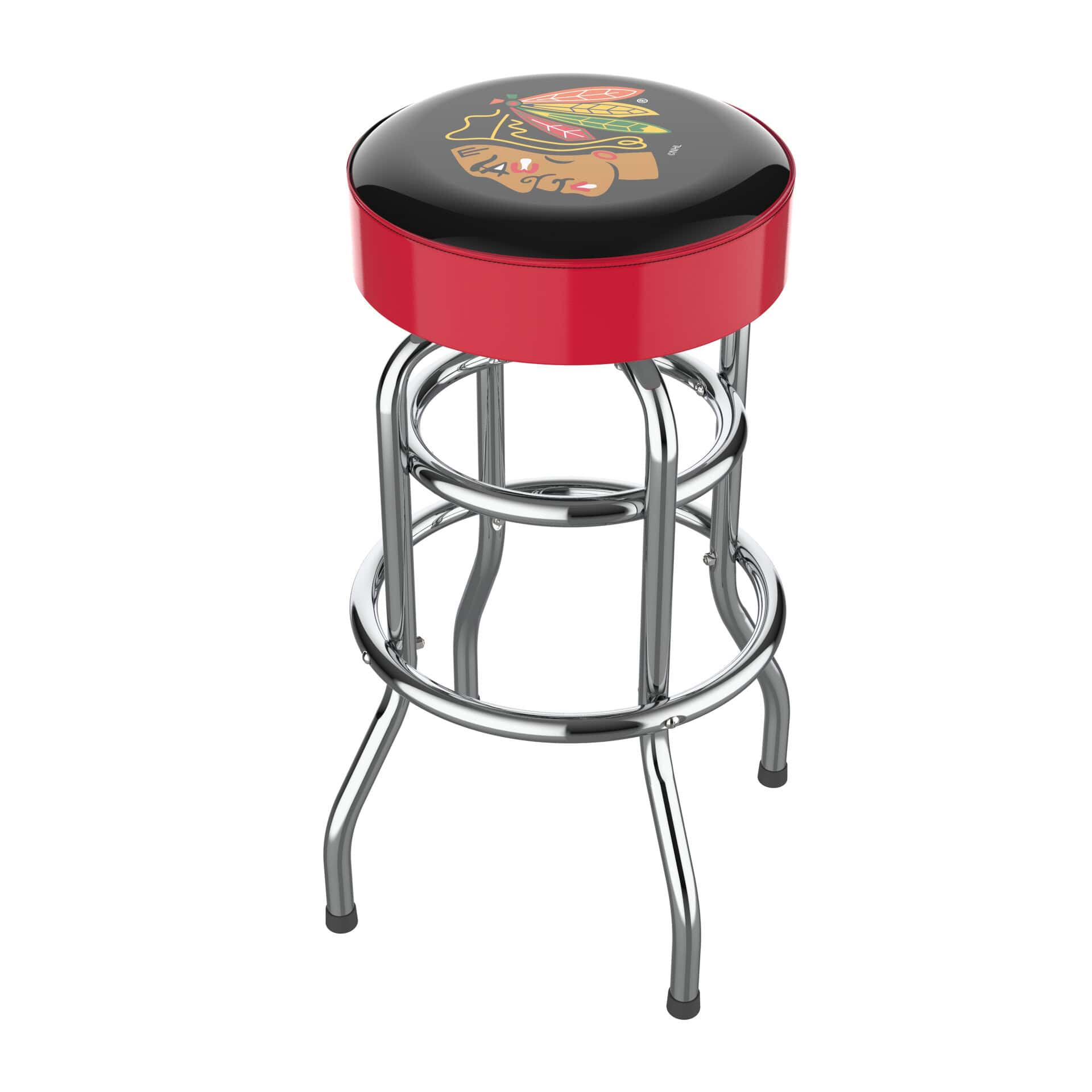 Bring home the spirit of the game with this commercial-grade bar stool, perfect for any Chicago Blackhawks fan. This sturdy and stylish stool is designed for years of reliable use and showcases your team pride. Enjoy the comfort of the quality-constructed seat and the vibrant team colors and logos that will never scratch off. This is the perfect addition to your fan cave, game room, or bar area.