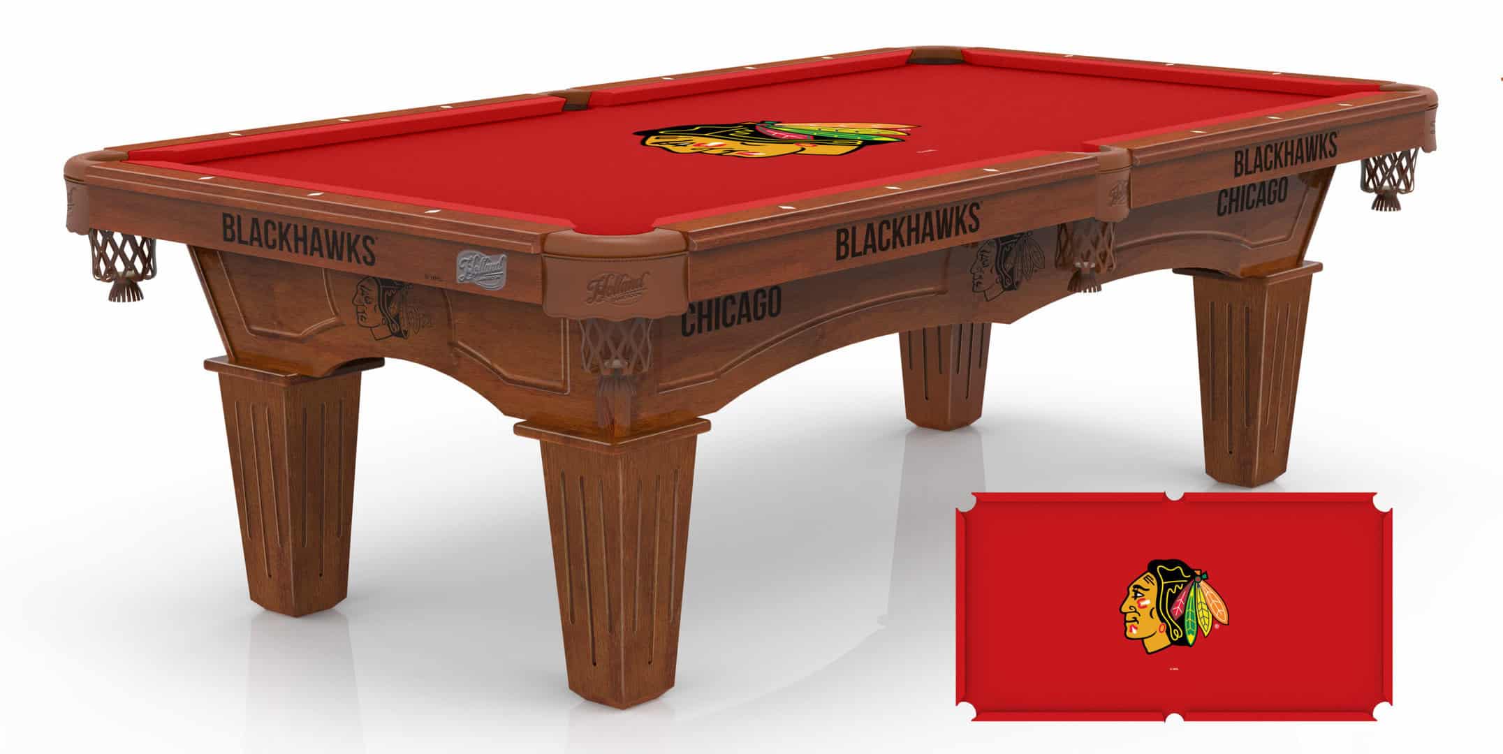 The Chicago Blackhawks Pool Table with Chardonnay Finish and Tapered Leg is a professional-quality pool table designed for both style and performance. Its elegant double-arch cabinet features intricate CNC routing and laser-engraved logo detailing, complemented by a stunning Chardonnay finish that blends seamlessly with most room décors. This table boasts a 14-step stain and lacquer process for a furniture-grade finish that exudes class and durability. The play surface is crafted with precision, utilizing a 1-inch thick diamond-honed slate for consistent ball play, while the Hainsworth worsted cloth ensures a smooth, professional-grade experience. Supported by hand-carved tapered legs and equipped with embossed leather pockets, this table is the perfect centerpiece for any game room or man cave.