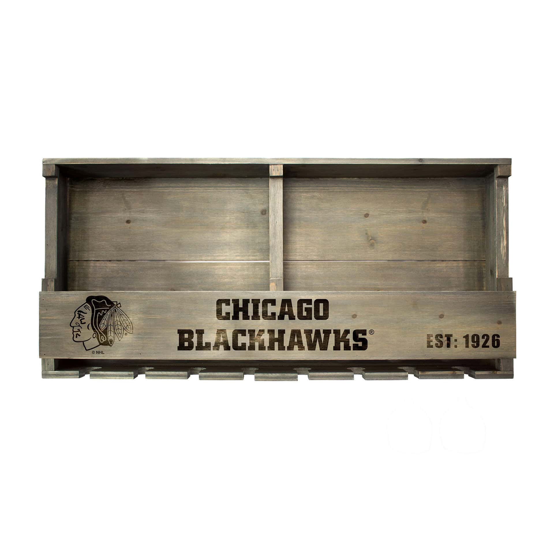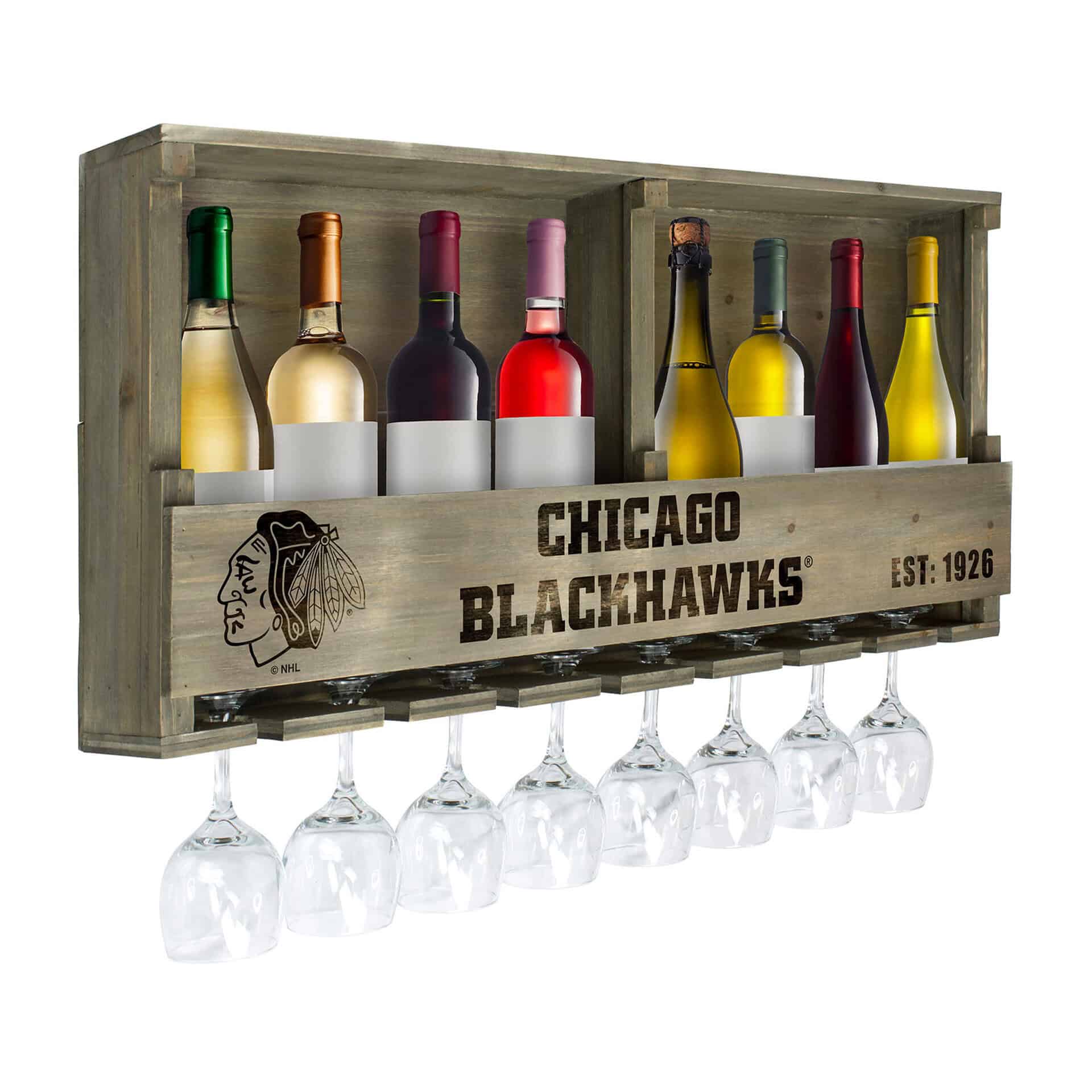 Showcase your team pride with this distinctive reclaimed wood bar shelf. It holds up to 8 bottles and 8 stemmed glasses, making it perfect for any fan cave or gathering space. The vintage, reclaimed look complements any decor. This bar shelf mounts easily to any wall and makes a great gift for the ultimate fan.