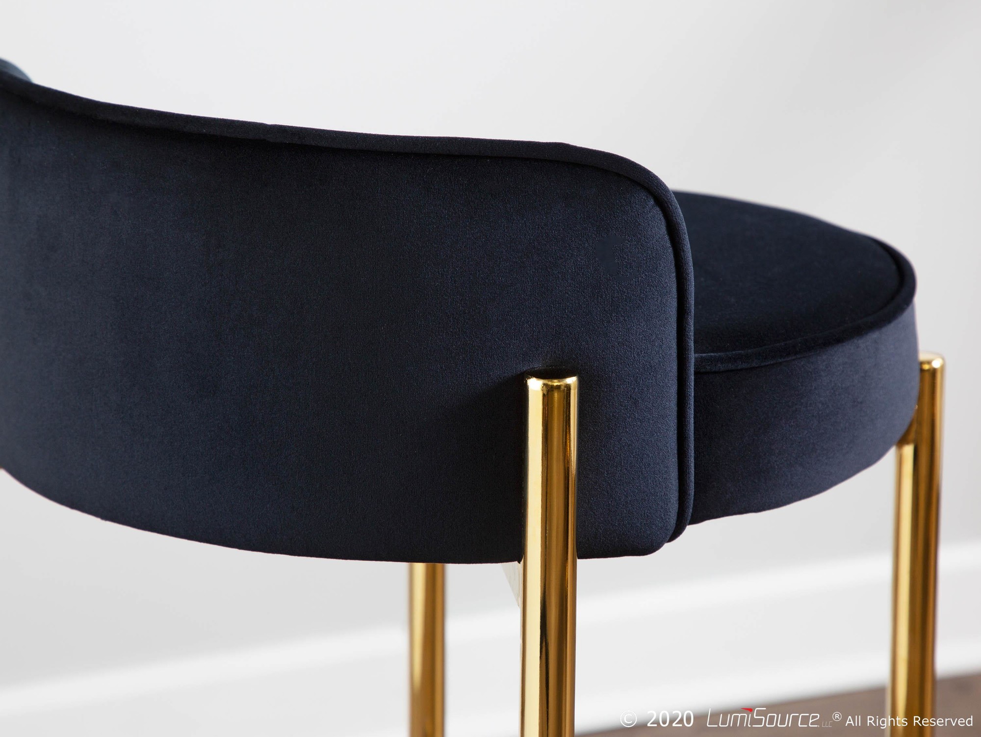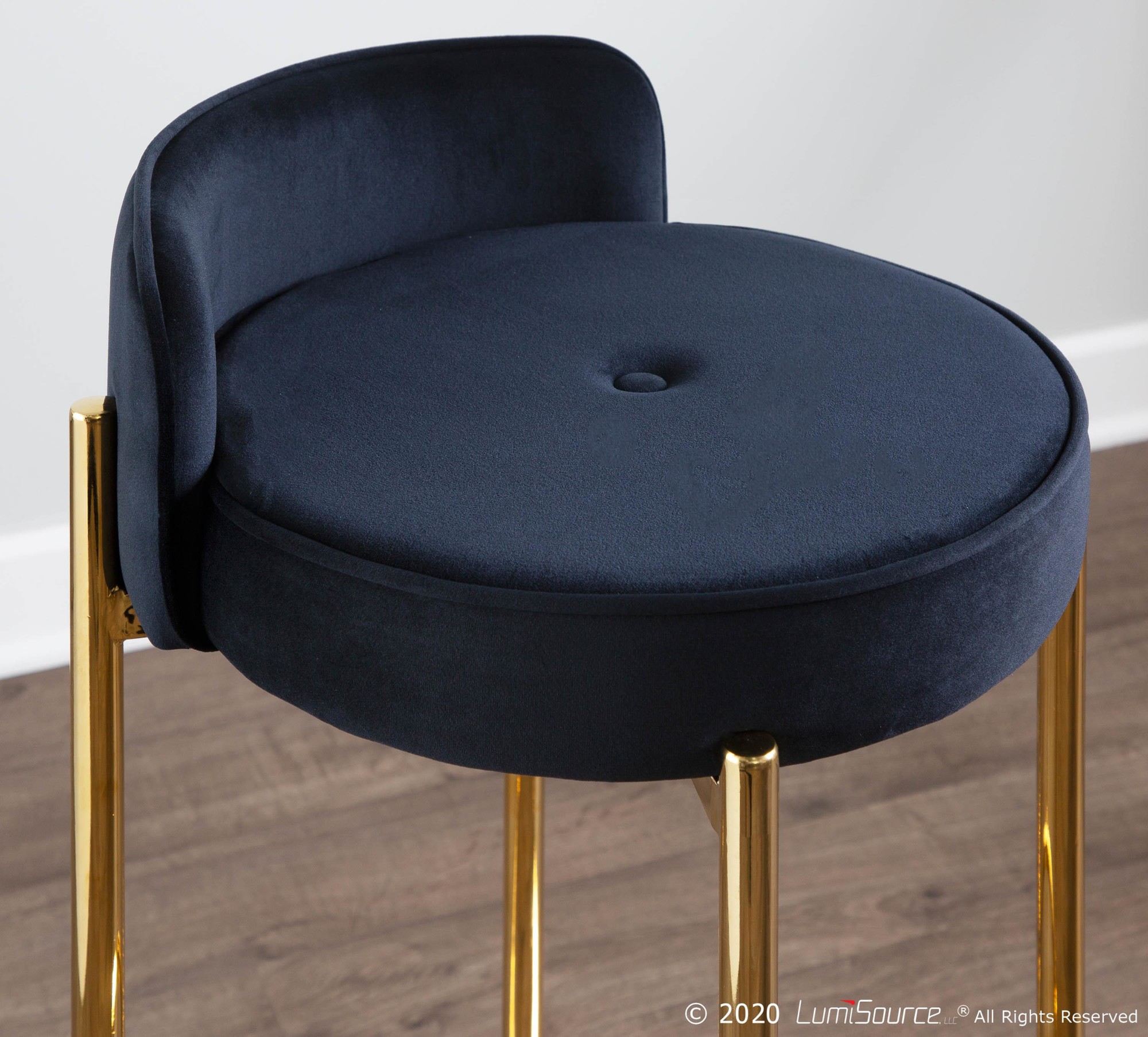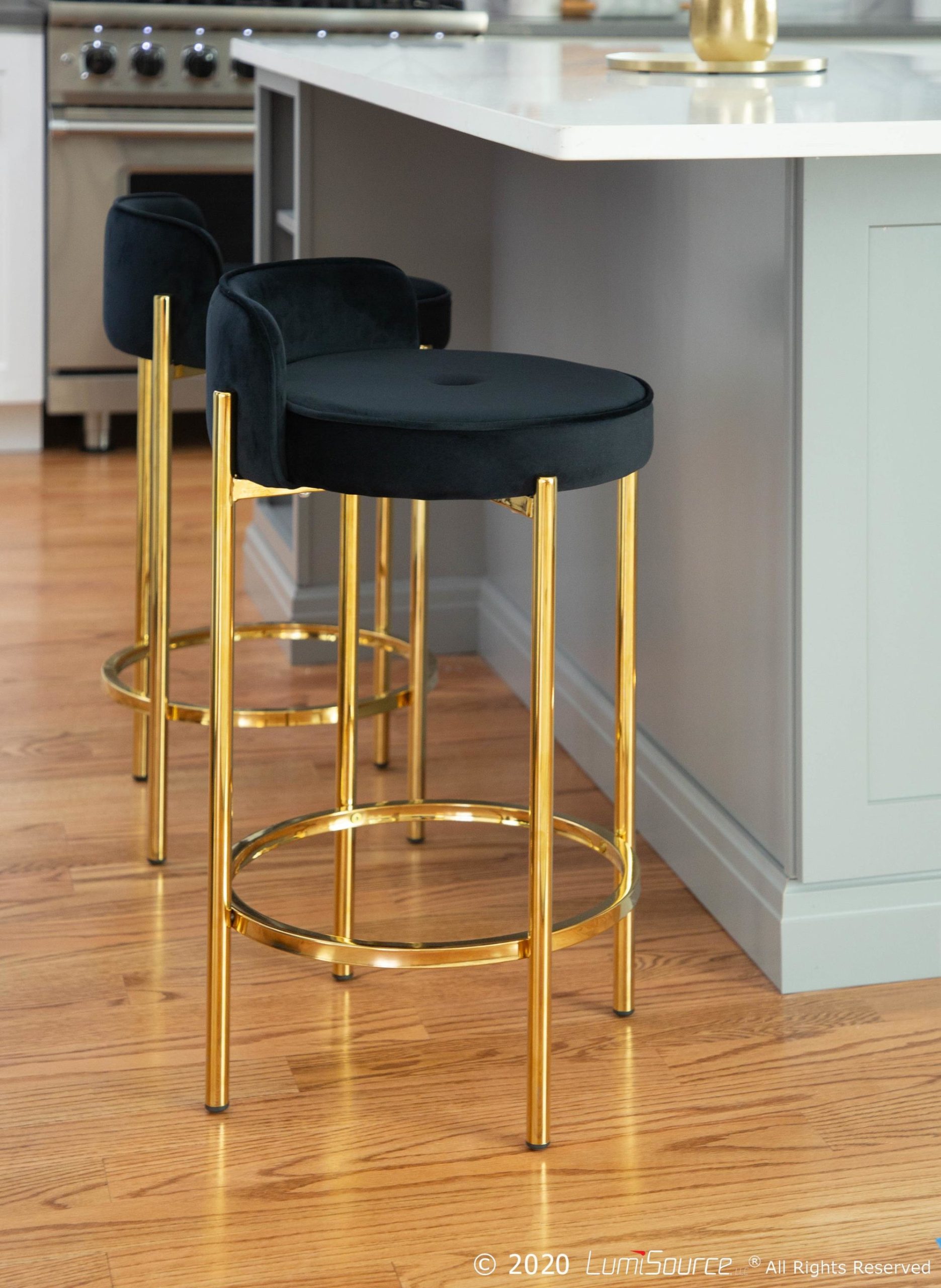 Experience the luxurious feel of the rich velvet upholstered seat and backrest, complete with stylish tufting and plush padding. The luminous gold metal base provides a sleek and modern contrast, making this counter stool a perfect addition to any glam area. Get ready to transform your space with this eye-catching piece!