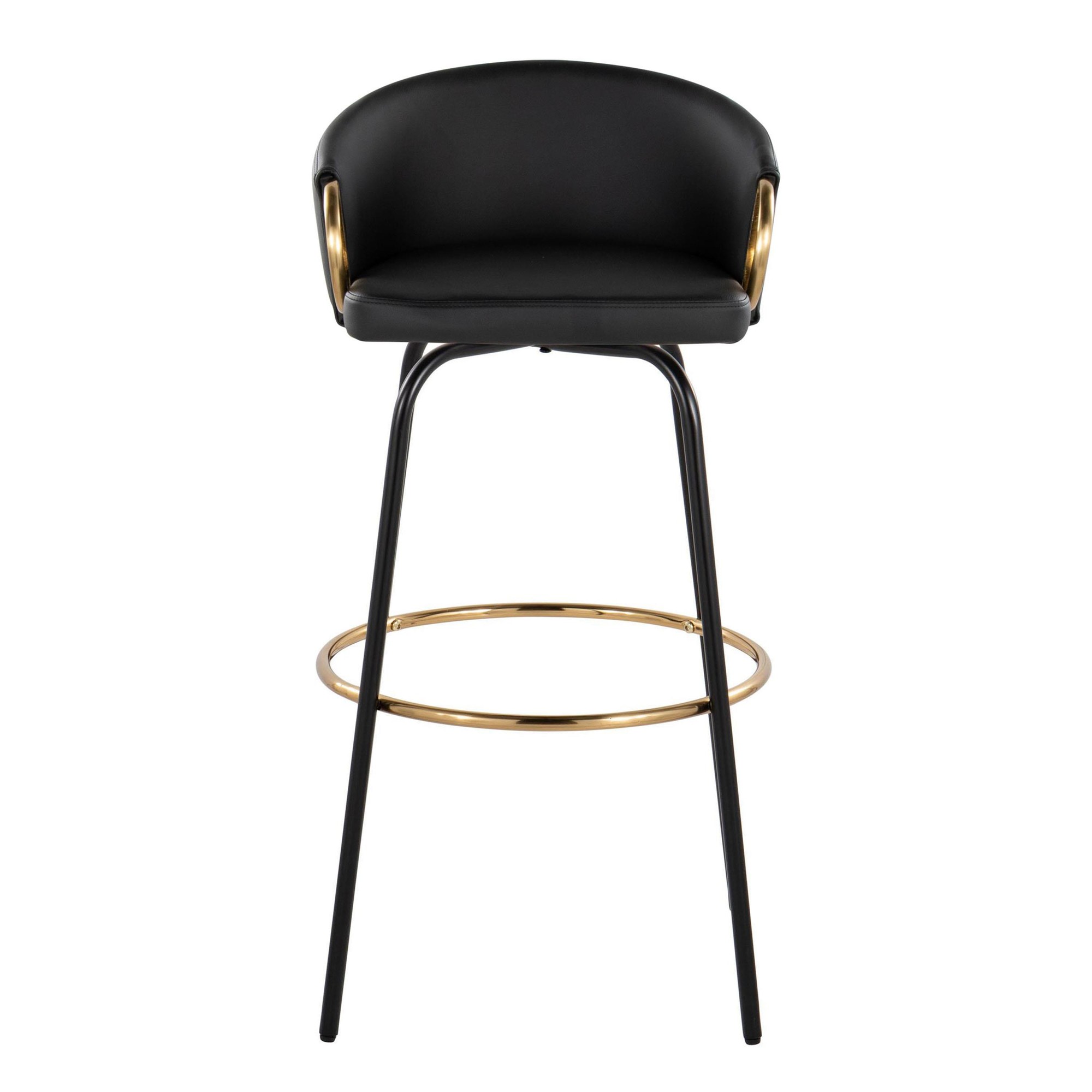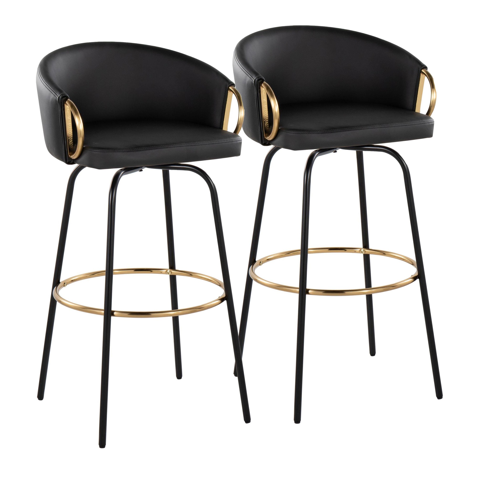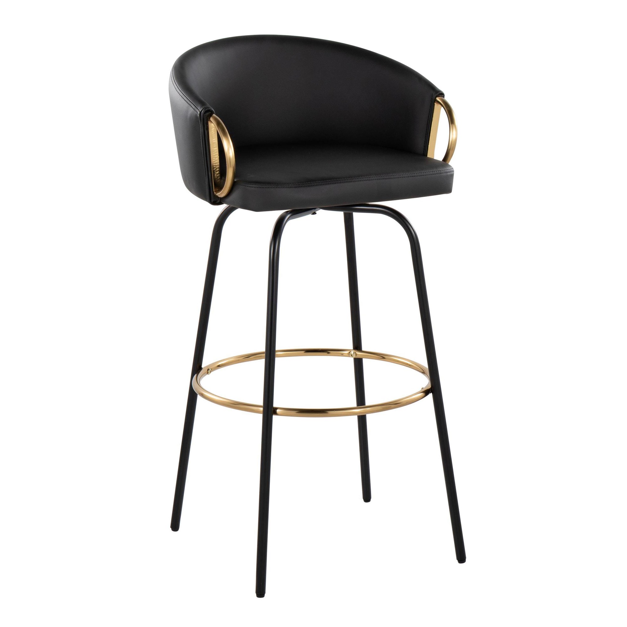 The Claire Fixed-Height Barstool boasts a unique design that brings chic, modern style to your bar area. Its rounded, low backrest, sleek metal armrests, and frame make it a perfect addition to any contemporary space. Enjoy smooth swivel capability and plush faux leather upholstery for ultimate comfort.
