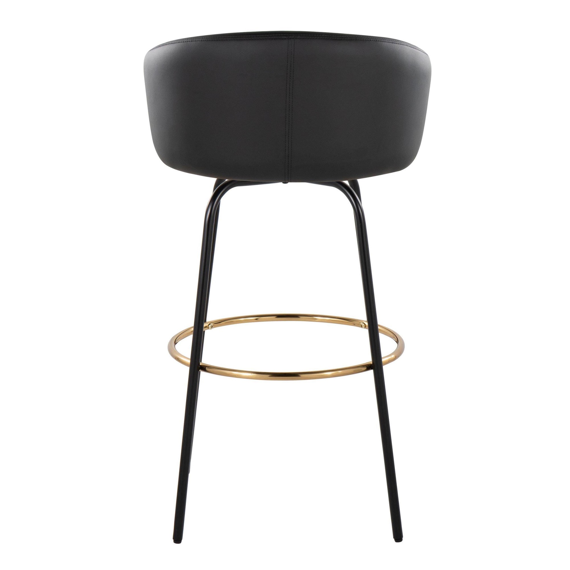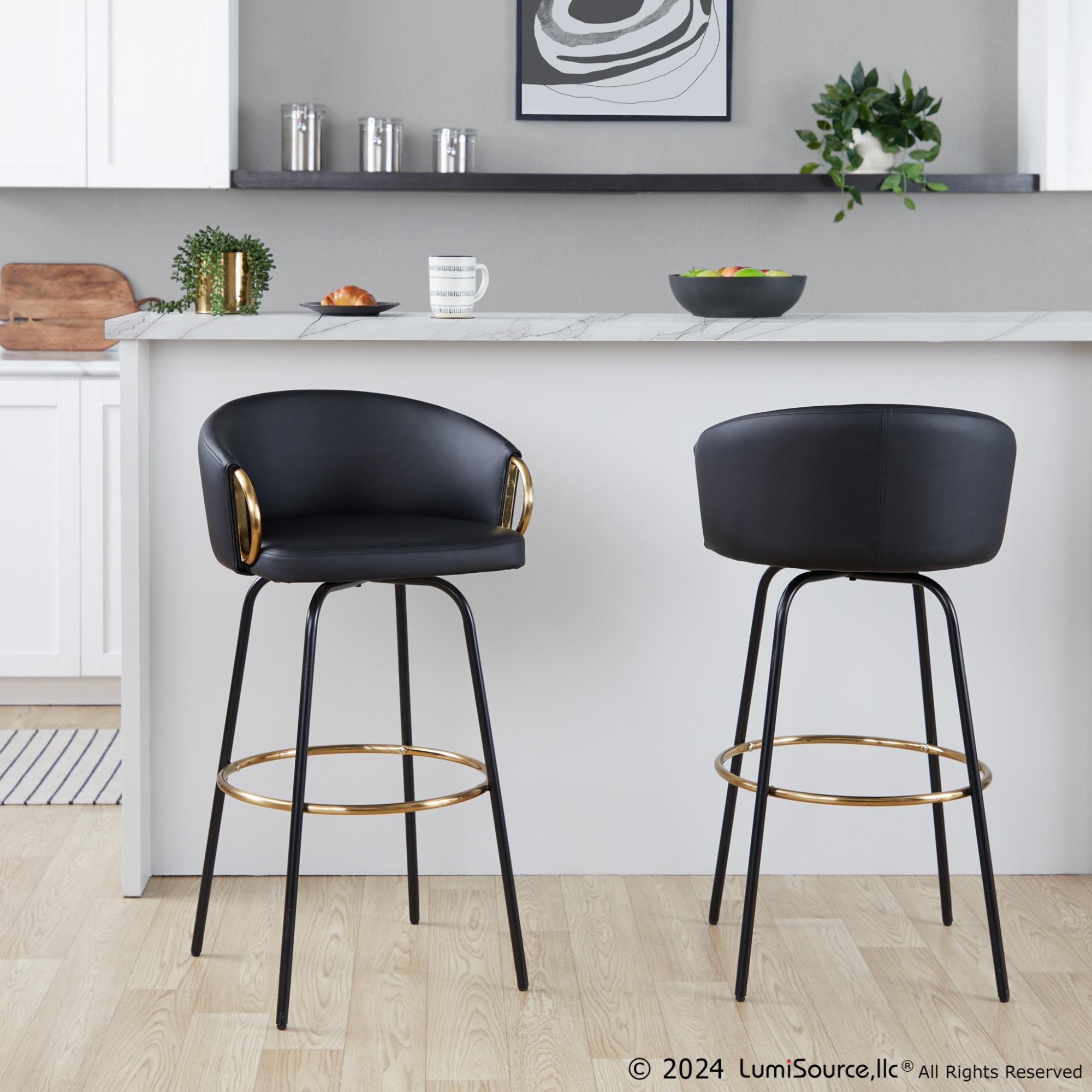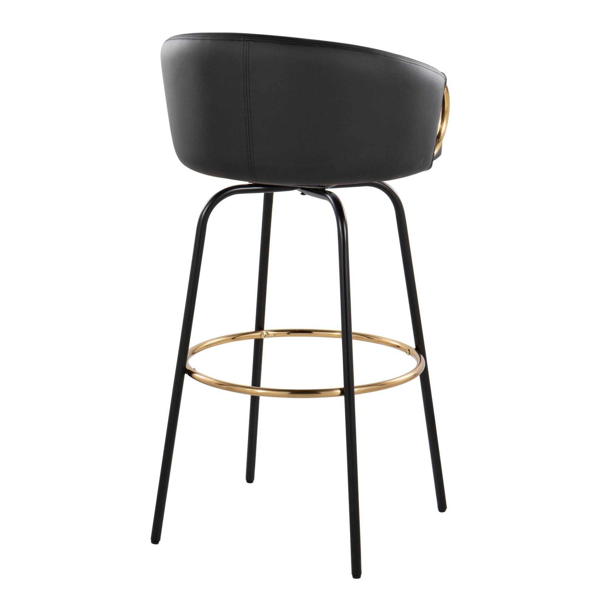 The Claire Fixed-Height Barstool boasts a unique design that brings chic, modern style to your bar area. Its rounded, low backrest, sleek metal armrests, and frame make it a perfect addition to any contemporary space. Enjoy smooth swivel capability and plush faux leather upholstery for ultimate comfort.