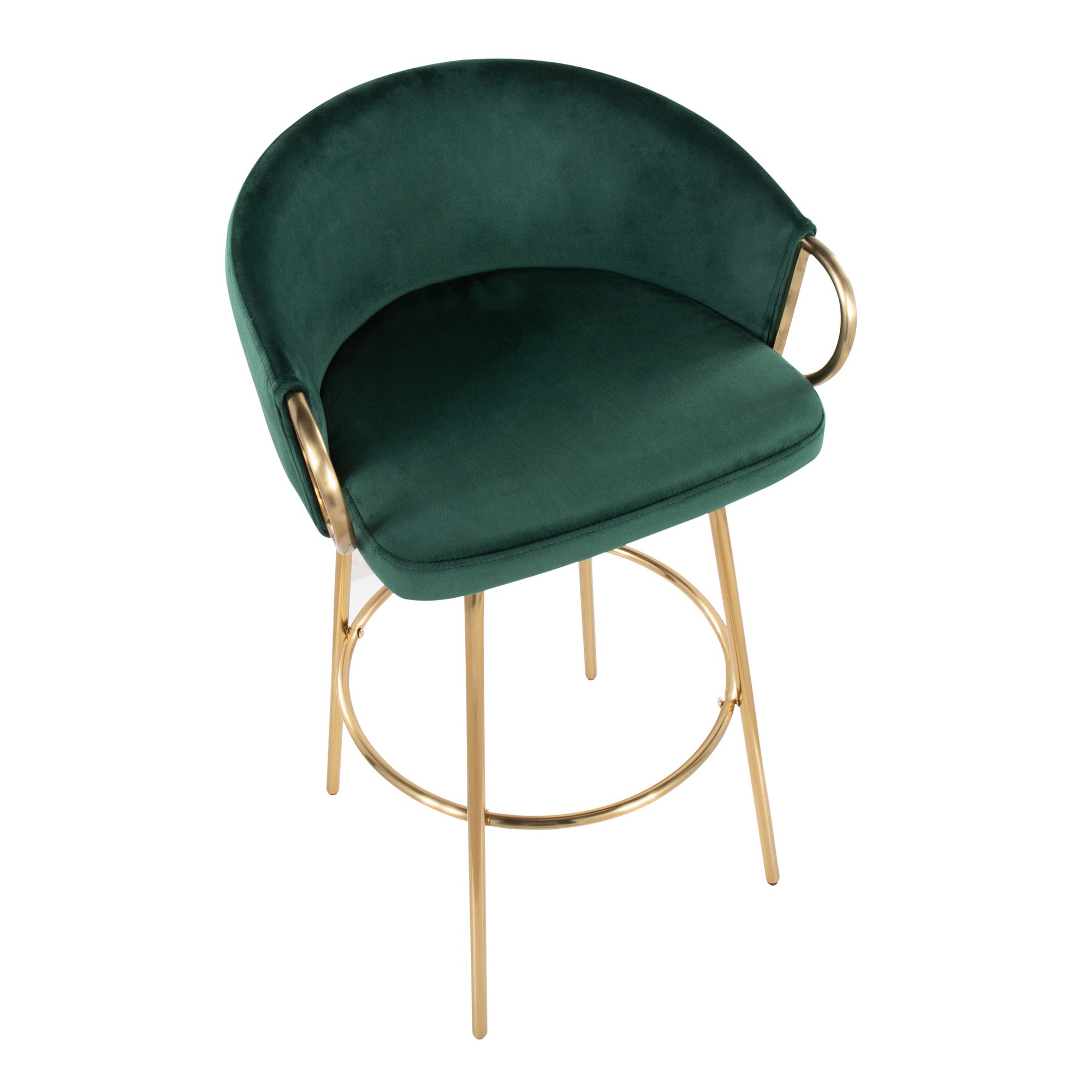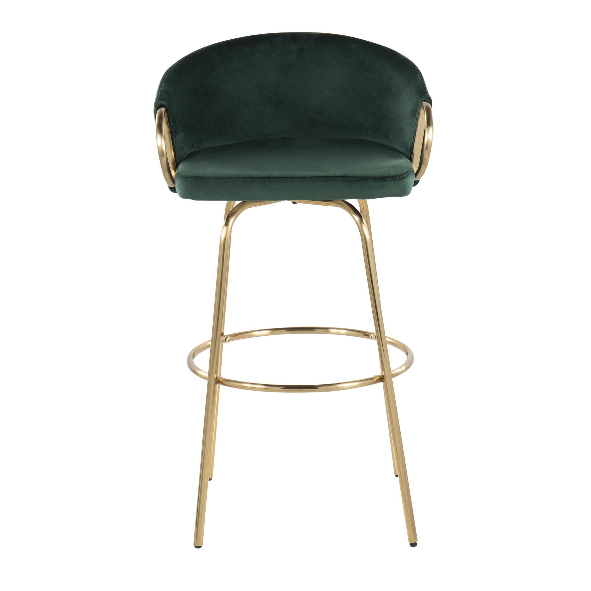 The Claire 30 Gold Green Velvet Contemporary Bar Stools will infuse chic, modern style into your space! These stools feature a unique design with a rounded, low backrest, sleek gold armrests, and a matching gold metal frame. Perfect for any contemporary bar area, the lush velvet upholstery and smooth swivel capability offer both comfort and style. Available in a bold green color, these bar stools are sure to make a statement.