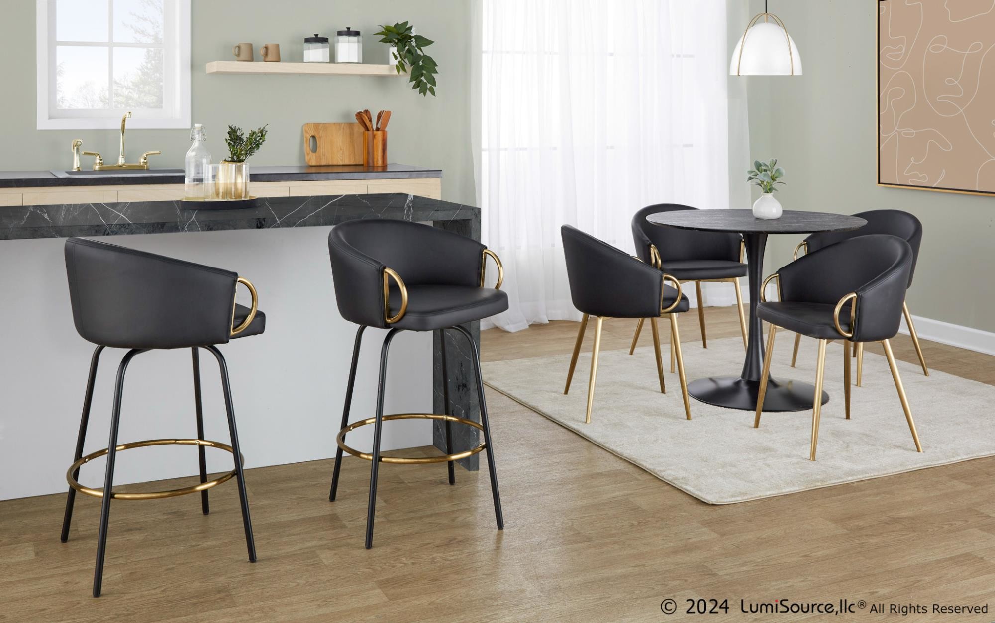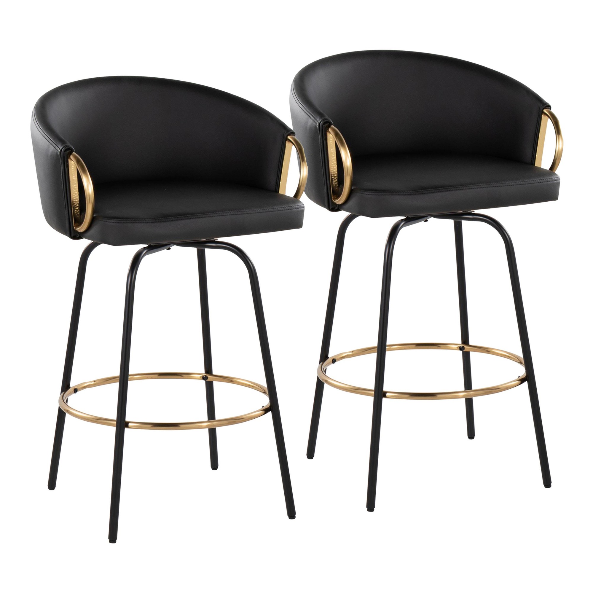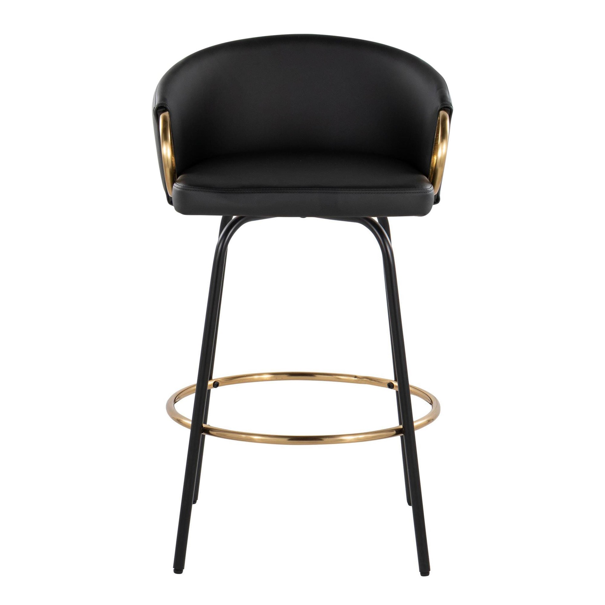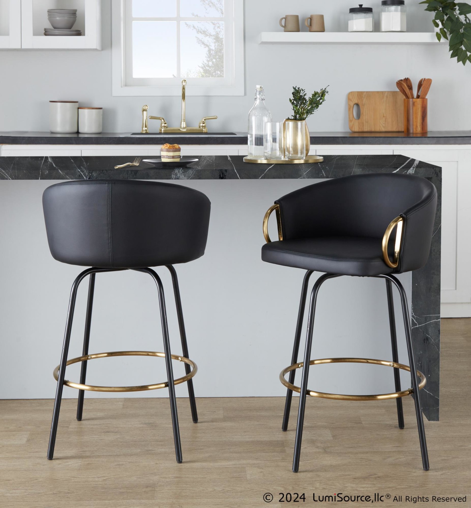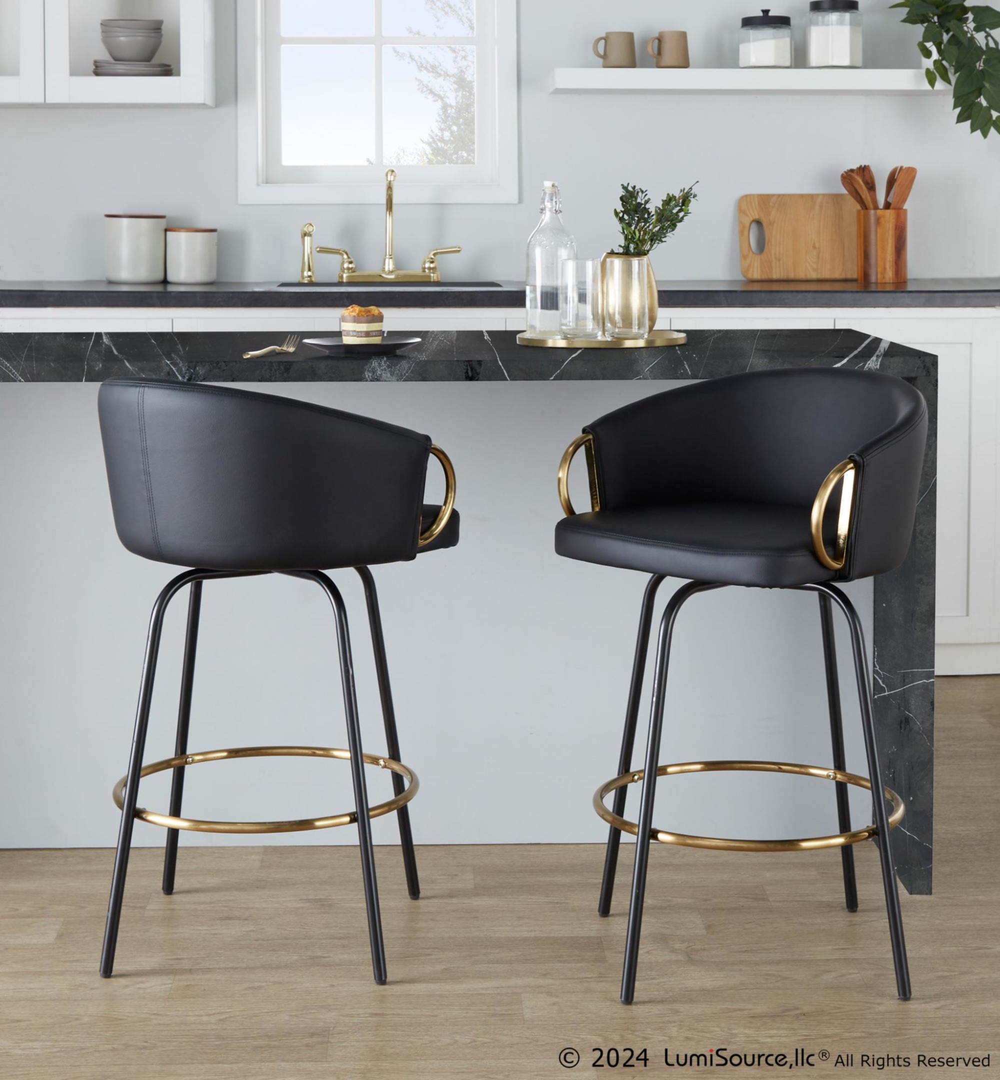 Elevate your bar area with the Claire Black Faux Leather Contemporary 26-Inch Counter Stools! These stools aren’t just seating; they’re a statement of chic, modern style. Featuring a rounded, low backrest and sleek metal armrests, these stools will be the envy of all your guests. Enjoy smooth swivel capability and plush faux leather upholstery for maximum comfort and style.