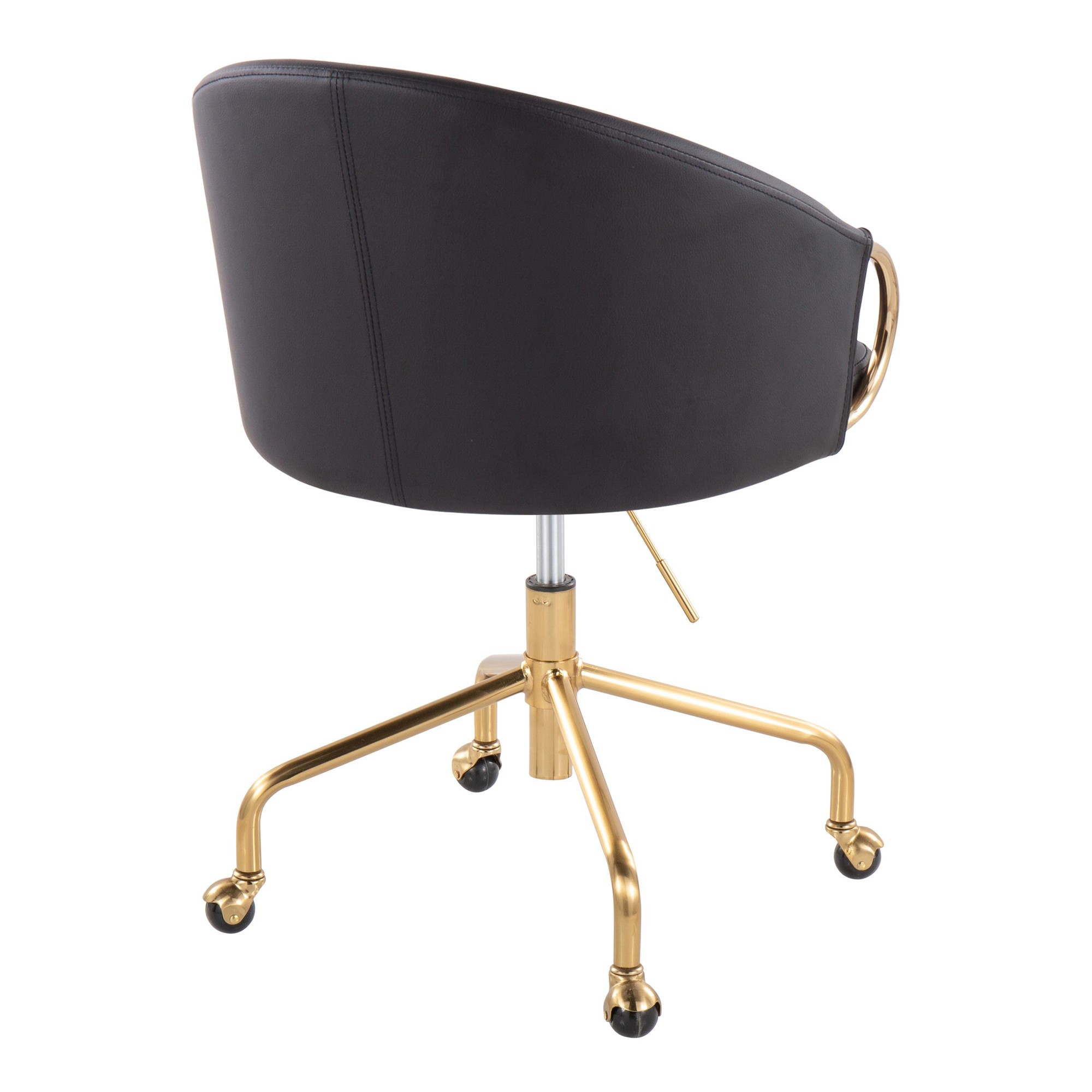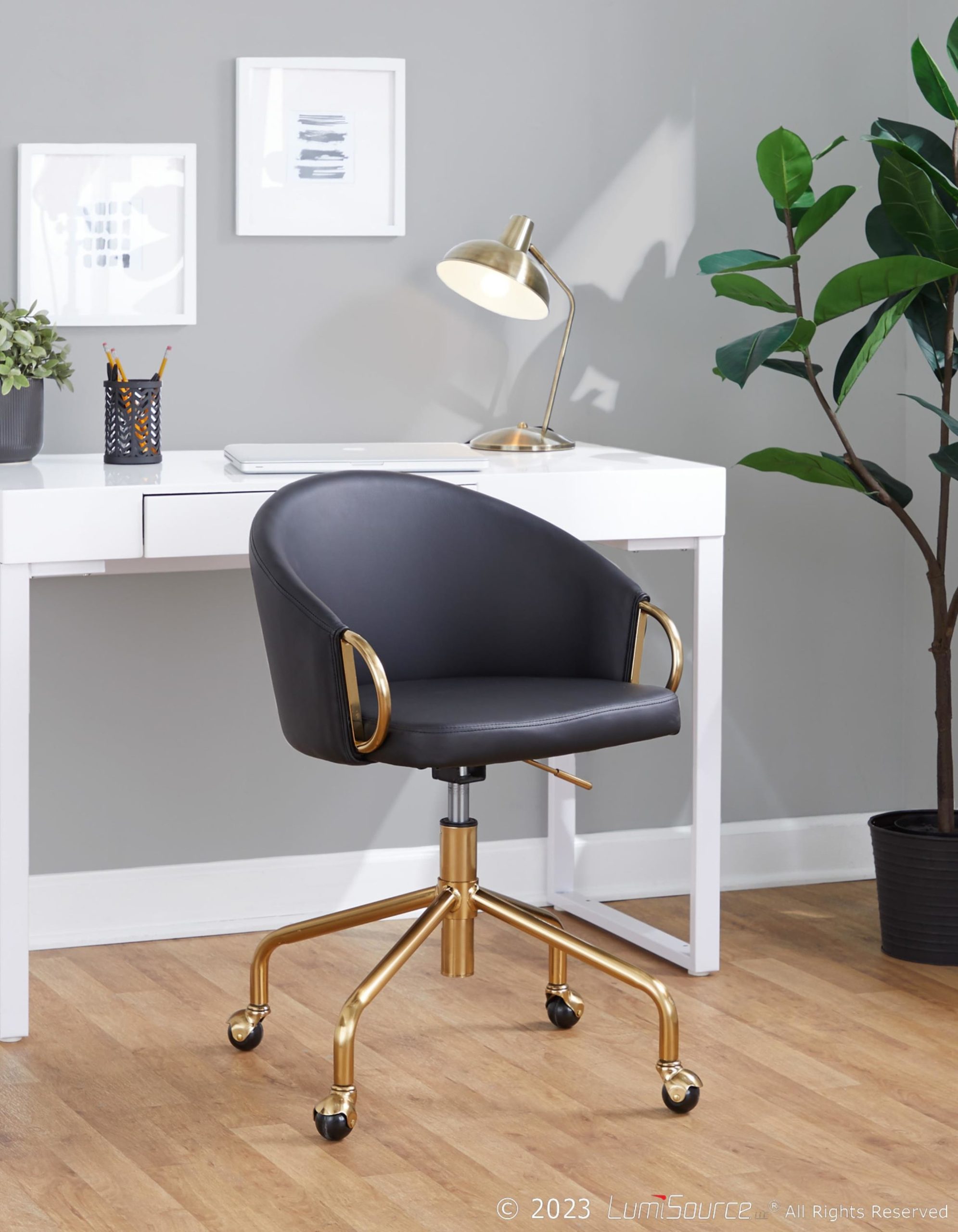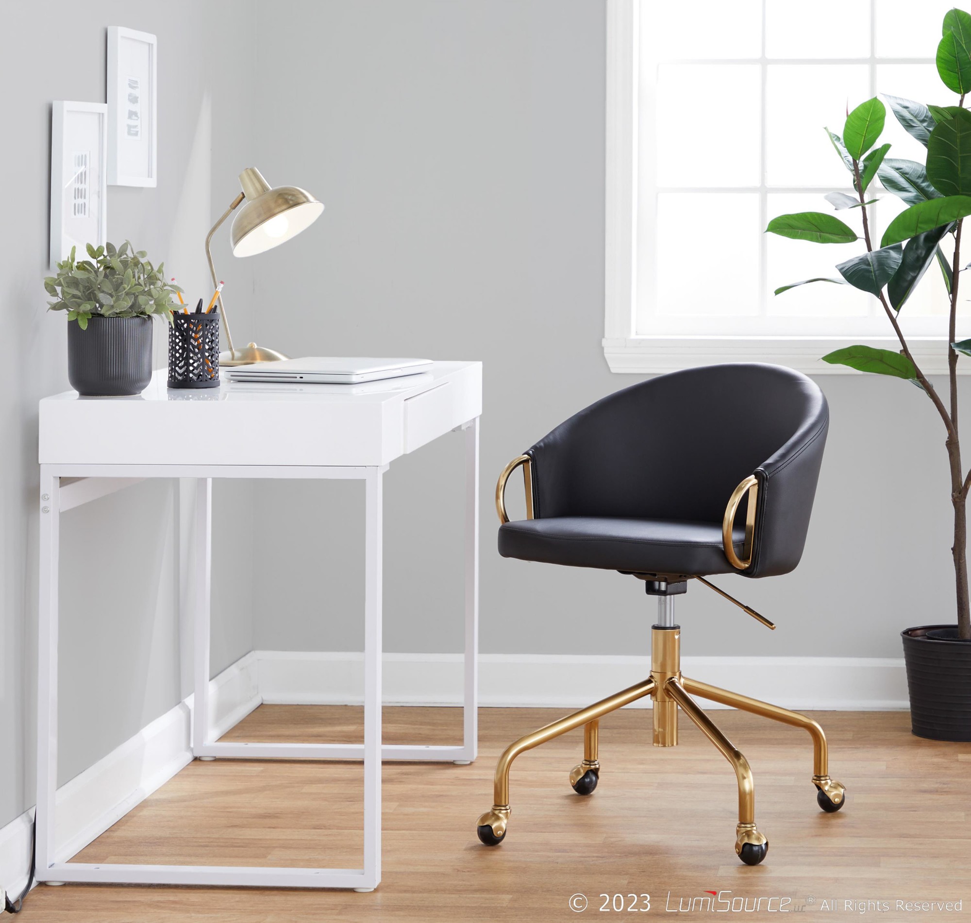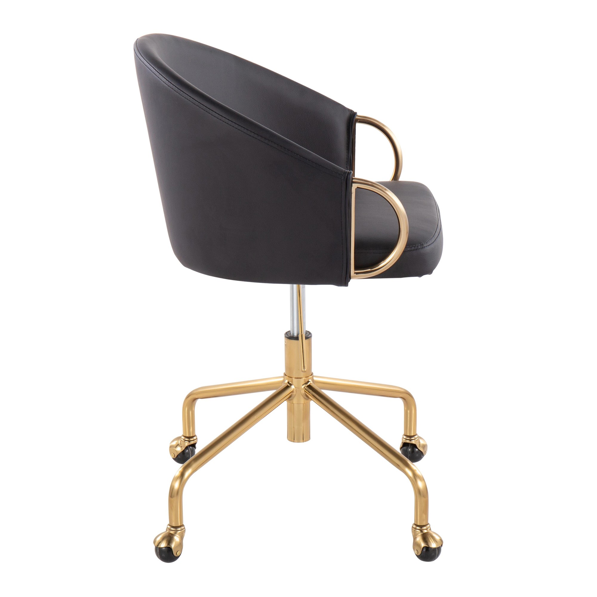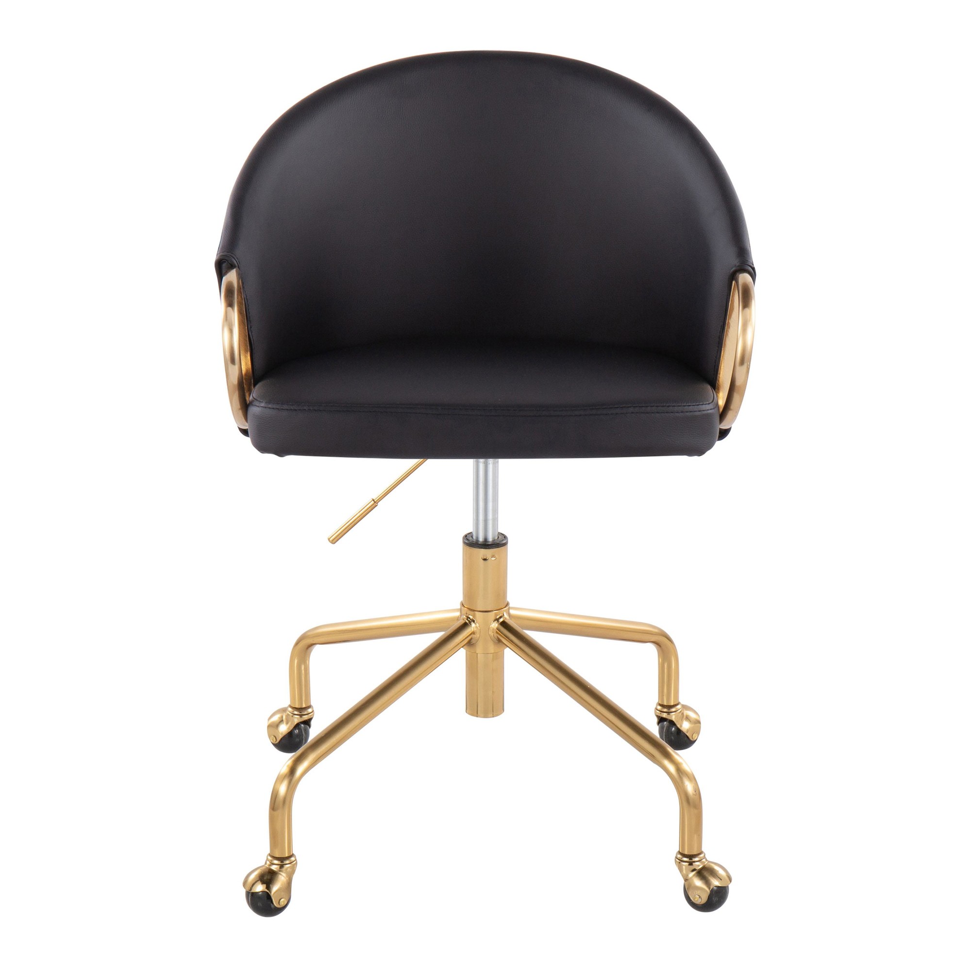 The Claire Task Chair brings chic, modern style to your workspace! Its unique design features a low, rounded backrest and sleek metal accent armrests. Enjoy adjustable height and a swivel function for customized comfort. The metal 4-star base with casters ensures easy mobility. Get ready to revamp your office with this stylish and functional chair! The padded seat and backrest will keep you comfortable while you work.