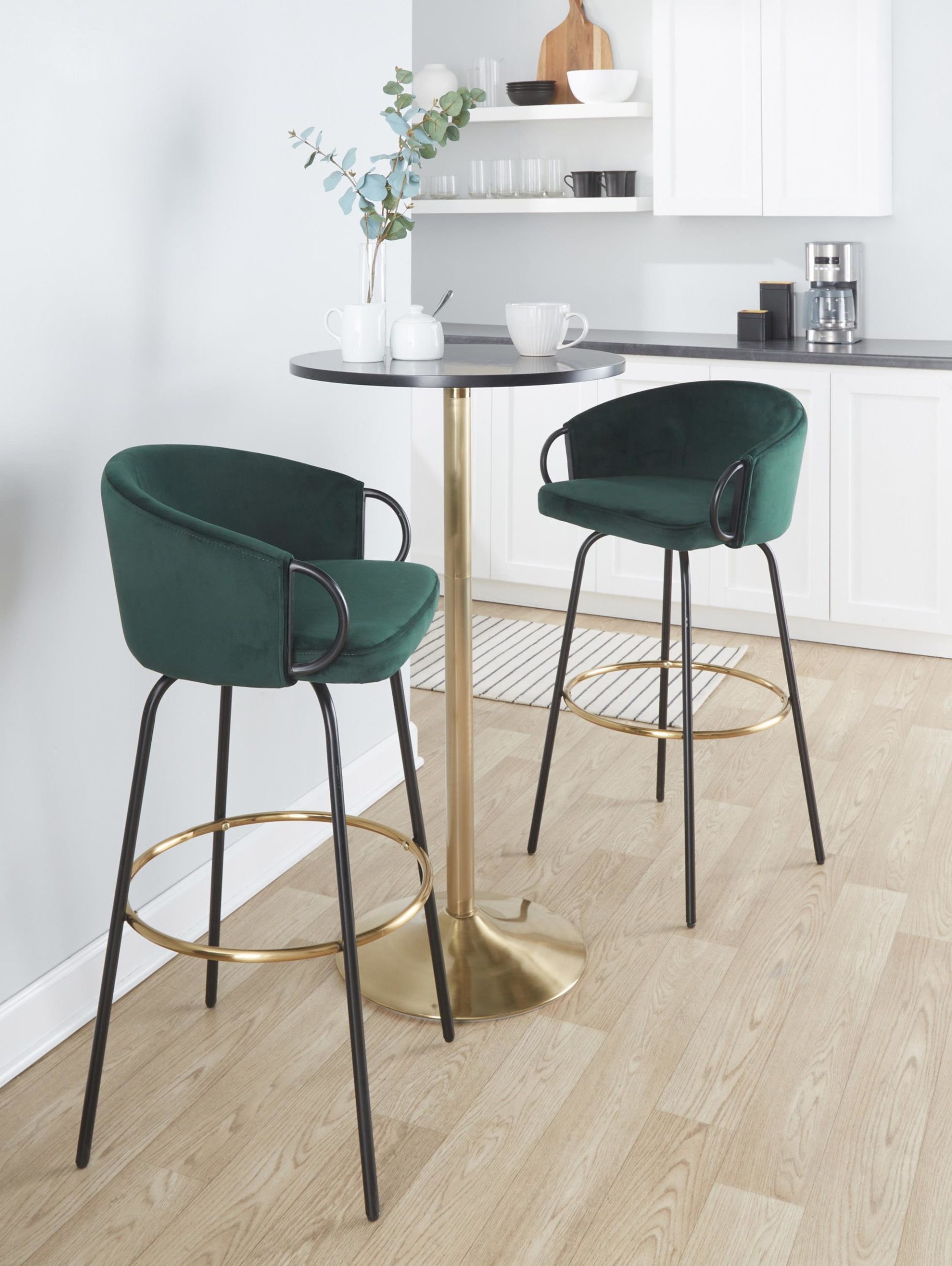 The Claire Emerald Velvet Gold Accent Contemporary Bar Stools offer chic, modern styling that will brighten any space. These bar stools feature a unique design with a rounded low backrest and sleek black armrests, complemented by a black metal frame. The smooth swivel capability and lush velvet upholstery provide both comfort and style, making them a perfect addition to your contemporary bar area. Sold in pairs, these stools are sure to enhance your home.