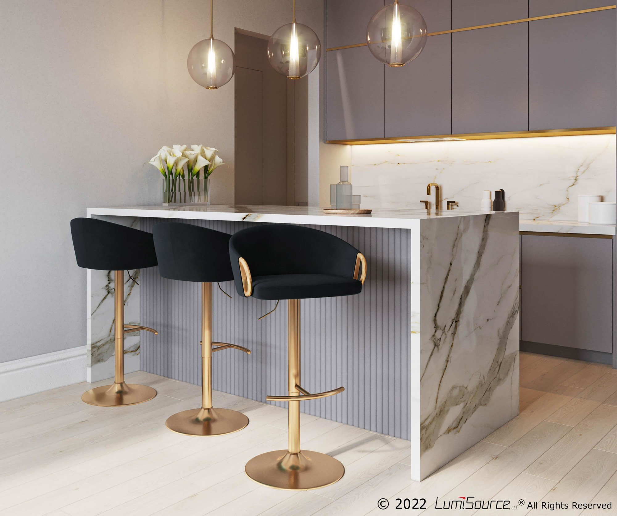The Claire Adjustable Bar Stools offer a touch of chic, modern style to any contemporary dining or bar area. These stools feature a low, rounded backrest, sleek gold armrests, and a matching gold metal base, creating a unique and eye-catching design. The lush velvet upholstery and smooth swivel capability provide both comfort and functionality, making these bar stools a perfect addition to your home.
