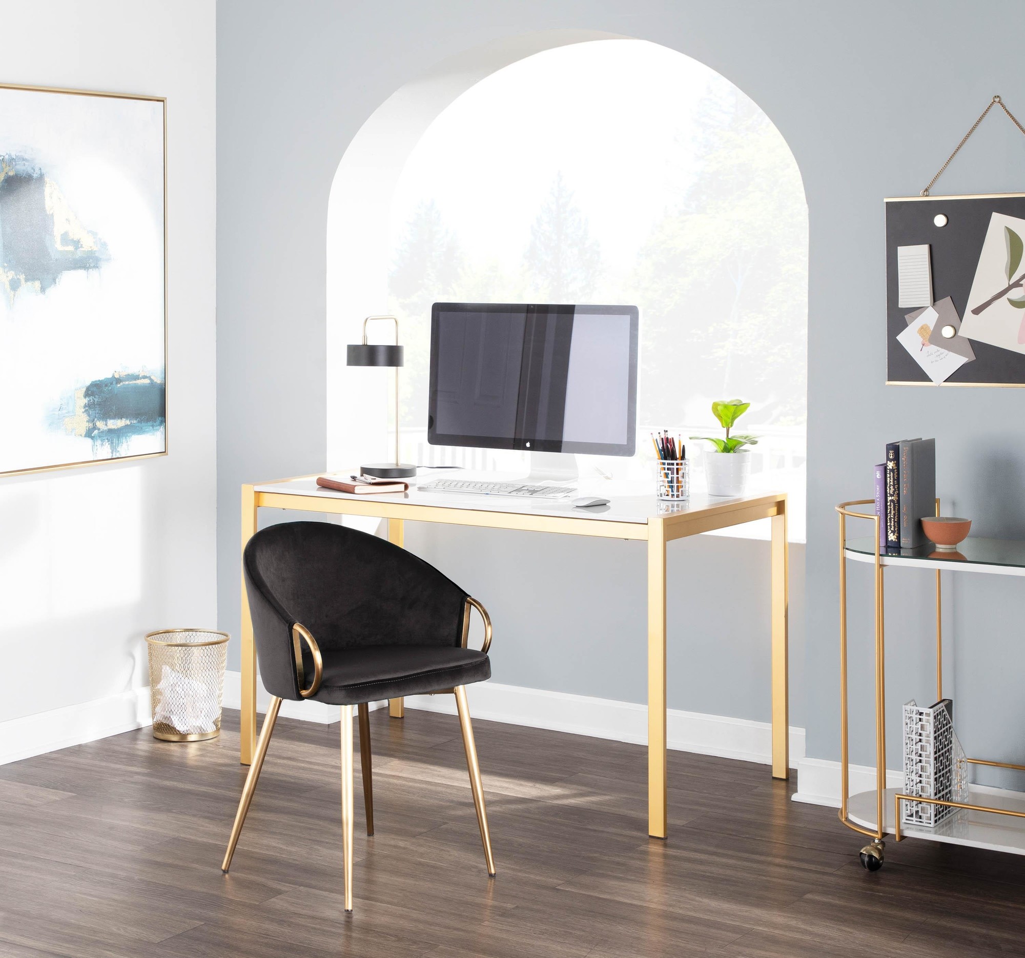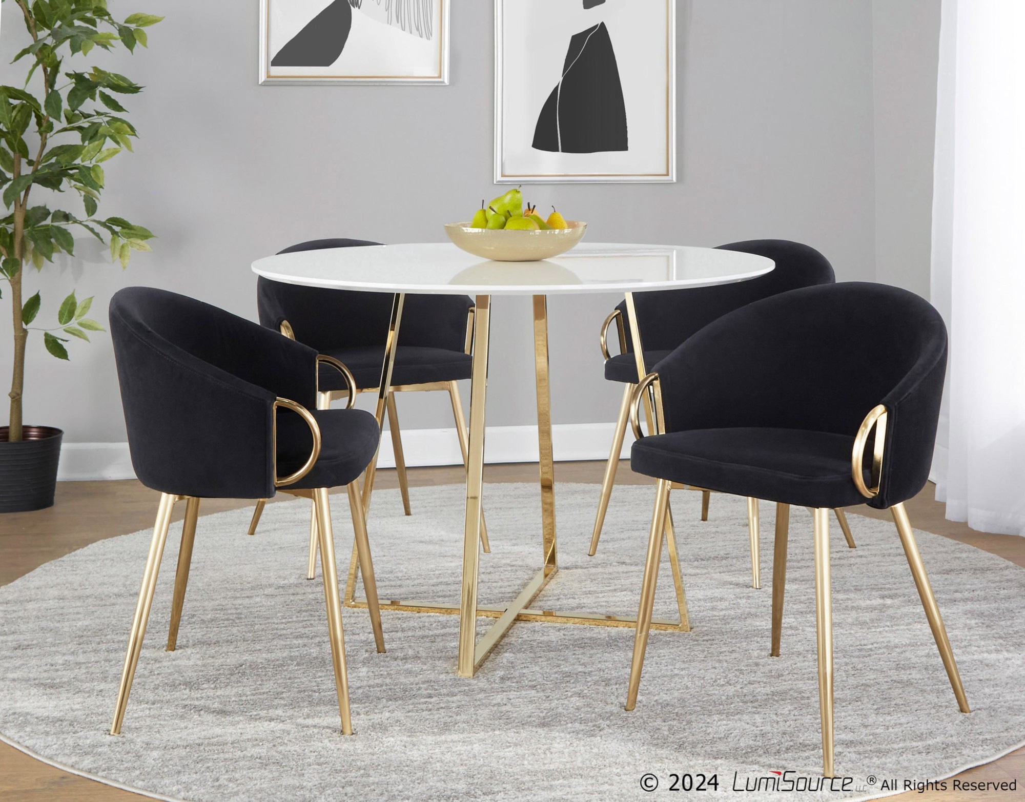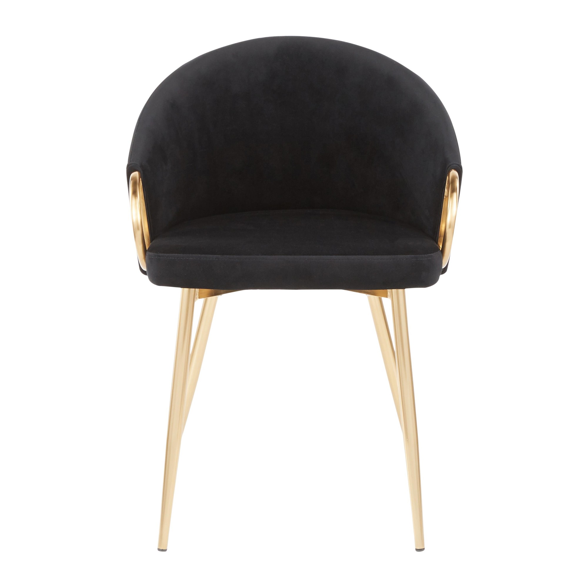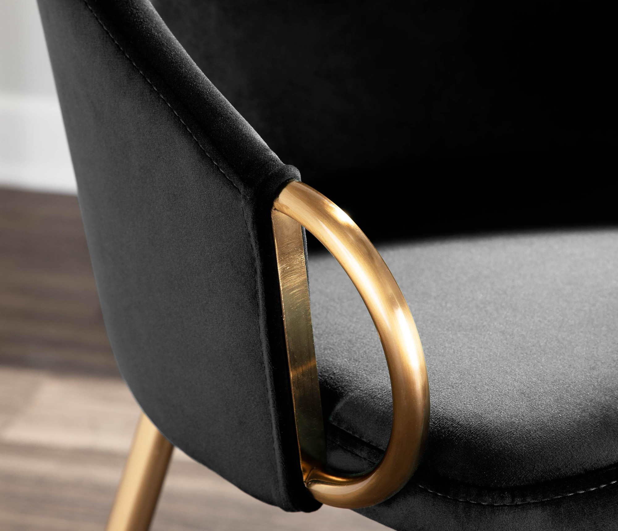 Add a touch of glam to your space with the Claire Accent Chair! Its chic, modern design features a rounded low backrest, stylish gold armrests, and a sleek gold metal frame. Upholstered in lush velvet, this chair is the perfect addition to your contemporary dining area or any space needing a touch of elegance.