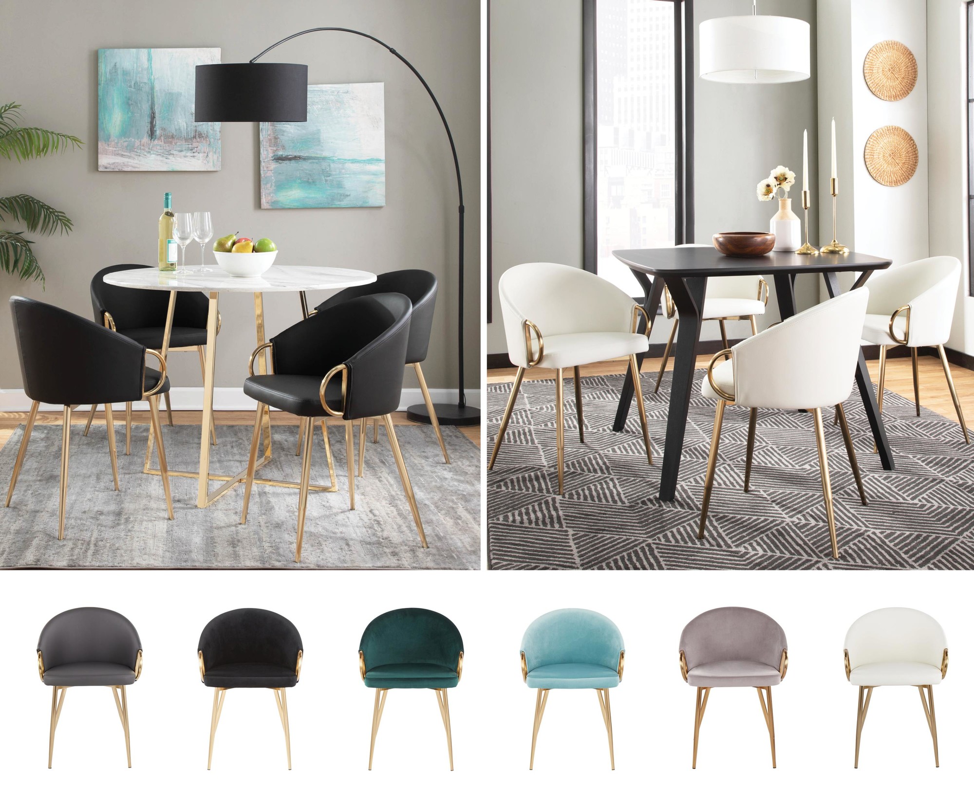 The Claire Chair brings chic modern style to any space. With its unique design, featuring a rounded low backrest and sleek gold armrests, this chair is the perfect addition to your contemporary dining area or as a stylish accent piece. Available in faux leather upholstery, the Claire Chair combines comfort and sophistication.