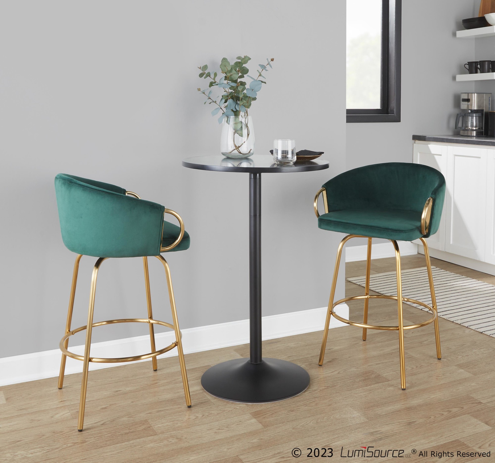 Elevate your man cave with the Claire Gold Steel Green Velvet Contemporary Counter Stools. These stools bring a touch of modern glam with a rounded, low backrest and sleek gold armrests. The gold metal frame complements the lush green velvet upholstery, adding a bold pop of color to your bar area. Each stool features a fixed counter height and a 360-degree swivel for easy conversation. Includes two counter stools. Enjoy the comfort and style these counter stools bring to your space. Dimensions: 23″L × 23″W × 35.25″H. Weight Limit: 250 lbs (each). Assembly Required: Yes. Material: Velvet Fabric, Painted Steel.
