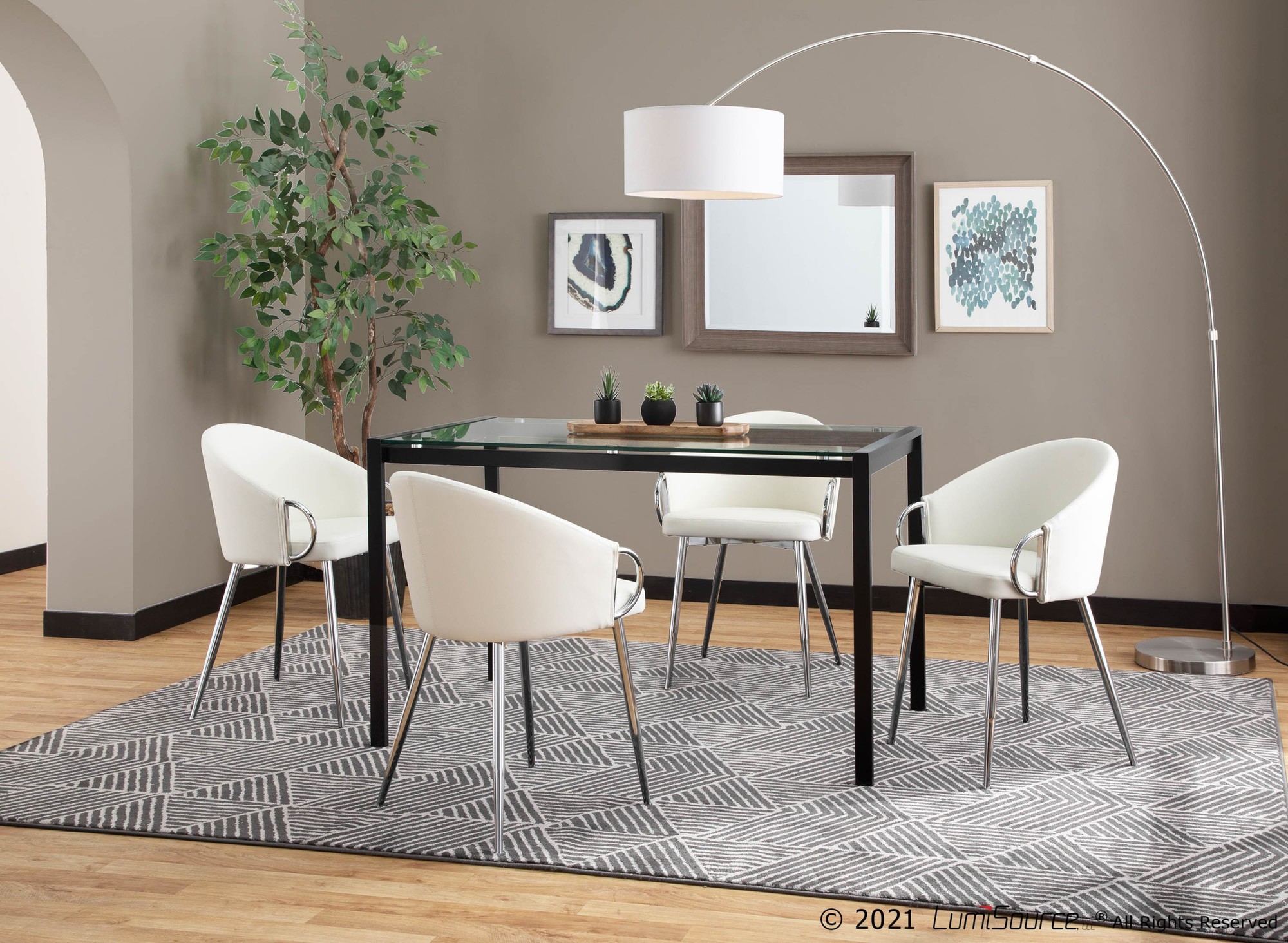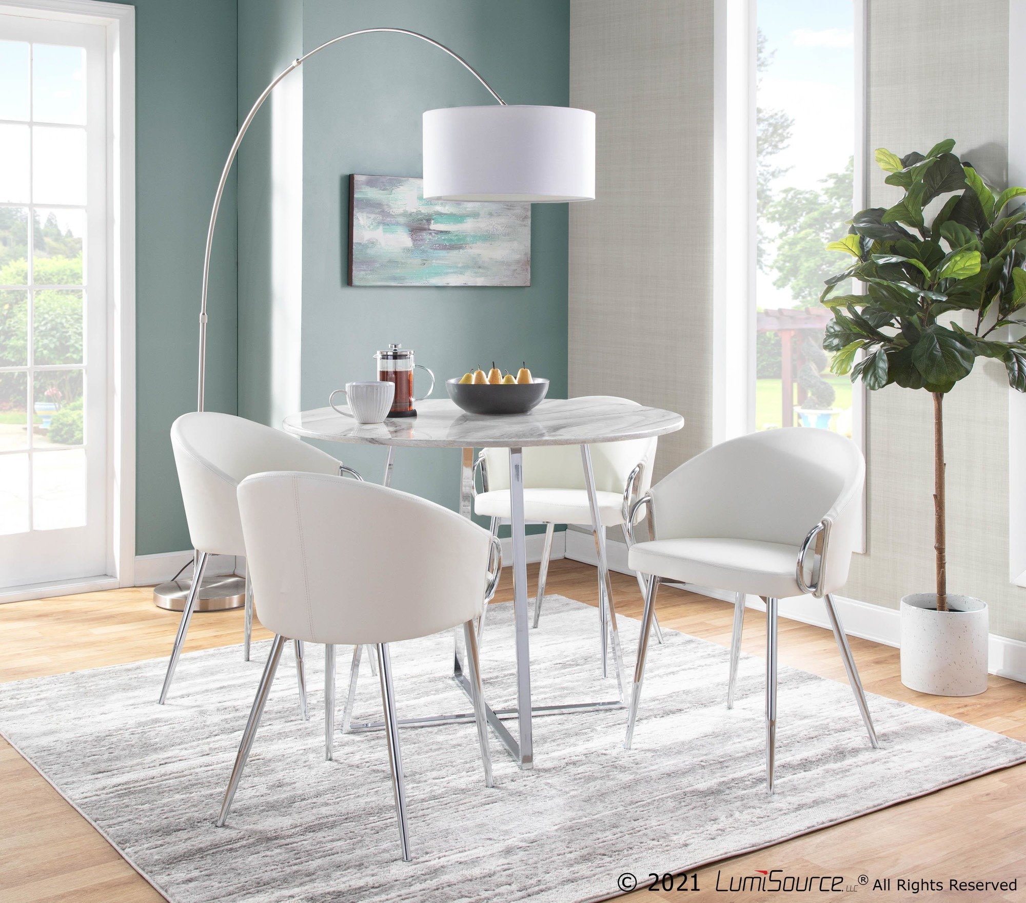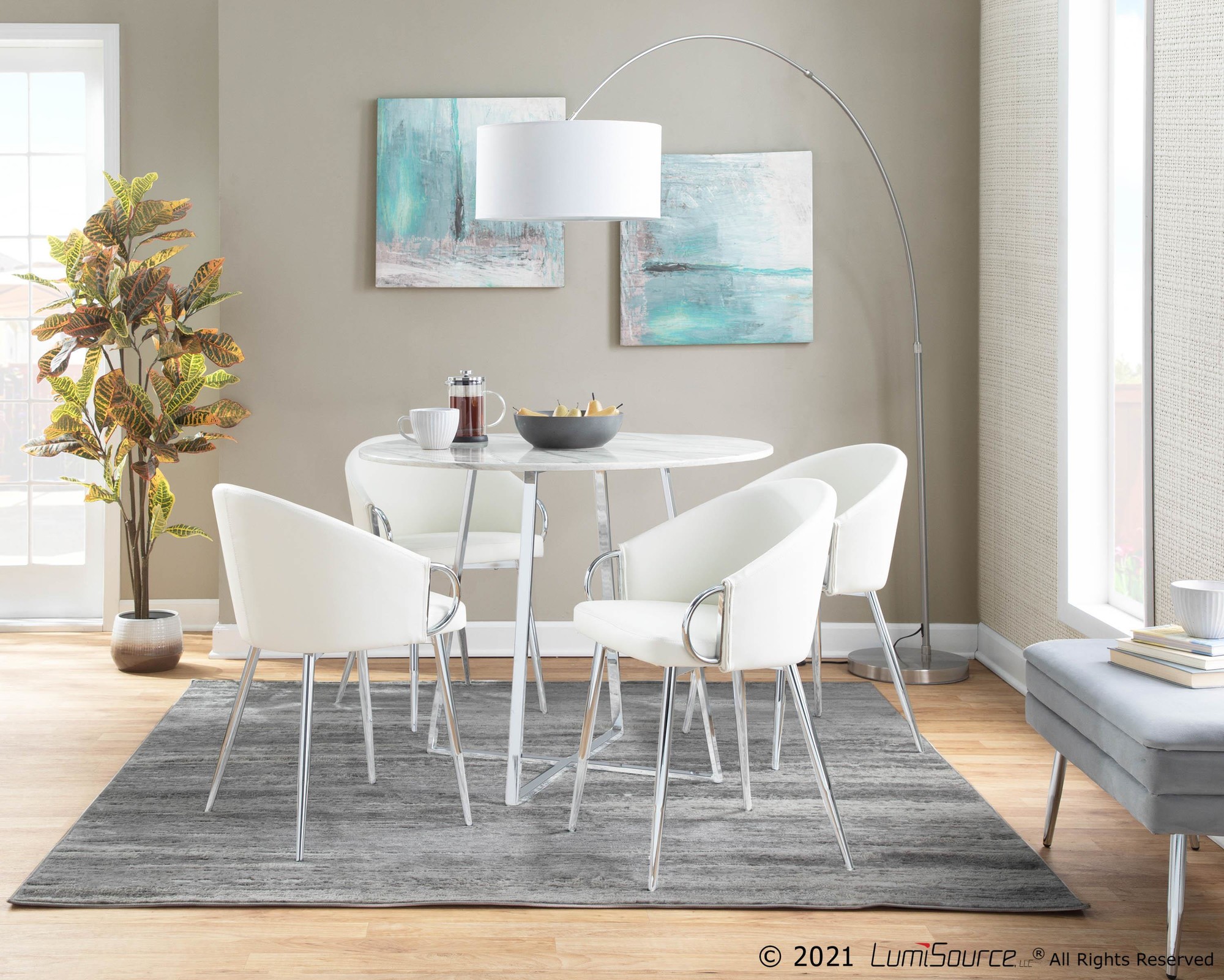 Add a touch of chic modern style to your dining or living space with the Claire Accent Chair. This chair features a unique design with a rounded, low backrest and sleek silver armrests and frame. Upholstered in smooth, white faux leather, it’s the perfect piece to brighten up any contemporary area.