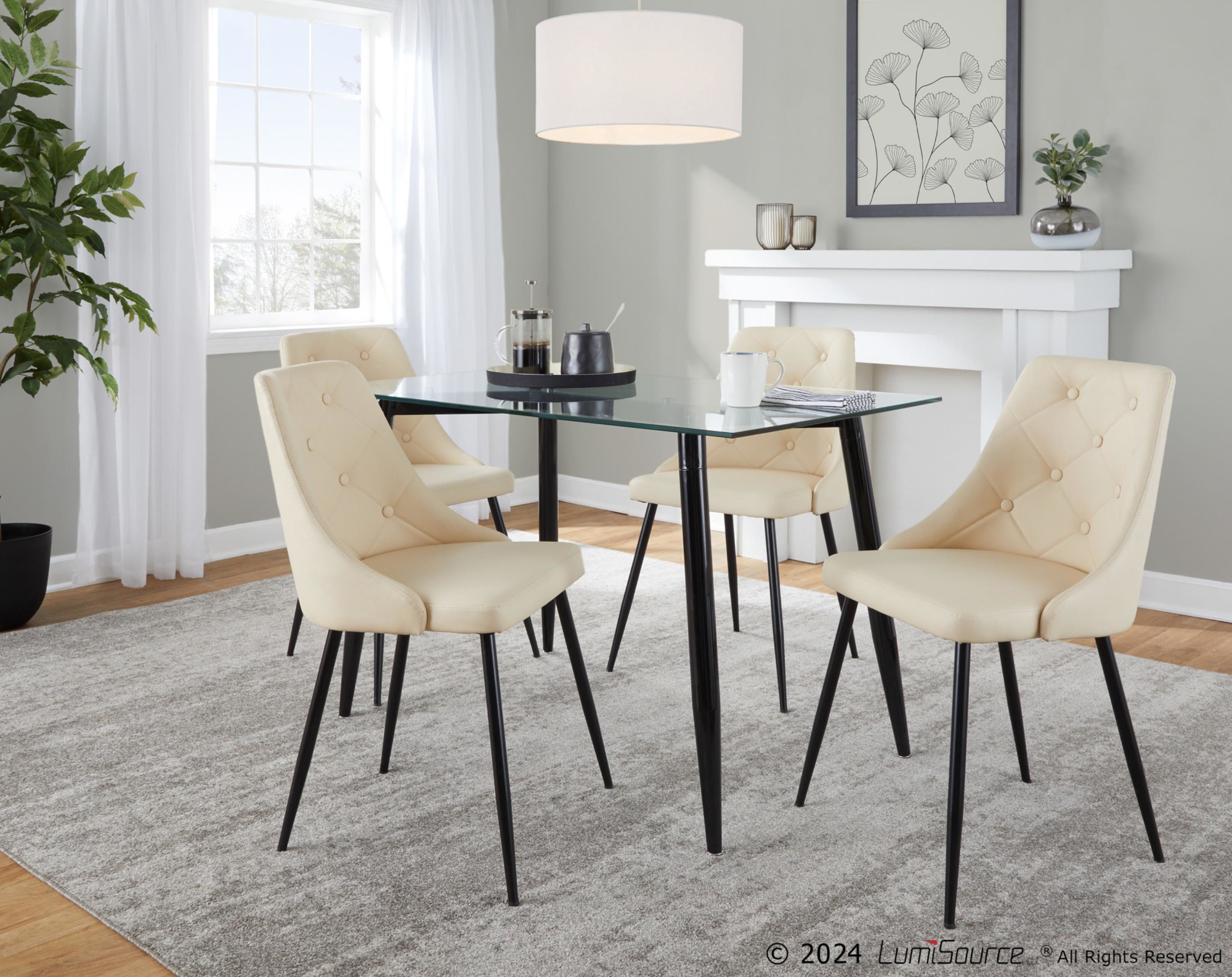 Upgrade your dining space with the sleek and stylish Clara-Giovani Dining Set. This 5-piece set provides a contemporary dining experience with a durable black metal frame and comfortable faux leather chairs. Perfect for any dining room, kitchen, or breakroom, this set comfortably seats four.
